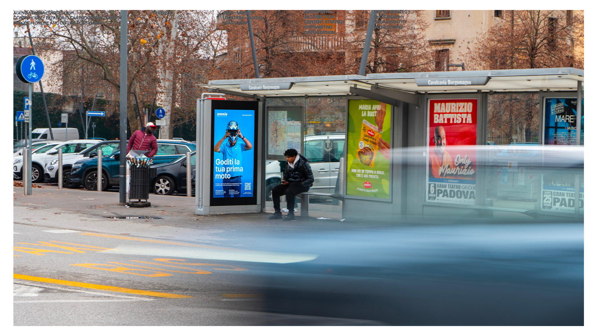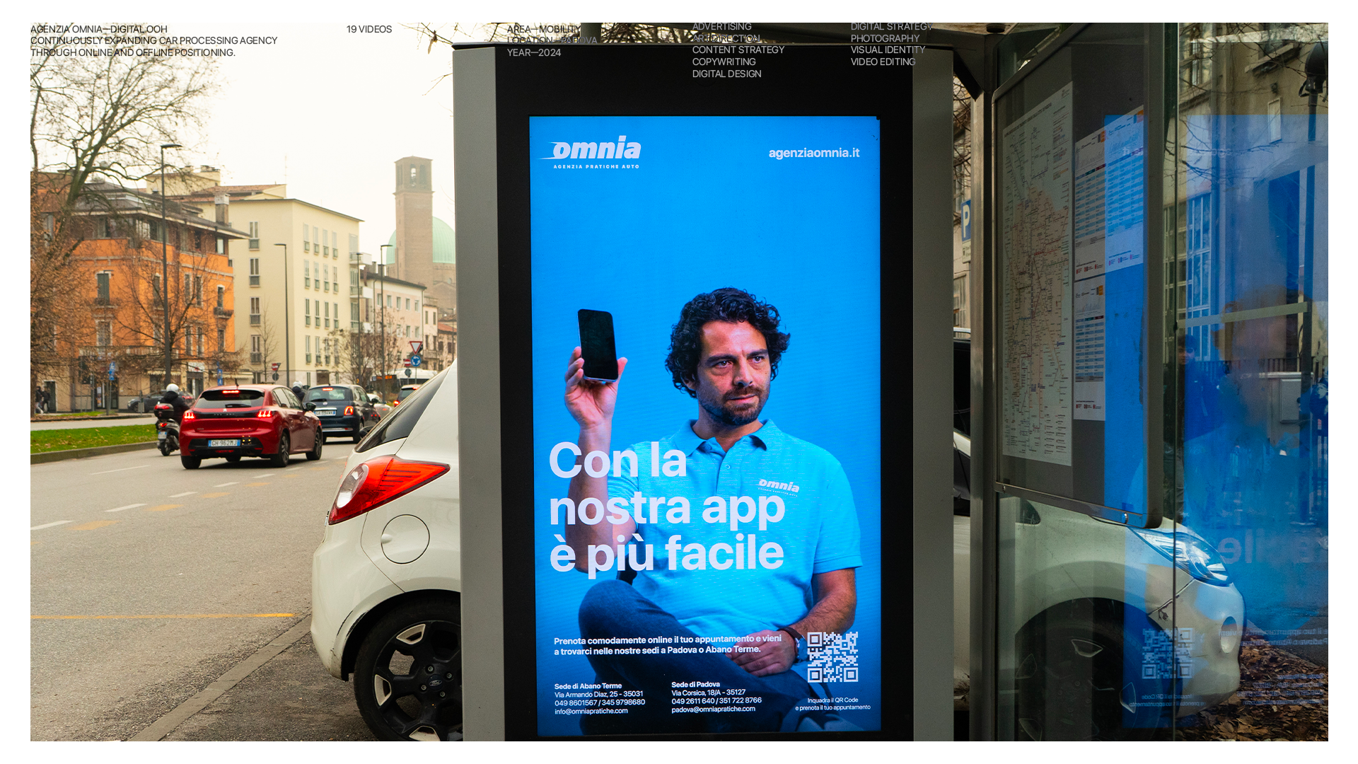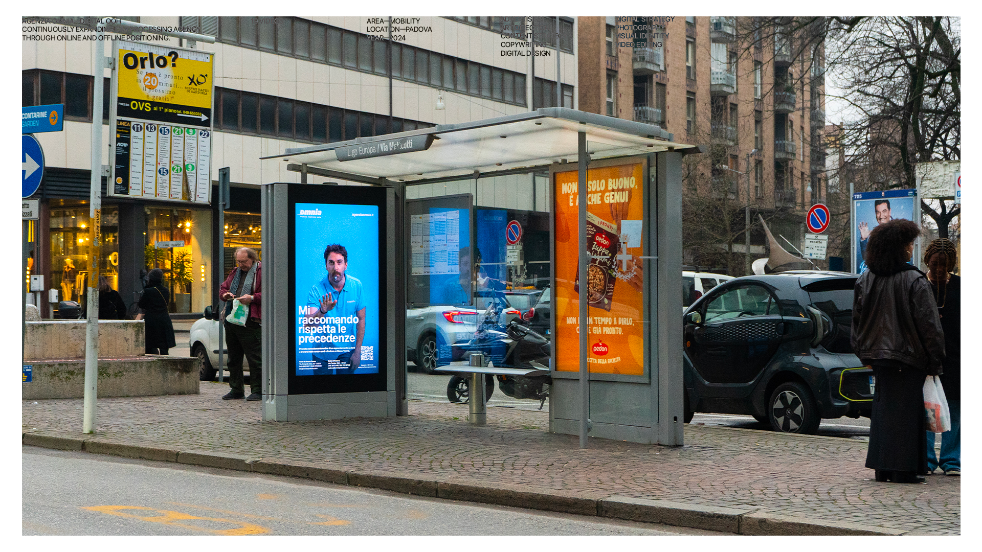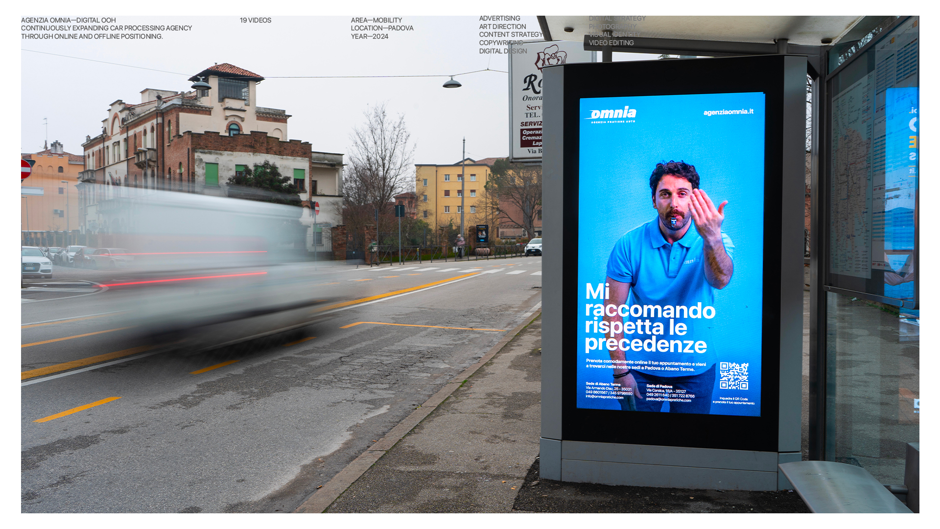 For Omnia Agency, a leading company in the automotive services sector based in Padua and Abano Terme, we developed an innovative Out of Home (OOH) campaign that blends digital content with the urban environment. The concept involves displaying personalized video content on 19 strategically placed LED walls at bus shelters across central Padua, creating a direct connection between the message and the surrounding urban space.