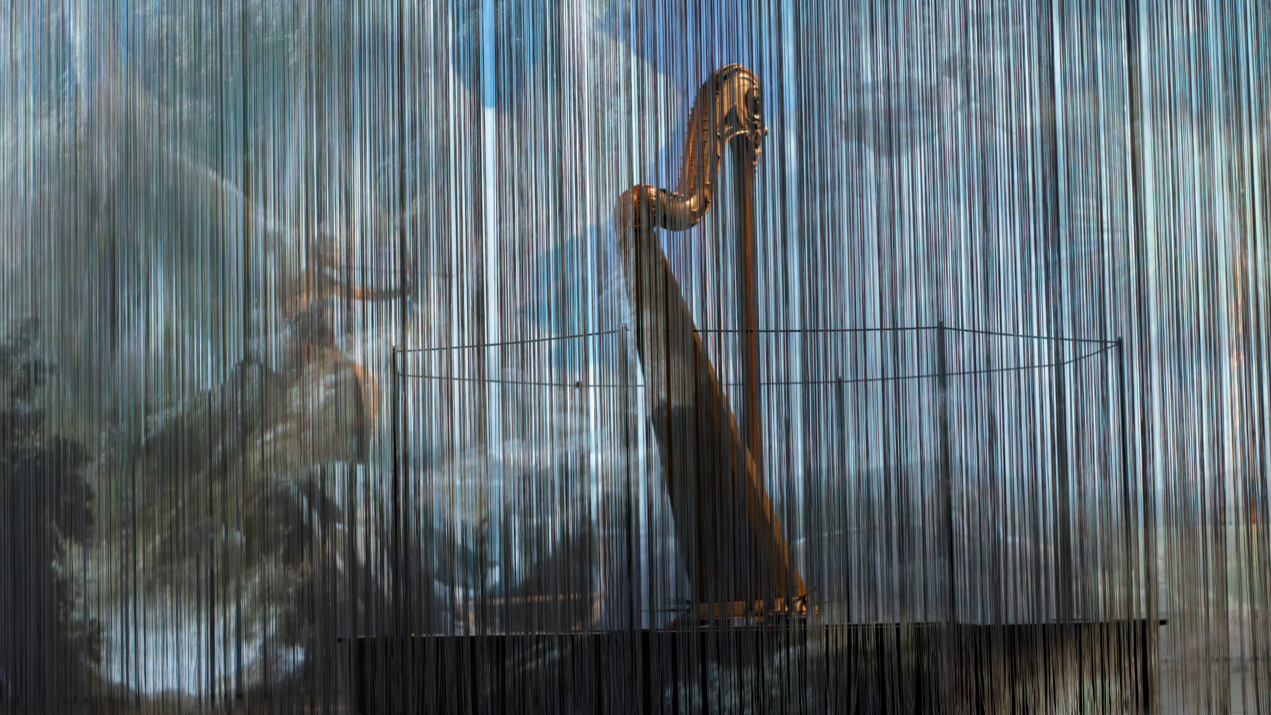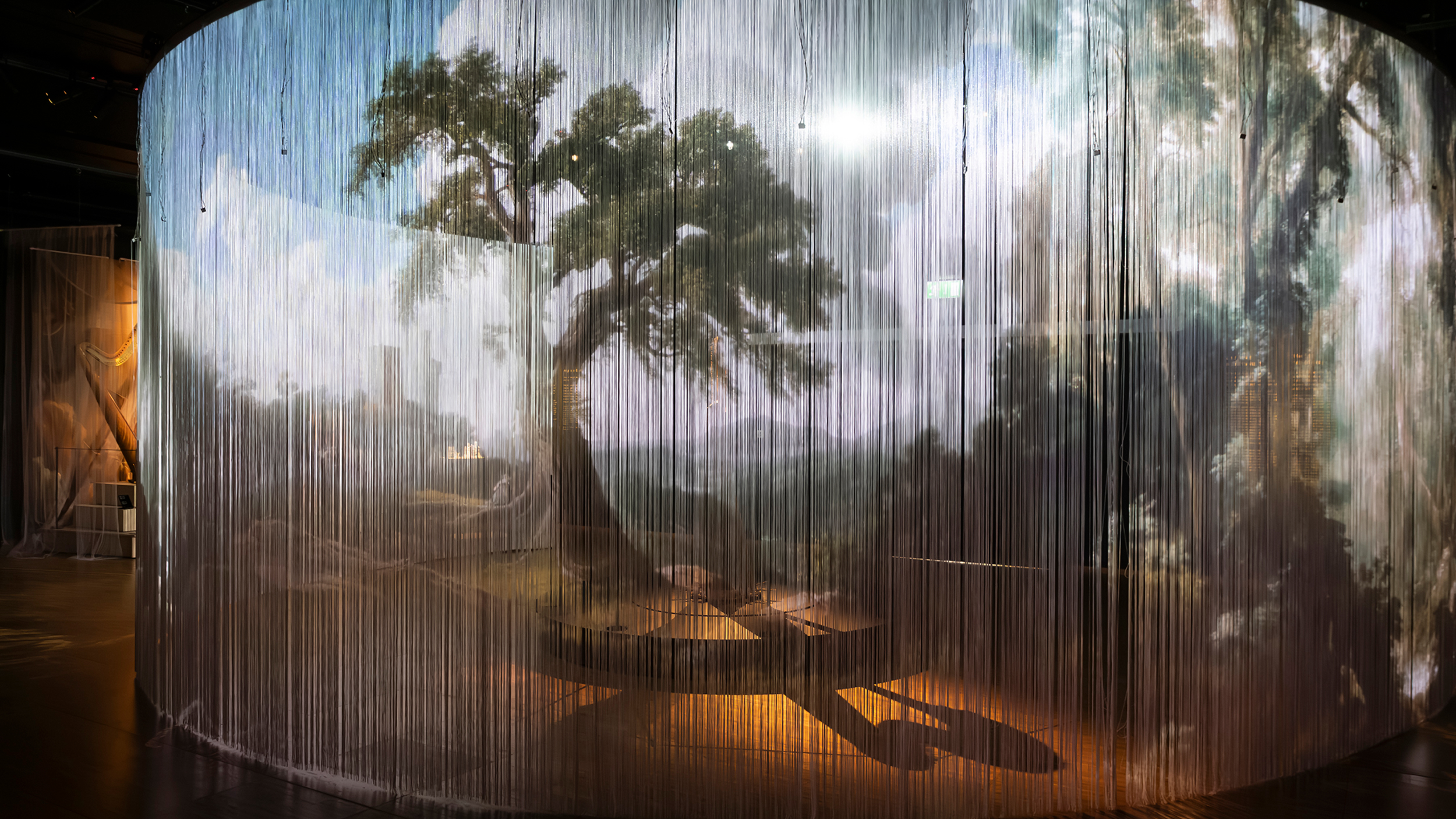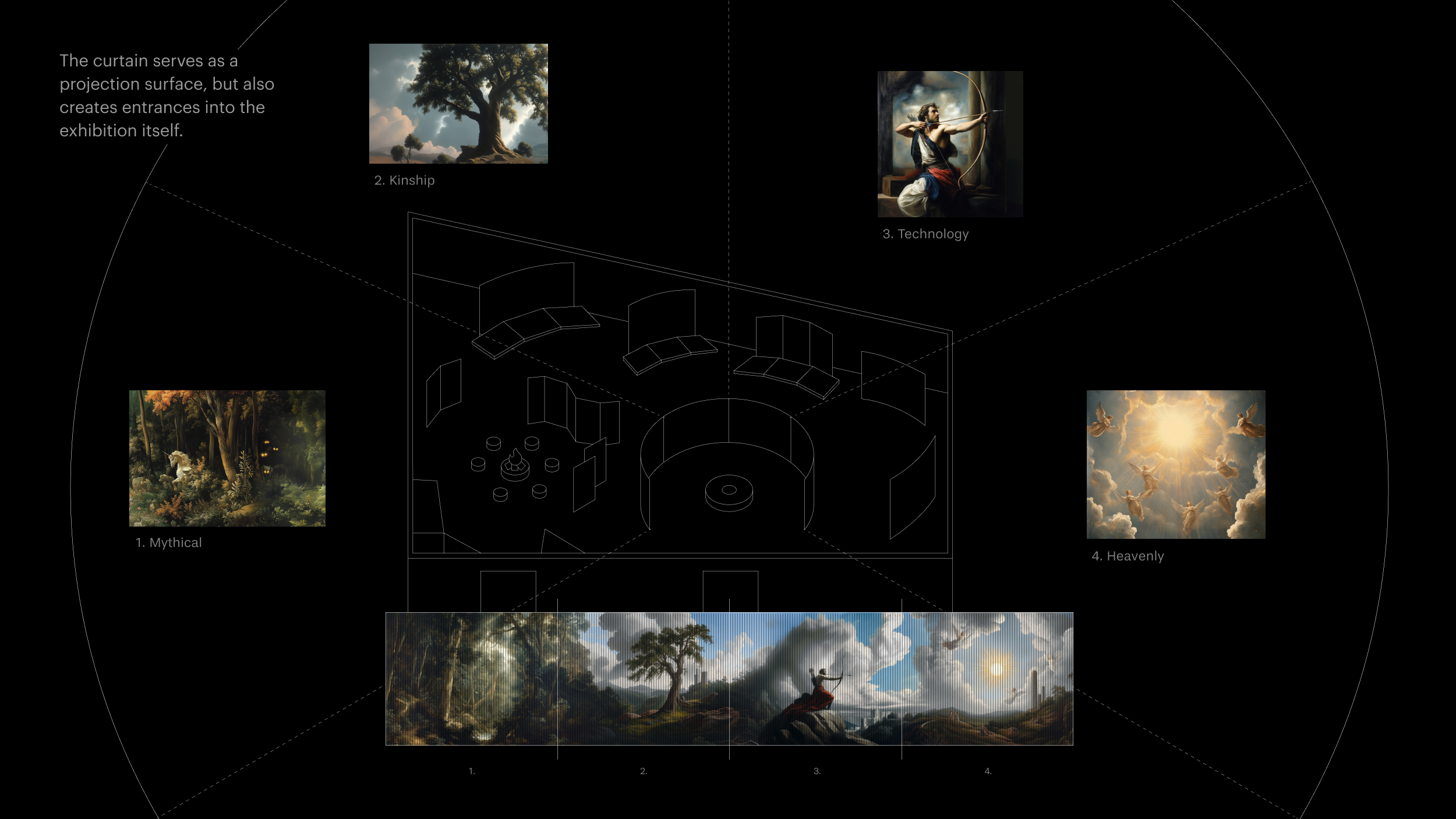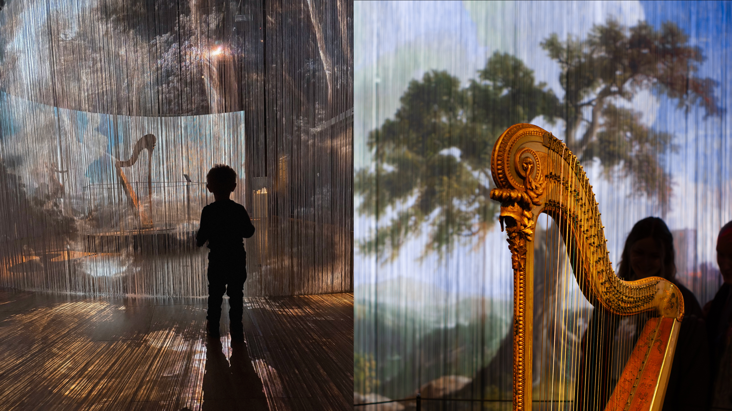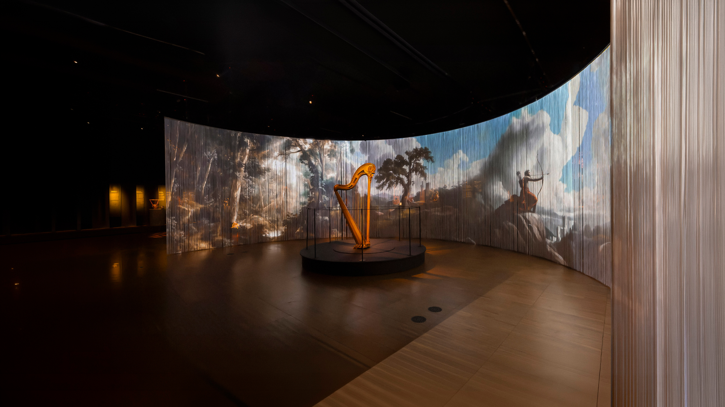 The central design element is a large collage, projected onto a wire curtain ressembling the vertical strings of a harp. Closely associated with chamber music, the harp is introduced in a space reminiscent of a private living room, with paintings lining the walls. The curtain serves as a projection surface, but also creates entrances into the exhibition itself. Embedded ensors trigger subtle animations as visitors move through it, making the experience both tactile and responsive. The collage is composed of numerous sub-motifs; ai was used to generate an extensive base of elements, which the designers then collaged into one long panel before dividing it into layers for animation. The curtain sends “strings of light” out into the exhibition, reinforcing the instrument’s form and presence.