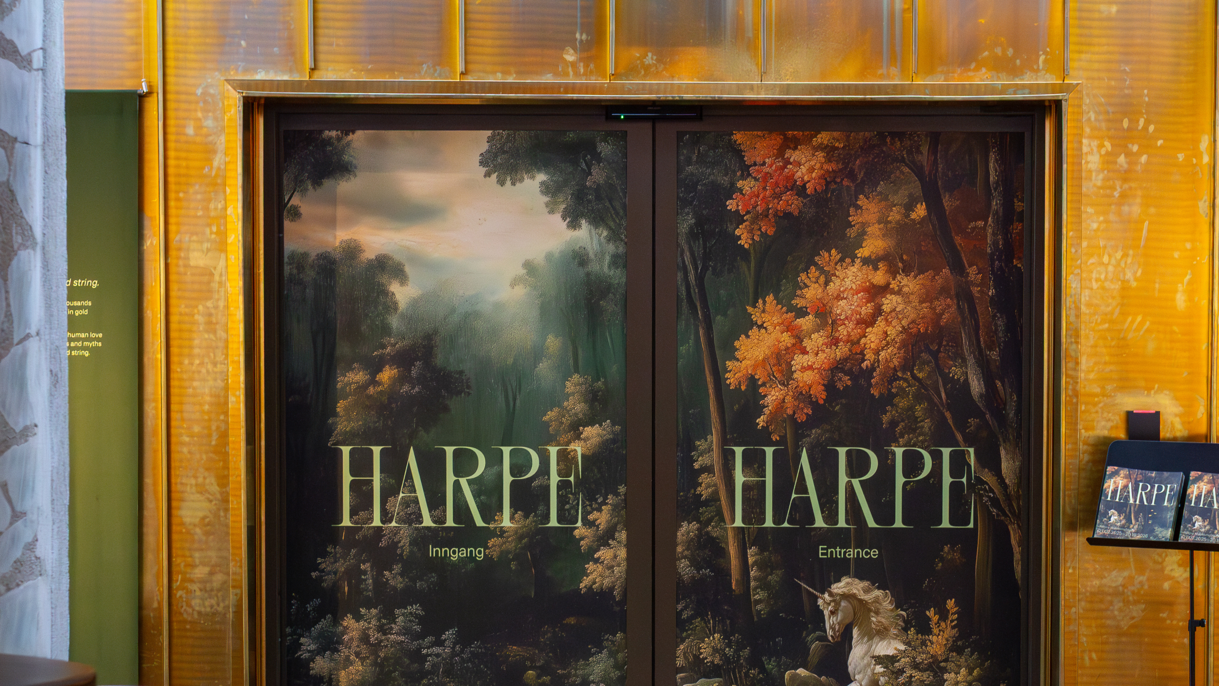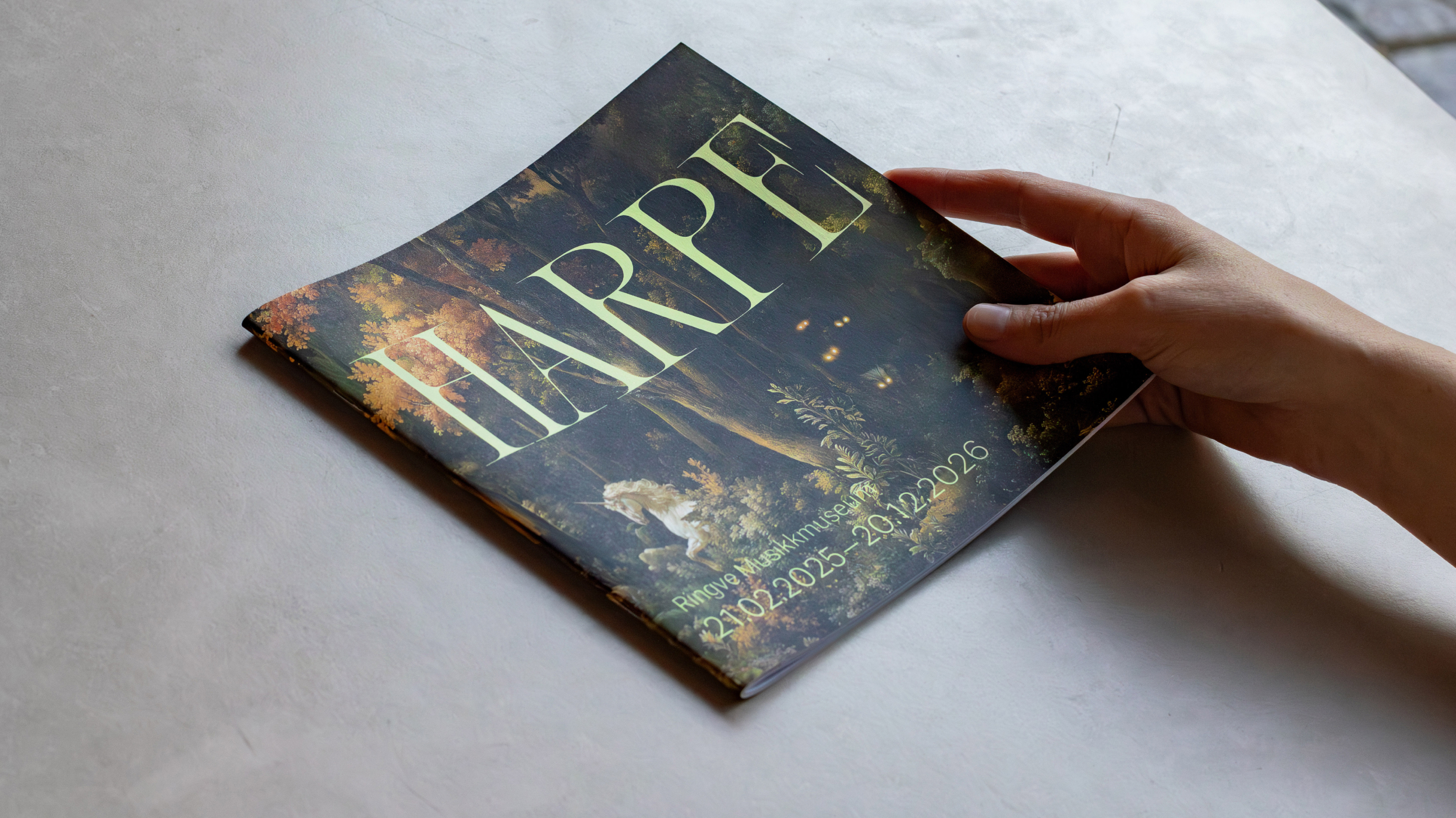 The motifs reference key themes such as mythology and the celestial. Visitors encounter them again on banners, as well as in marketing materials and the catalogue, creating recognition and visual continuity. Natural greens and blues dominate the palette, while acidic green adds energy and contrast. The hand-drawn logo subtly references the harp’s slender, vertical shape.