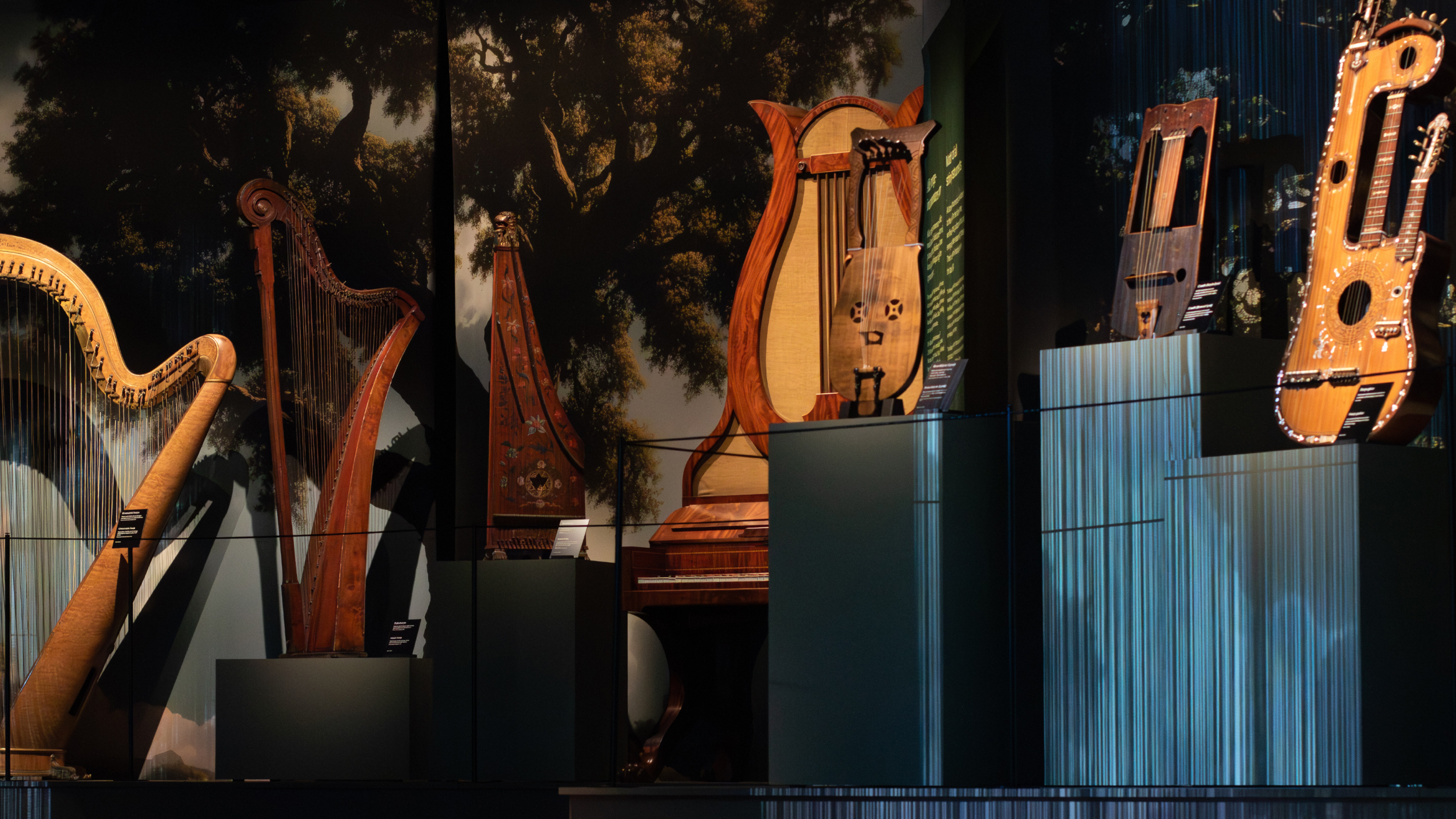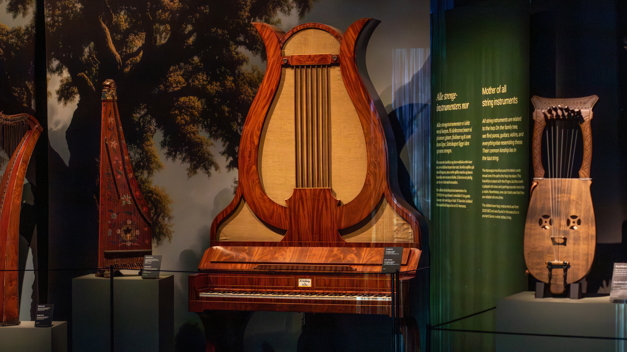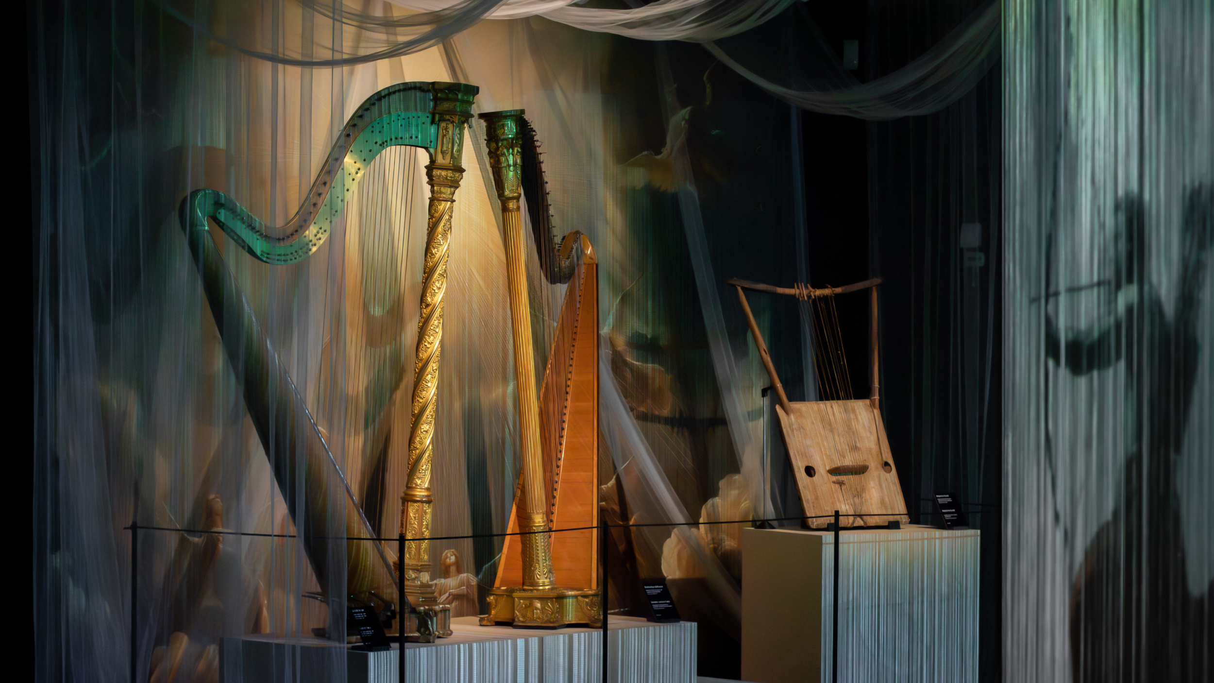 The exhibition was designed to appeal to a wide range of audiences, from children and families to professionals. The highlight of the exhibition is remarkable: Cousineau’s pedal harp from 1782 – the world’s first modern pedal harp. With its elegance, leaf ornamentation, gilded details, and extraordinary history, this instrument play the leading role in shaping the exhibition’s design.