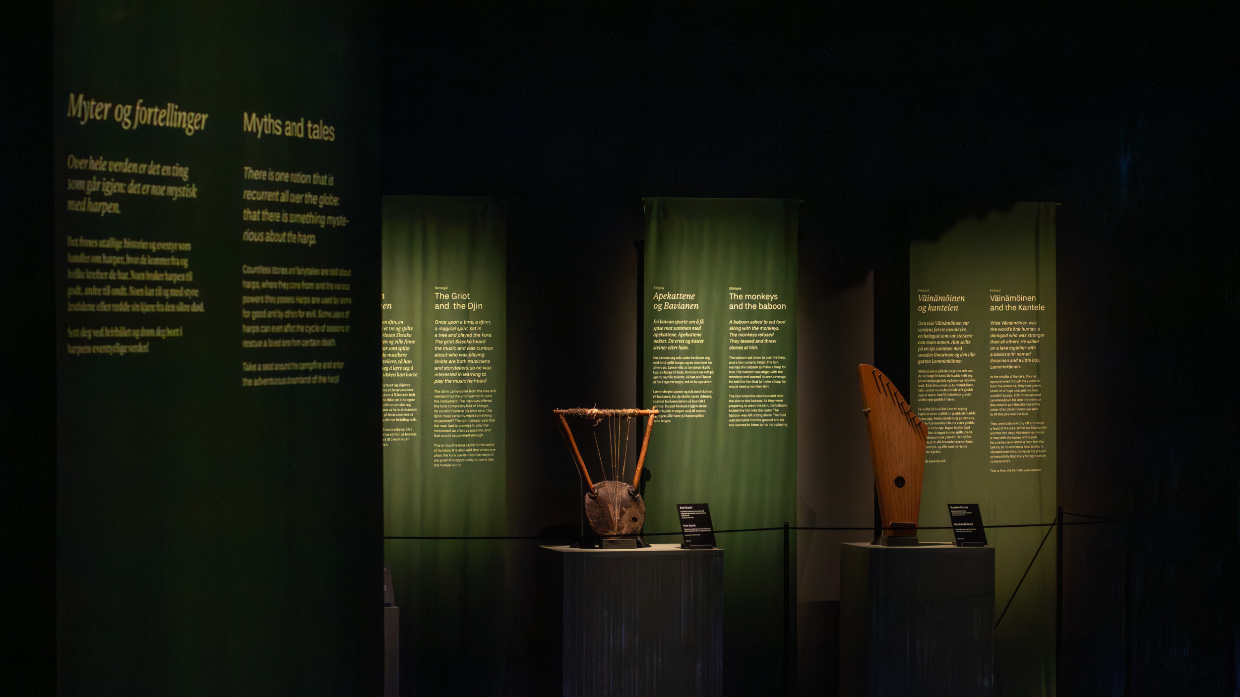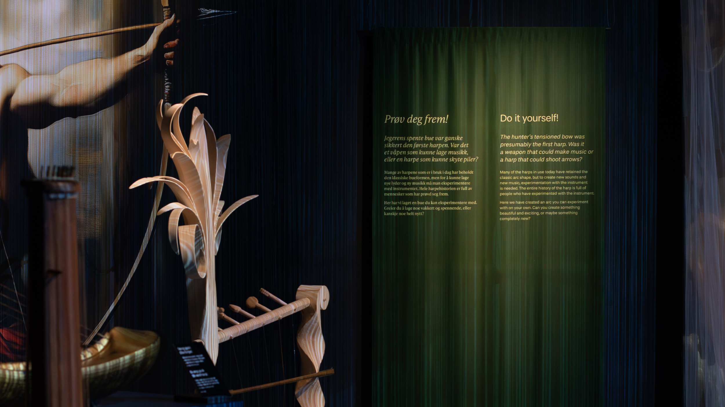 The Norwegian Museum of Music – Ringve and Rockheim aimed to spark curiosity about the harp, one of our oldest musical instruments. With access to rare instruments and captivating stories, the ambition was to communicate this heritage through a sensory and spatial experience. The result is an object-based exhibition where considered aesthetic choices enhance each object.