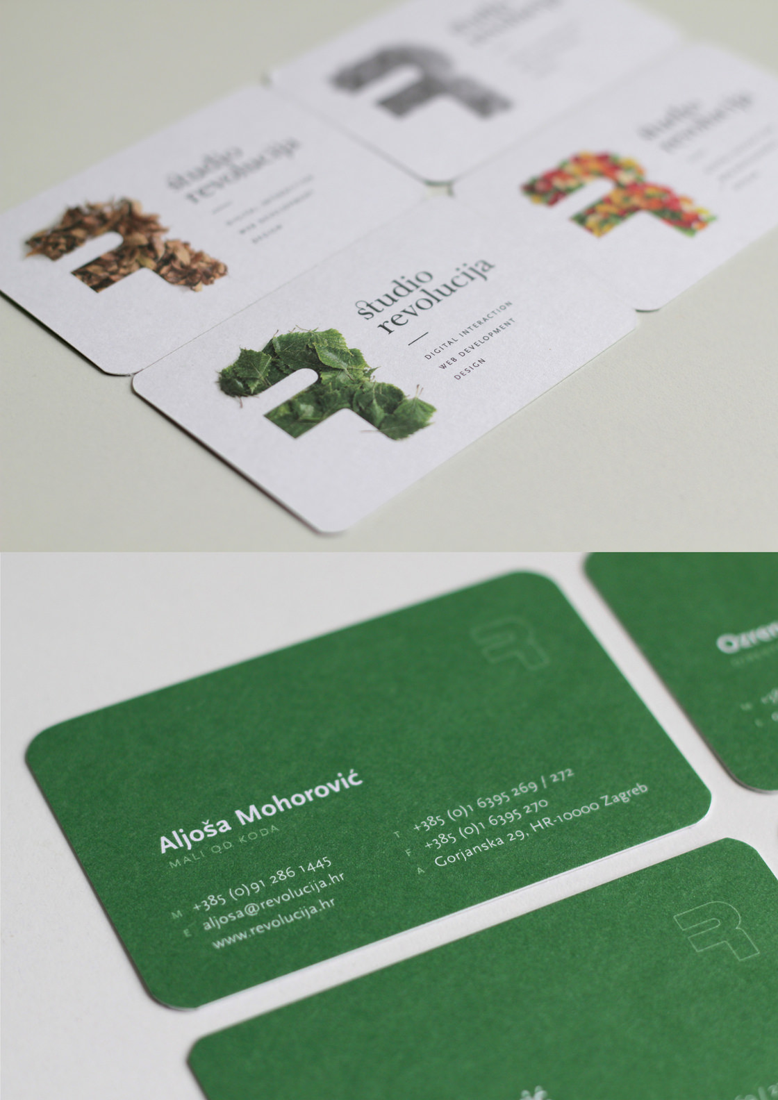 The new studio identity plays with the character "R", the company symbol, by reflecting on different everyday objects that can be used to create it. The idea was to show the creativity and diversity of various work that the studio covers in everyday work. Considering the nature of the studio's work, which is mainly new technologies, the name itself is set in customized serif typography to add a human touch to it and emphasize that technology itself does not have to be cold and inhuman. For example each employee chose a version of letter R that best represents them to bi displayed on their business cards.