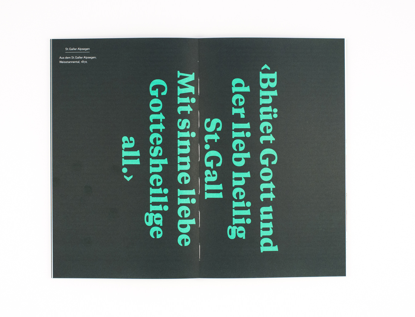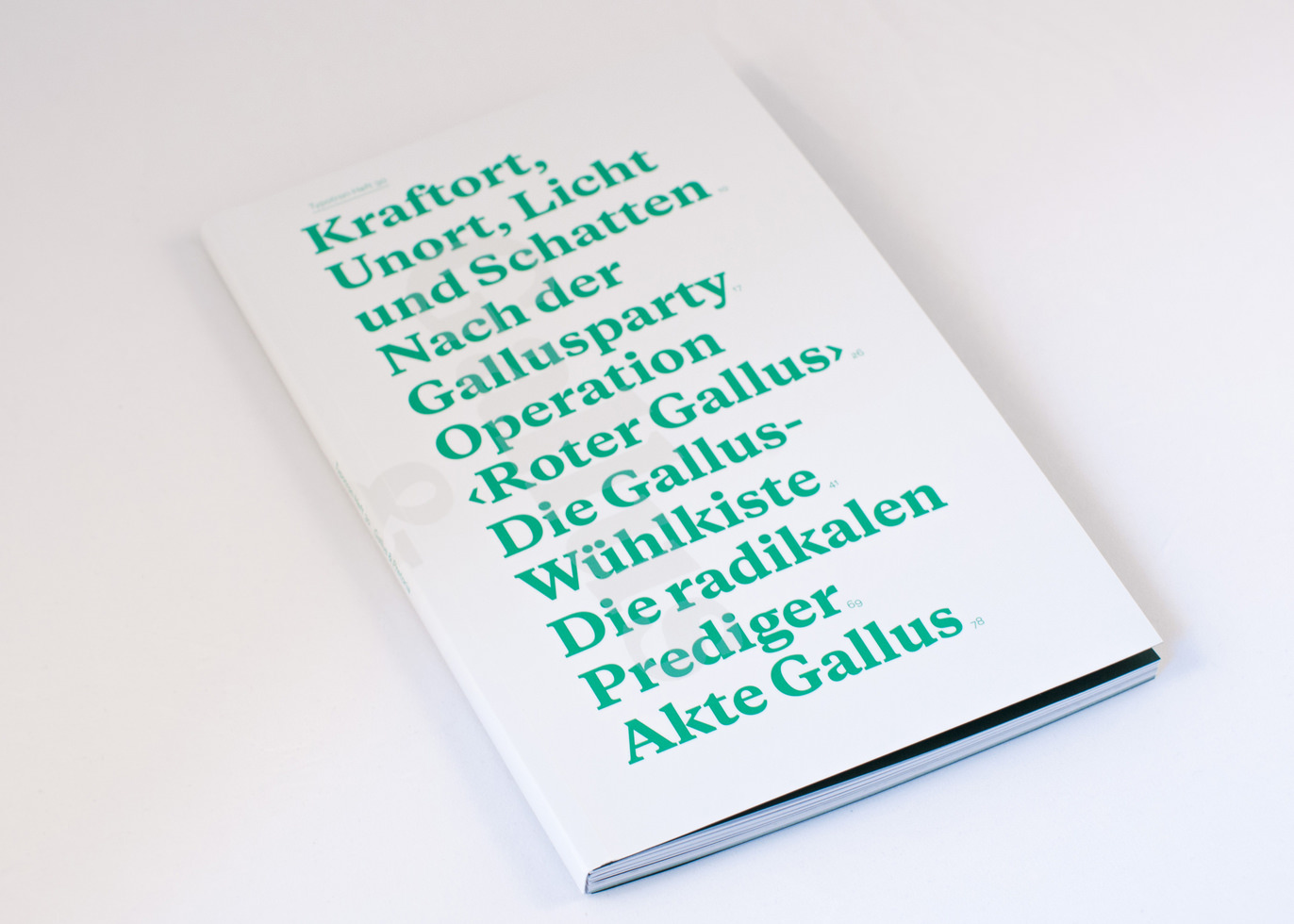 On the occasion of the 1400 anniversary of the city of St.Gallen, which was founded by Gallus, the 30th edition of the ”Typotron-Heft” makes a contribution to the topic. It tells the story of the cult figure and his affect on society in different centuries. Therefore working in cooperation with the Historical Museum was essential, as the exhibition ”Gallus – Cult, Kitsch, Cartoon” took place at the same time.