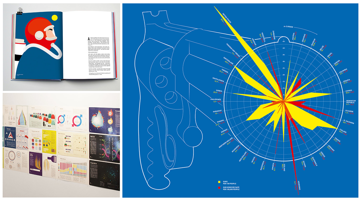 This book offers a new take on the narration of natural and human history. Nearly 14 billion years information condensed into this visual feast of facts, trends and timelines that illustrate historic and modern topics in a contemporary tone. Infographics become the storytellers: data, images, and words work in a system to simplify information, reveal interesting patterns and engage readers in an unconventional narrative. Rather than looking to define the world’s history, this book looks to leverage the power of infographics and refresh an age-old subject for the general public and the specialist alike. The visual grammar of the book evolves with its content. Changes in typography, colour palettes, paper stock and illustration styles give distinct identities to each of the four historic chapters. Each spread shows a unique type of visualization and every effort was made to find a balance between visualising in a way that best illustrates each story and also providing sufficient variety throughout the book. The “past” covers approximately half of the book in 3 chapters, while the “present” (more modern topics) spans the second half. The content break, between past and present, is also leveraged by the change of paper stock as well as the use of other visual cues. Finally, imagery of mankind’s evolution has been adopted in the form a visual timeline. Period-specific silhouettes are featured in an evolving footer to provide an amusing reference guide for the reader’s journey.