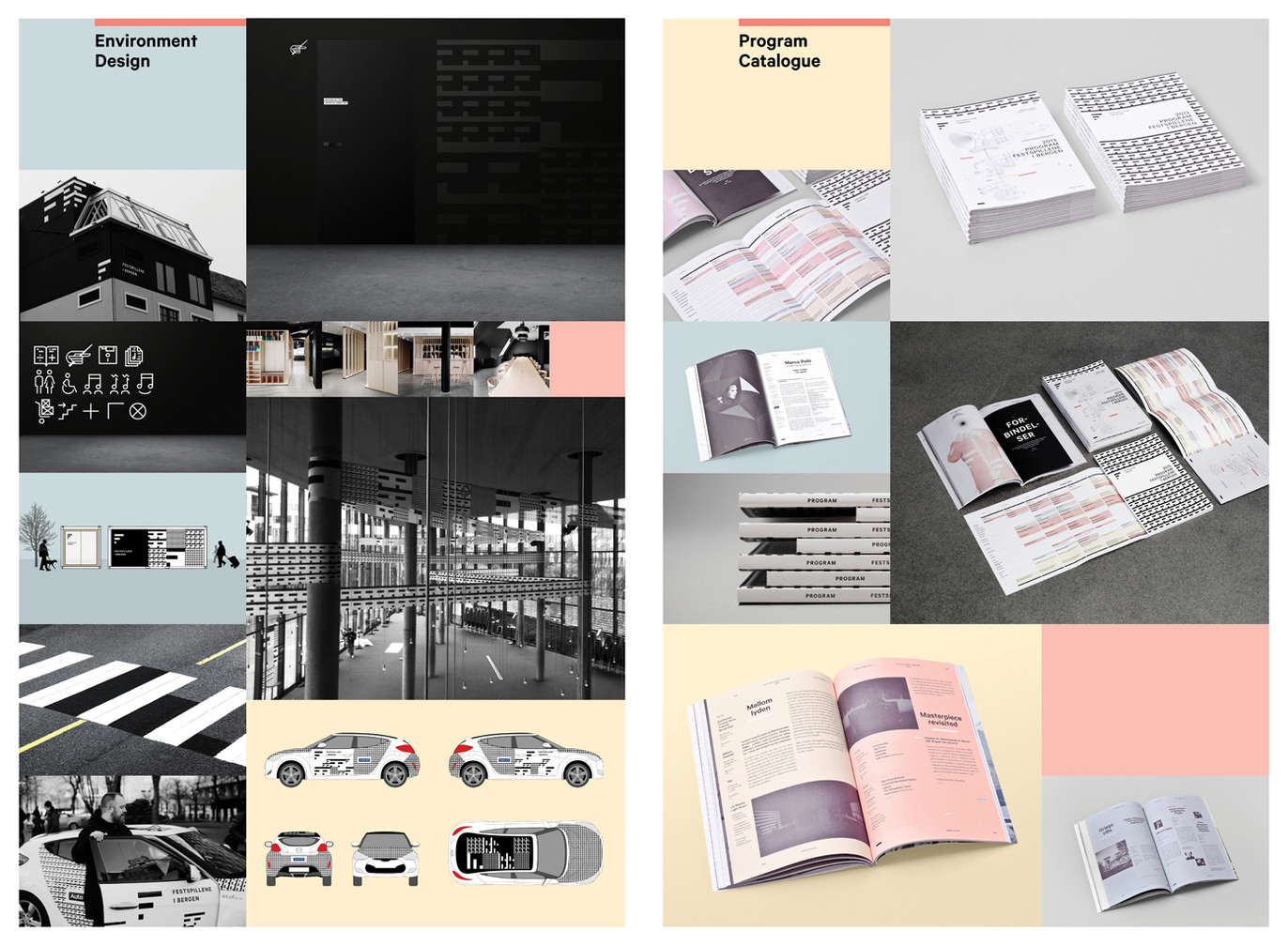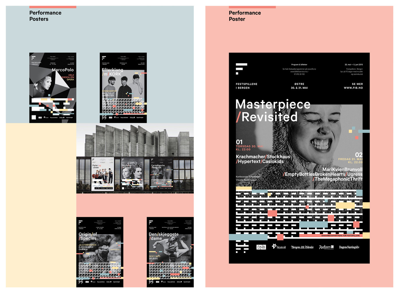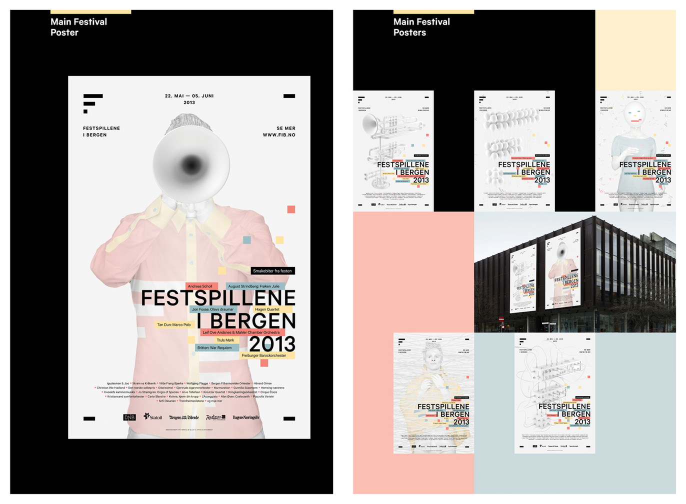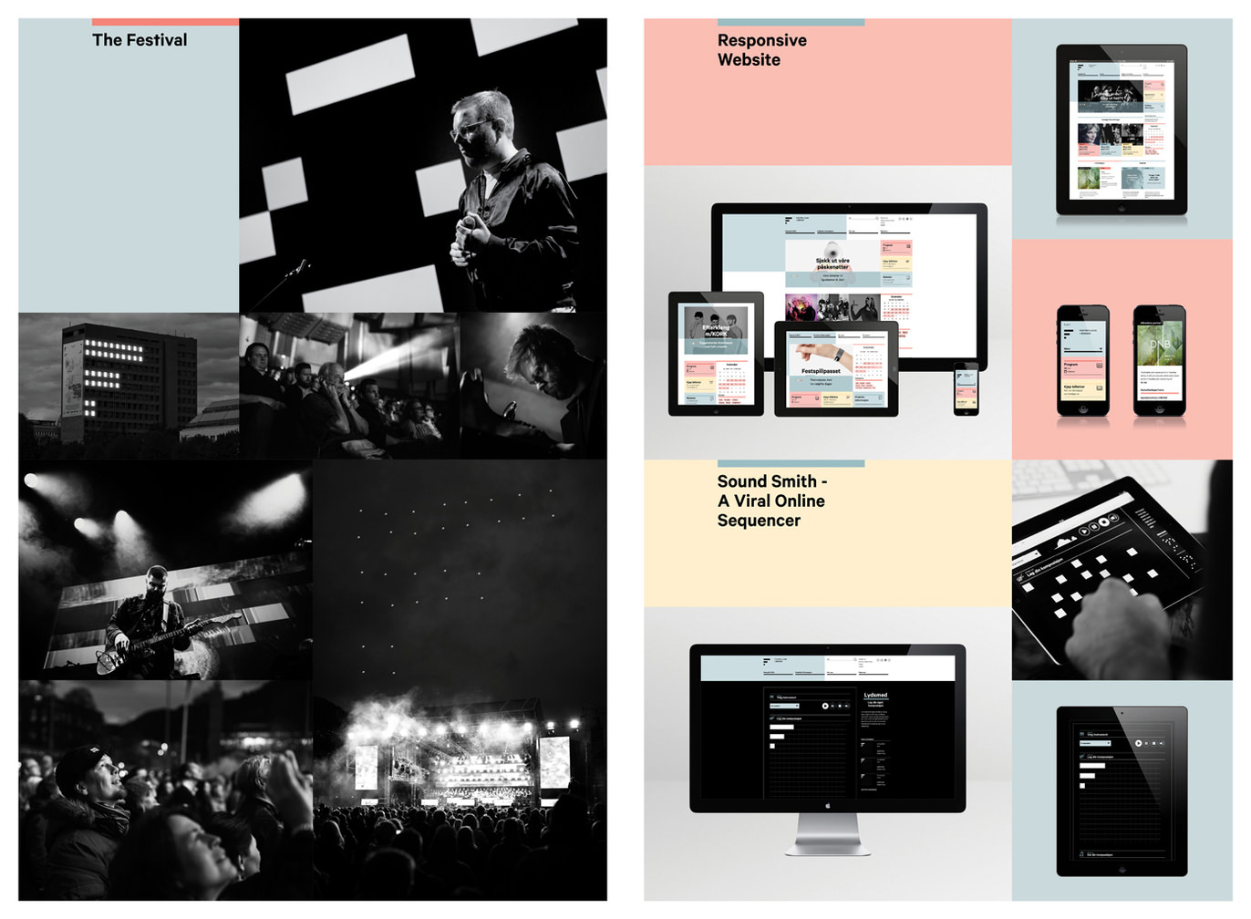 Redesigning a festival brand—whose program ranges from the classical to the Avant Garde—it was important to create a playful, versatile platform, that spoke to different audiences in a unified voice, yet allowed for individuality in content and appearance. Looking to bridge musical and visual language, we started with what they both had in common: being constructed from a single fundamental element—a note and a pixel. Using this singular element to build the iconic ”F” logo, like a chord constructed of various notes, we were able to establish a mathematical system—a system that allows the logo to grow, subdivide and rhythmically repeat like musical units creating a beat or tempo. By visualising music through these modular systems, we were able to create an identity that is strong and flexible with endless possibilities, yet never looses brand recognition. A logo that is both a traditional logo, and a living identity. In addition to the more traditional festival materials, we looked at new ways of creating brand awareness through non-traditional channels. This allowed the city to become a surface for the identity to live and interact with. With the festival being based in Bergen, the rainiest city in Europe, we were inspired to design a new rain poncho, ornamented with the iconic brand patterns. Additionally, we created a traditional Norwegian sweater, that has long symbolised the Norwegian identity, which allowed for a strong connection between the brand pattern and the sweaters traditional knitting patterns. These ideas spoke to the identity of the festival, it’s culture, geography, and heritage. During the opening performances, we had a series of drone helicopters create the “F” logo in the sky above the stage. The city hall used it’s gridded windows to light up the “F” logo after working hours. Additionally, we created a digital campaign called ”Sound Smith” in which online audiences were invited to create, play and compose with our music sequencer, based on the patterns and grid of the brand. Composers could choose an instrument, then compose and share their compositions for a chance to win festival prizes. Without knowing it, the audience began to play with the logo and spread the brand. This proved to be a new channel for spreading the Festival’s brand awareness as compositions went viral on Facebook. Events at various venues during the festival allowed the audience to play and compose before and after performances. www.fib.no/sequencer