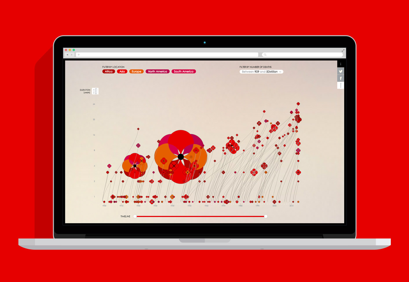 The poppy, symbol of commemoration for the lives lost on wars, was first adopted the Great War. In the infographic, the stem grows from the year when the war started and the poppy flowers in the year the war ended. Its size shows the number of deaths and the variation of colour represents the areas involved.