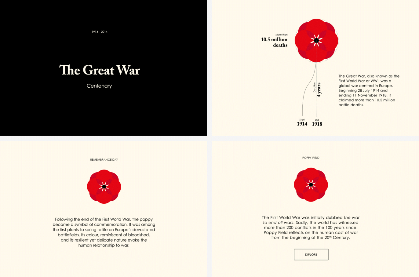 Poppy Field is an independent project that reflects on human life lost in war. To observe Remembrance Day and commemorate The Great War’s centenary, the infographic visualises the timing, involvement and death totals for individual wars since 1900.