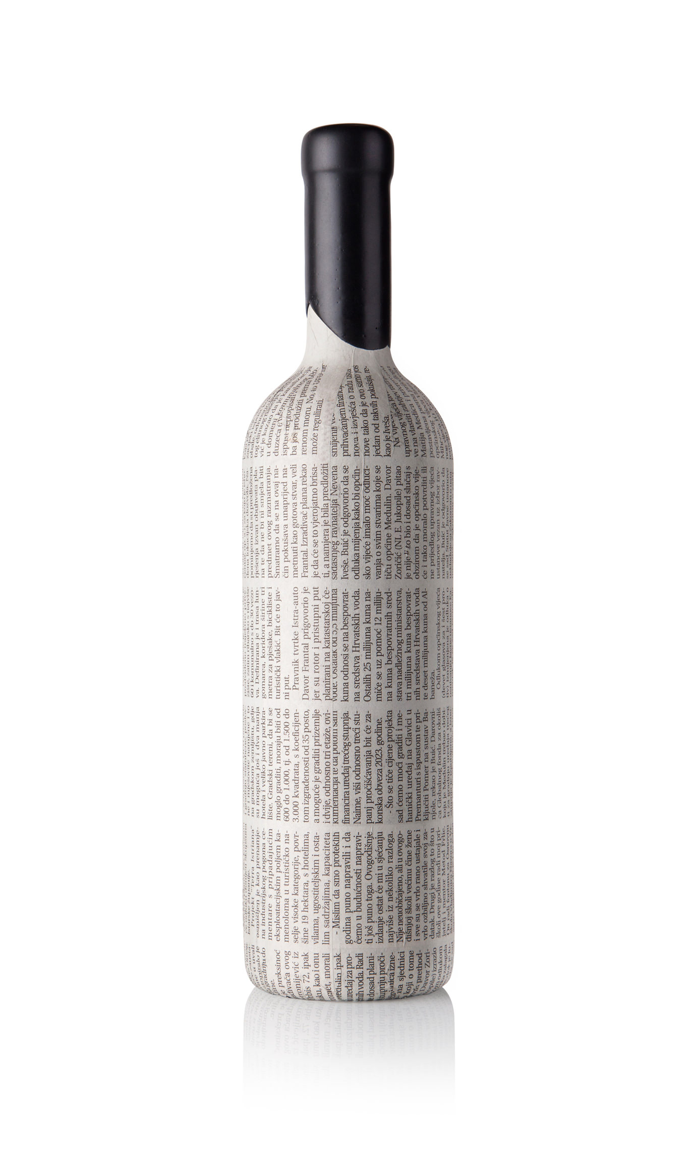 Preparations necessary to create the bottle labels for this special wine edition, bottled in 2014 (limited edition of 200 bottles), date back to 2012. More precisely, they started on September 21st, 2012 – on the day of grape harvest in a vineyard situated in the region of Istria (Croatia), unique because for 80 years it had been cultivated exclusively by using natural methodologies. And therefore, this vineyard fully reflects the philosophy of the wine producer Dimitrije Brečević. Time, space and honesty – that’s what this winemaker believes to be crucial for the quality of wine. That is why the production of bottle labels for this organic wine had begun by collecting 200 copies of “Glas Istre”, daily newspaper of the Istrian region, printed on the day of the harvest, and that is actually the embodiment of the symbolism of time (September 21st, 2012), of space (regional newspaper of the area where the wine is produced) and honesty (information transmitted by newspaper in a given time and space). Honest is as well the way in which labels are produced from the original newspaper paper (Glas Istre 21.09.2012): the pages taken are deprived of all extras and details, reflecting thus the character of the wine itself. At the same time the graphic element of the newspaper text that resembles a cultivated field, very appropriately recalls the wine name: Brazda (meaning: furrow; in the Croatian language brazda means a trench made in the ground by a plow).
