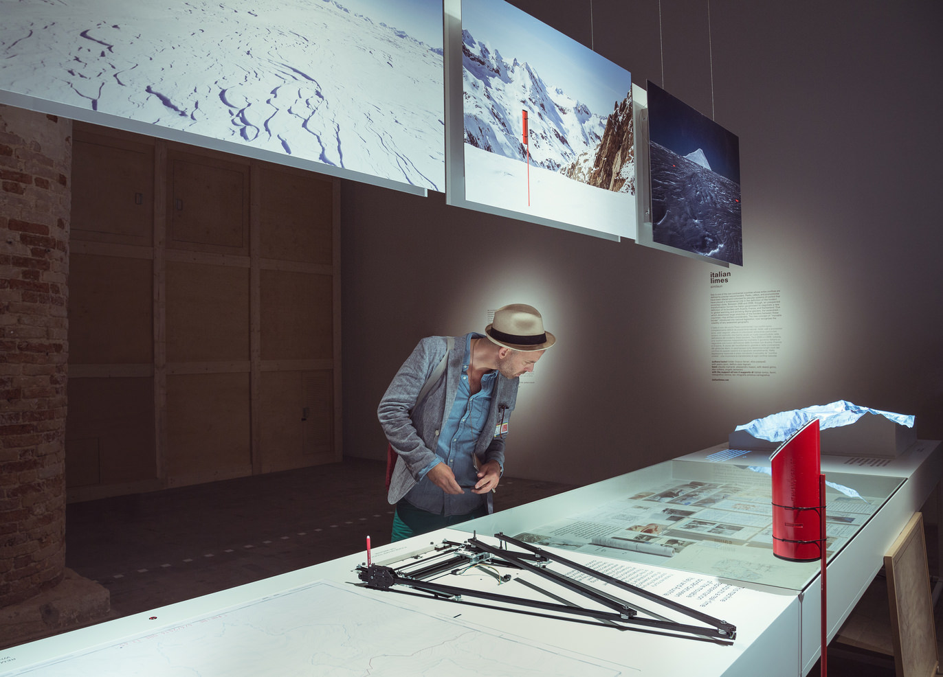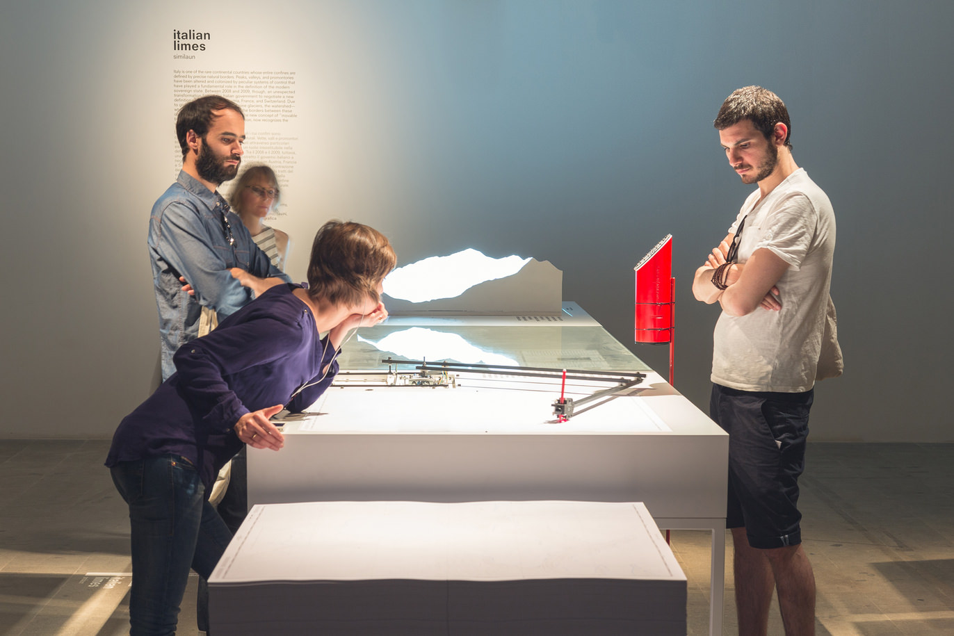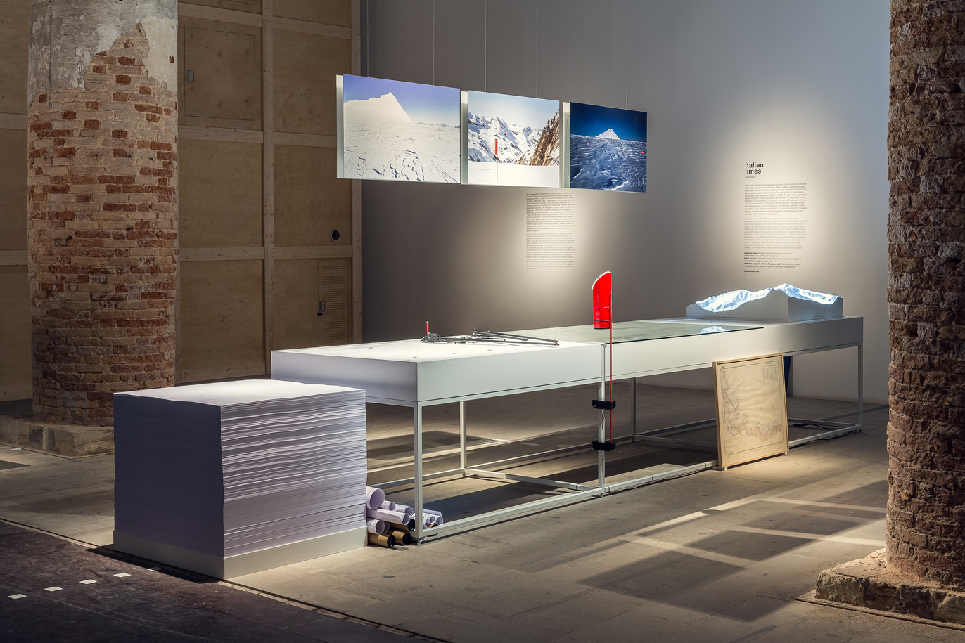 Italian Limes is a research project and installation commissioned La Biennale di Venezia for the Monditalia section of the 14th International Architecture Exhibition. The aim of Monditalia was to illustrate the contemporary Italian landscape and condition through 40 installations, focused on 40 different places on the Italian territory and investigating 40 different topics. We chose to work on the Northern Italian border as a spatial device, in order to understand how it changed after the advent of the Schengen Agreements. The research is focused on the concept of ”movable borders”, a definition recently introduced into national legislation. As a result of global warming and the consequent—and now constant—retreat of the Alpine glaciers, the watershed—which runs along perennial glaciers at the highest altitudes and determines the borders between Italy and its neighbouring countries—has shifted considerably in recent years. So between 2008 and 2009 the Italian government had to negotiate a new definition of the frontier with Austria, France and Switzerland, introducing into national law the unprecedented concept of a mobile border and thus negating the possibility of determining its own boundaries with certainty.