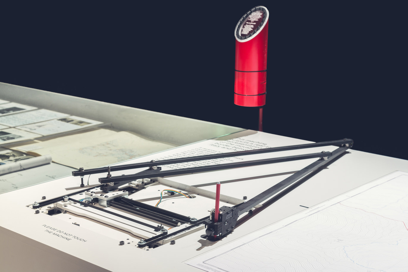 We then designed an exhibition for the space that was assigned to us at the Corderie dell’Arsenale. The installation we created is made up of three elements laid out on a linear sequence: a three-dimensional model of the summit of the Similaun glacier, in scale 1:3000, which is used as a basis for a projection-mapped video about the evolution of cartographic documents of the area and the explanation of the dynamics of the movable border, from 1920 (when the border between Italy and Austria was determined) until nowadays. A collection of previously unpublished documents from the archives of the IGM (the Italian national mapping agency); this collection comprehends photographic material, maps and campaign journals that testify to the indefatigable work of the people responsible for maintaining the border and to the evolution in the techniques and instruments used over the course of the last century. Finally, an automated drawing machine—controlled by an Arduino board and programmed with Processing—was then specifically designed to translate the coordinates received from the sensors into a realtime representation of the shifts in the border. It operates autonomously and can be activated on request by every visitor, who will therefore be able to take away a map—different on each occasion—of a section of the boundary between Italy and Austria, created at the exact moment of the visit to the installation.