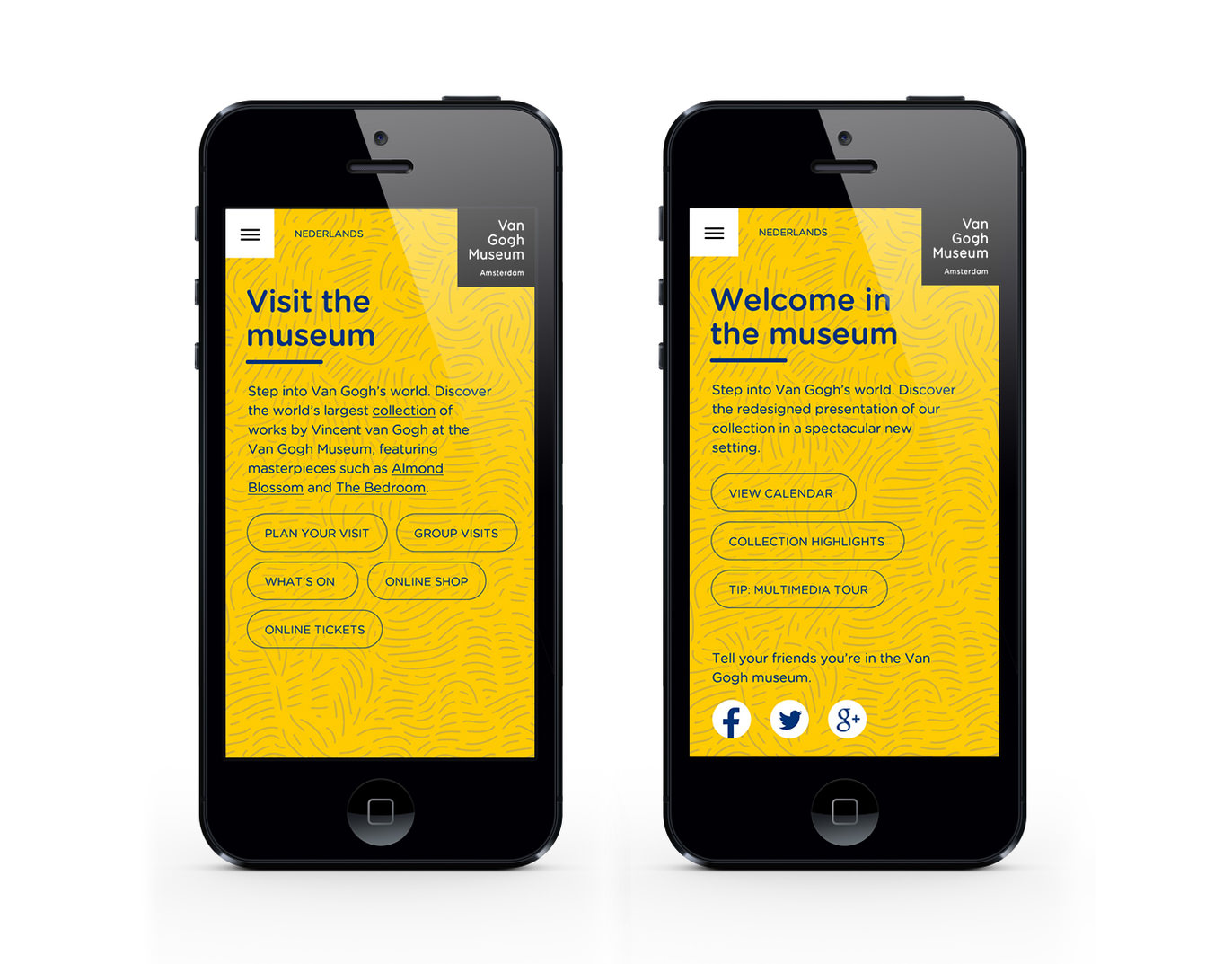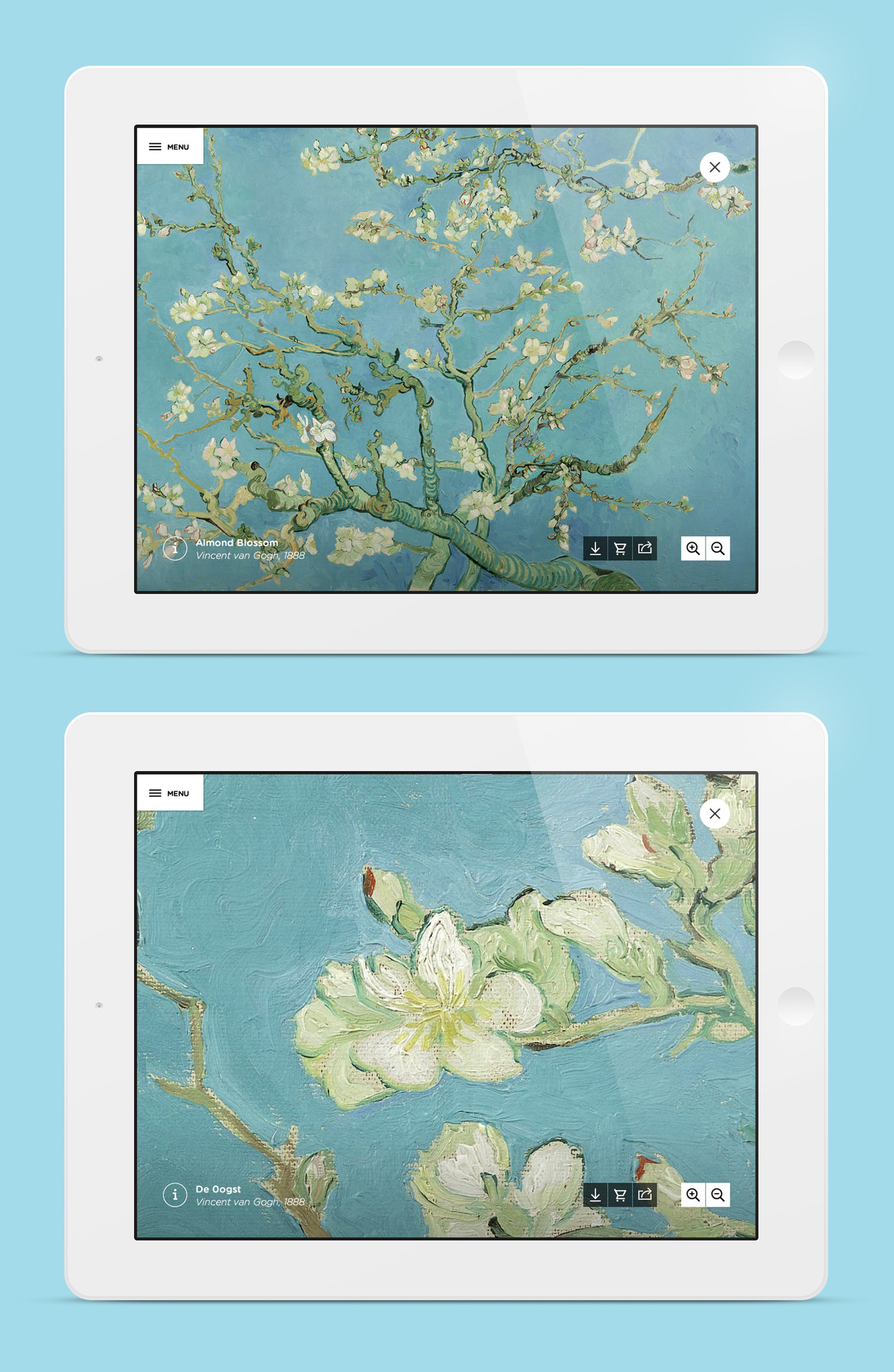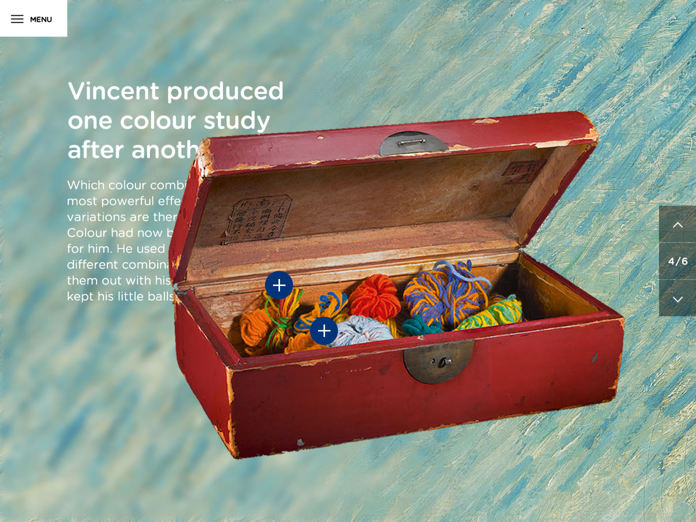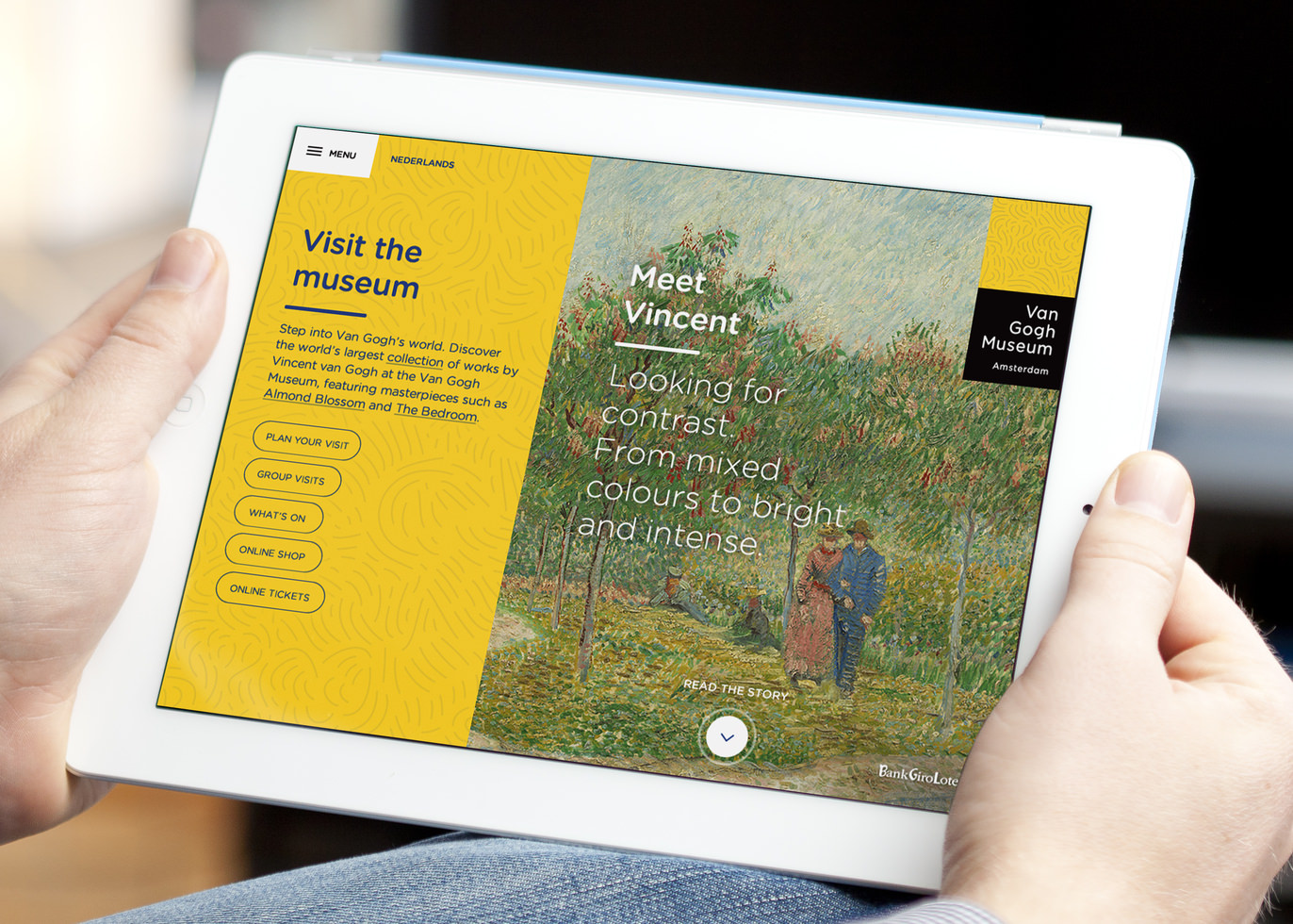 Solution: We not only made the collection – and thus the museum – accessible, but also the artist. On the homepage, we made a distinct choice, with which we immediately reach the vast majority of visitors. The homepage is divided into a facilitative part (‘Visit the Museum’) and an inspiring part (‘Meet Vincent’). ‘Visit the Museum’ quickly and clearly provides practical information on opening times, route and tickets. ‘Meet Vincent’ tempts visitors with exceptional stories about the work and life of Vincent van Gogh. Each story has been specially written and designed, and offers new approaches to the work of Vincent and his contemporaries on each visit. The visitor can browse briefly through the interactive stories, or wander almost endlessly through all side paths and related works of art. The responsive website has been designed tablet-first: with large operating elements and big, highly legible text. The carefully chosen colour themes match the colourful works of Van Gogh.
