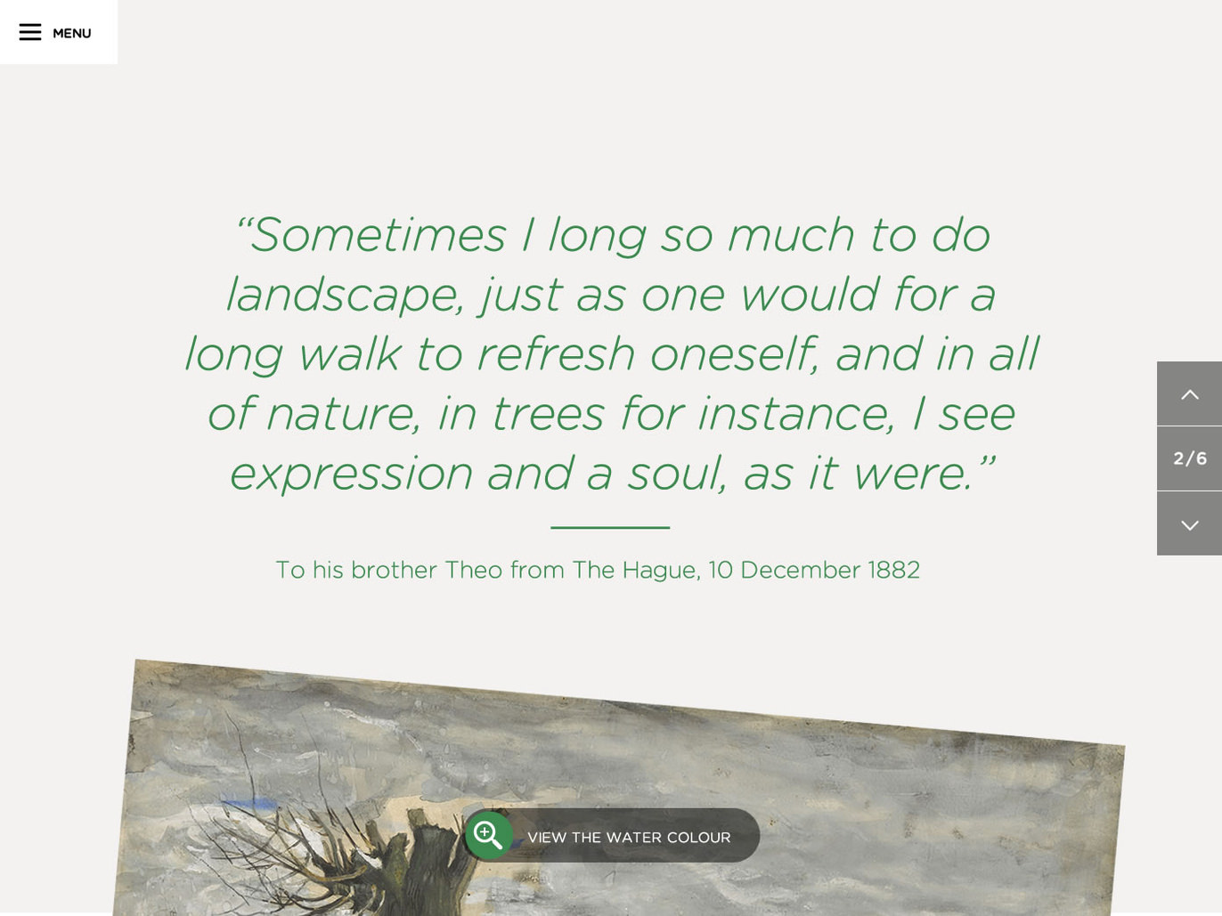 Result: A website with beautiful stories which present the passion and inspiration of Vincent for a national and international audience. The stories take you into the world of Vincent Van Gogh, his time, his search for the very highest, and his victories and disappointments. Vangoghmuseum.nl is a website which not only informs but primarily also inspires and enriches.