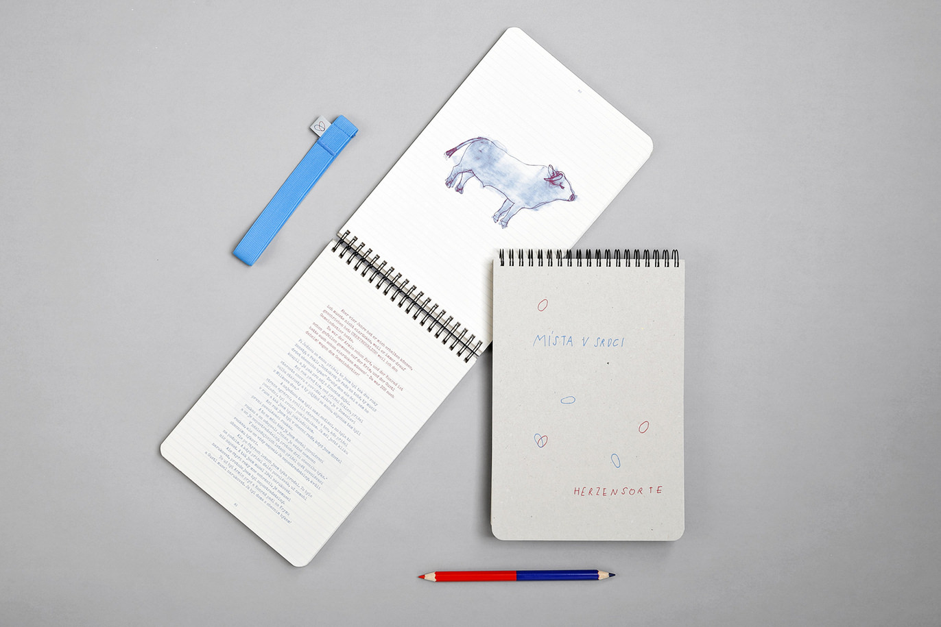 The book is bound like a notepad with top spiral binding, which gives it informal character. The book also contains an elastic strap that holds a red and blue pencil as a symbolic continuation of the Czech-German theme, which the future generation, unencumbered by past events, has in its hands. At the same time it can be used for writing.