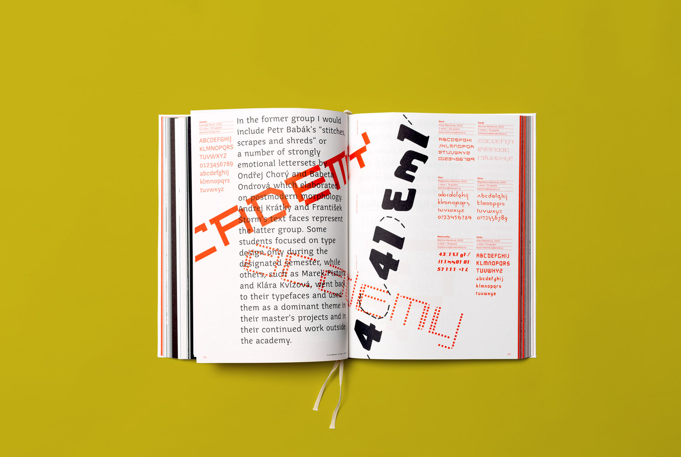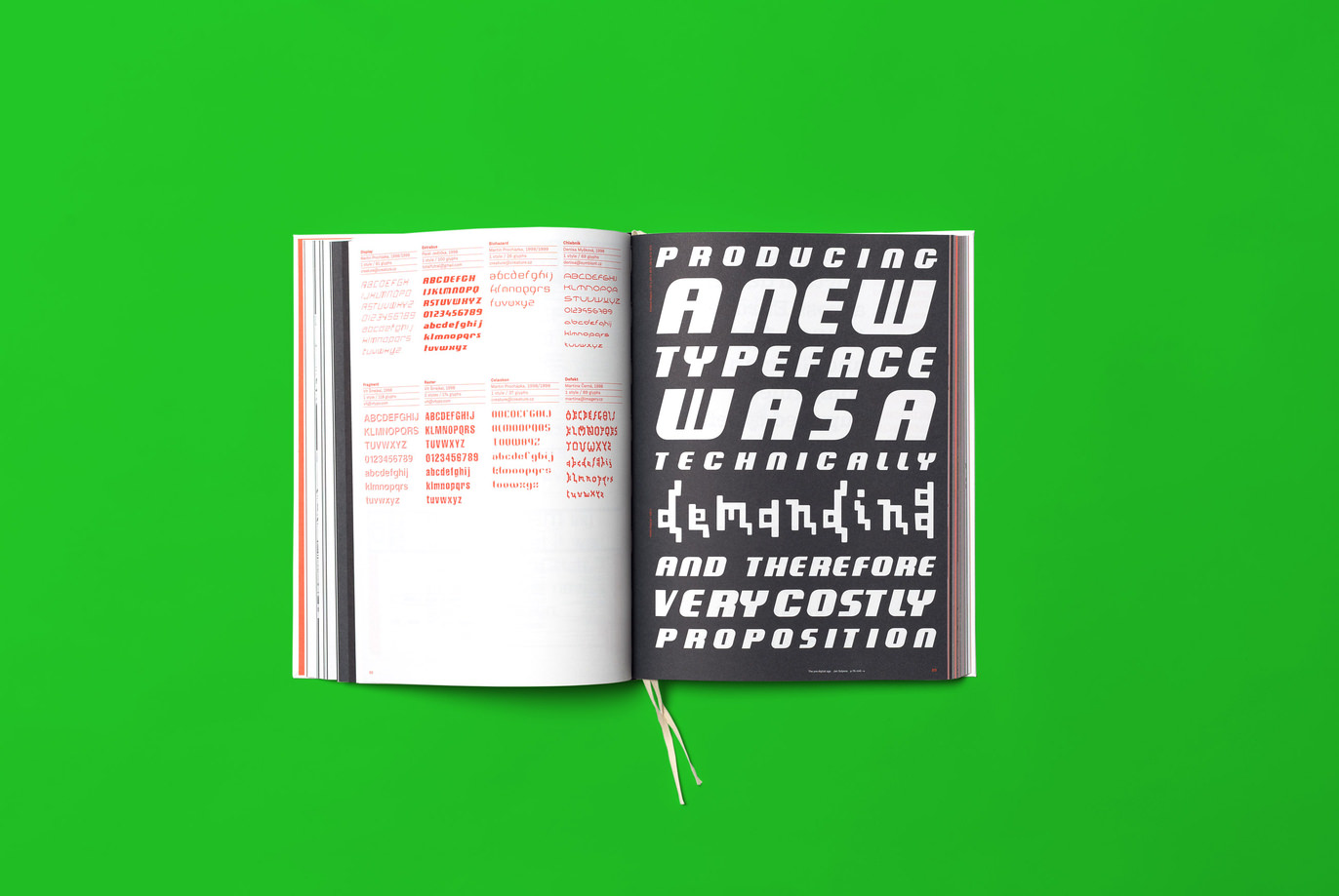 Typo 9010 unites an encyclopaedic collection of Czech digitized typefaces starting from 1990, a time when computers were starting to replace phototypesetting and copying letters by hand, and ending with 2010, when almost a dozen small type foundries were operating in the country. The book captures the most important moments at the oldest Czech type design studio (at the Academy of Arts, Architecture and Design in Prague) and recapitulates the most important milestones in the industry. Short texts by Czech and international typographers describing the atmosphere of the times are distributed throughout the book, which aims to present Czech type design and its digital beginnings in as much detail as possible while placing it into an international context.
