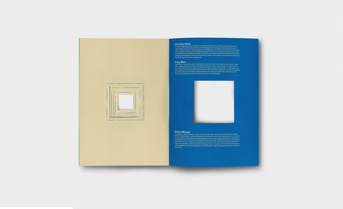 For this design I made a link between the use of colour and the working method of David Chipperfield. By connecting a shape with an attributed colour to a surrounding shape (context), various colour contrasts emerge, referring to the colour theory of Johannes Ittens. The cut out shape in the middle of each page gradually grows while flipping through the pages, adding a spatial element to the printed material. Another important aspect of Chipperfield’s work is the connection of the location with it’s history. This is emphasised by mentioning all previous winners (e.g. Le Corbusier, Bridget Riley, Gerrit Rietveld) whose names form a timeline circling around the cut out square.