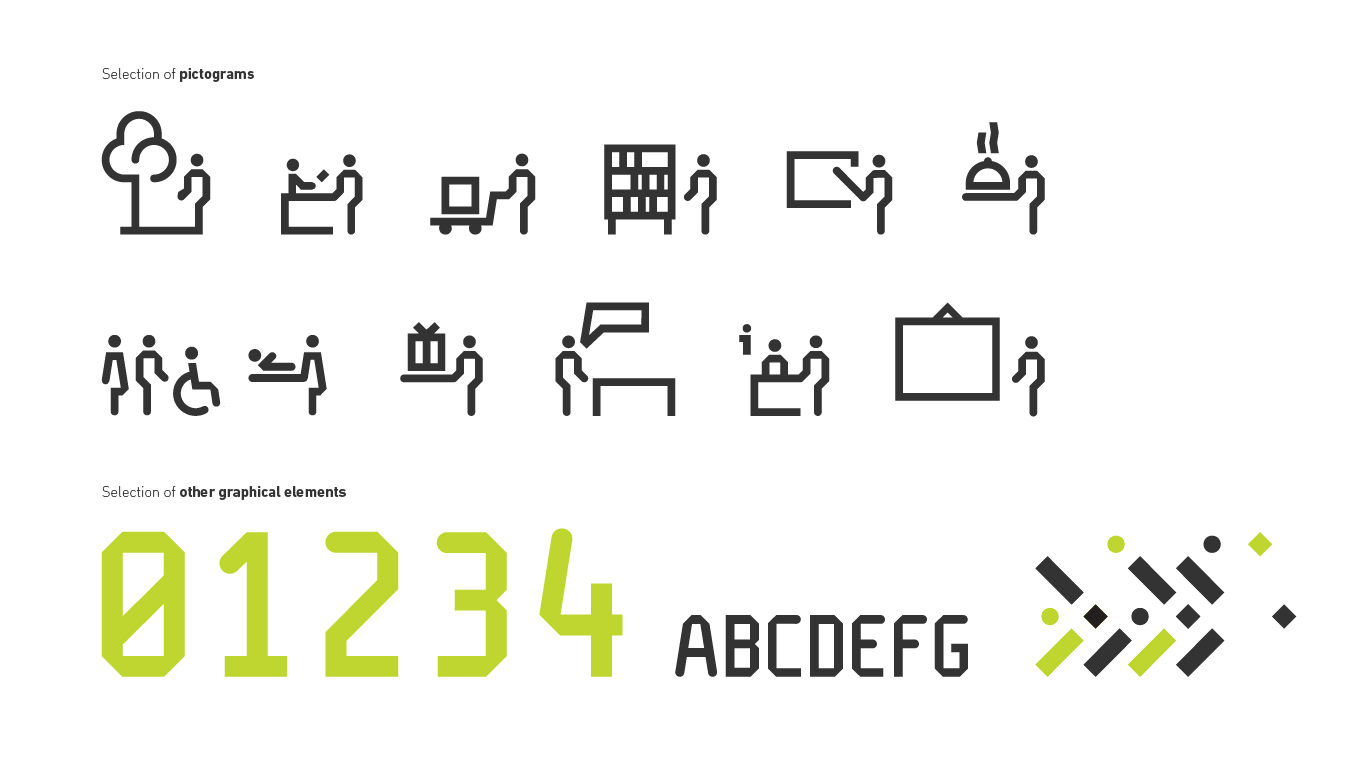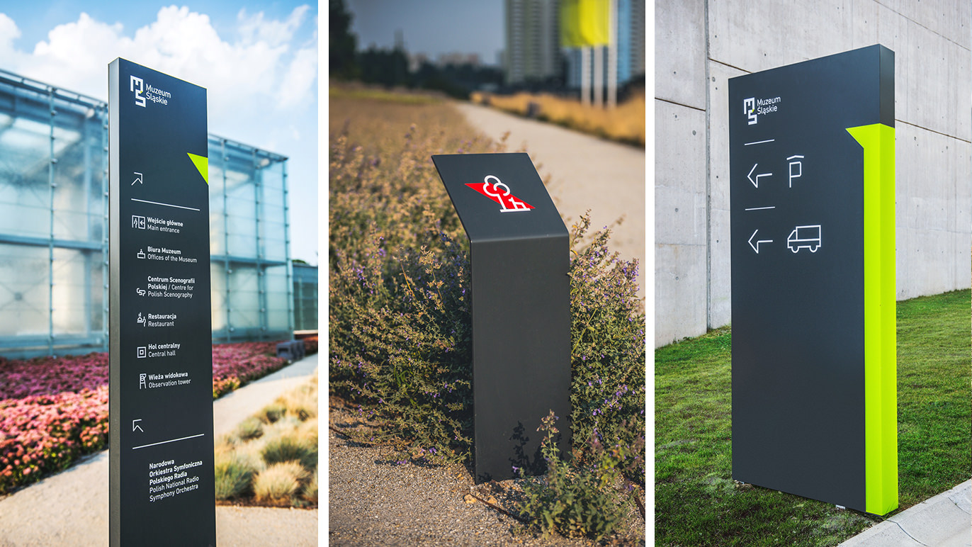 The complicated structure of the buildings required developing a really sophisticated design of a signage system. It was followed by original pictograms (we established ouerselves a limit – we decided that our icons should show the „human dimension” and always consist of human silhouette accompanied with other characteristic symbols) and a serie of visual graphics. The design process included developing the graphical and decorative elements for all the spaces of the new Silesian Museum, both official and administrative. It also required planning communication pathways and make a wayfinding in the park between the buildings.