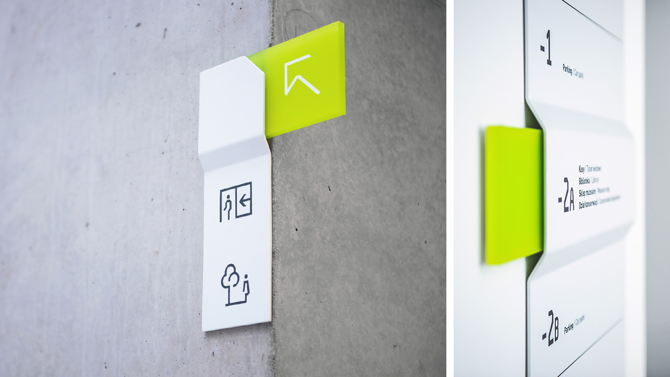 During design process we limit ourselves to strict rules. We used limited graphical language (dark grey, white & green colour) and dedicated, original information carriers. All the elements were in harmony with museum’s architecture & existing branding. They were also referred to each other – all carriers have characteristic curves which refer to pictogram’s shapes. Besides decorative function, the curve & green colour highlights the most important information on the board (about the level, etc.)