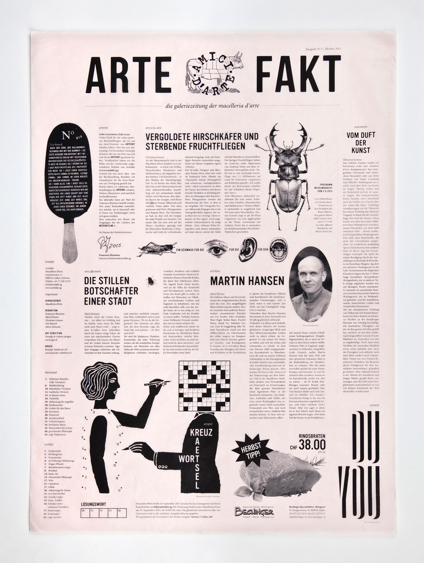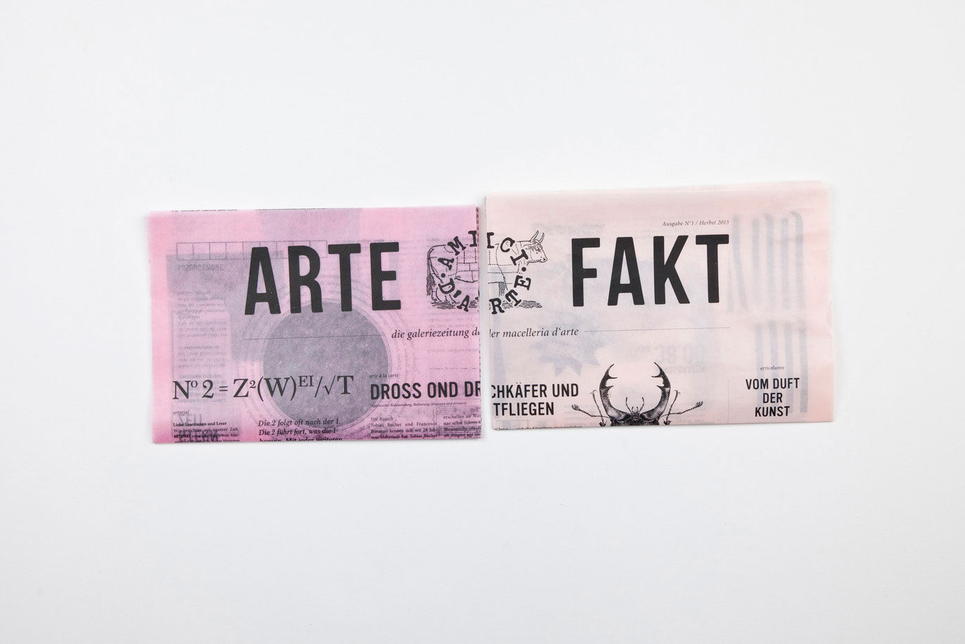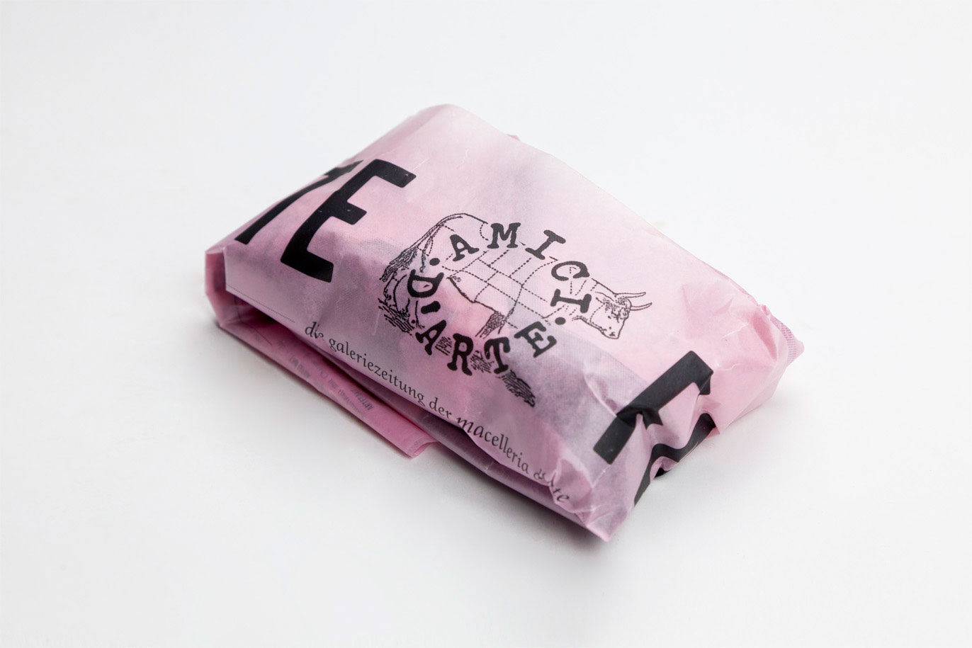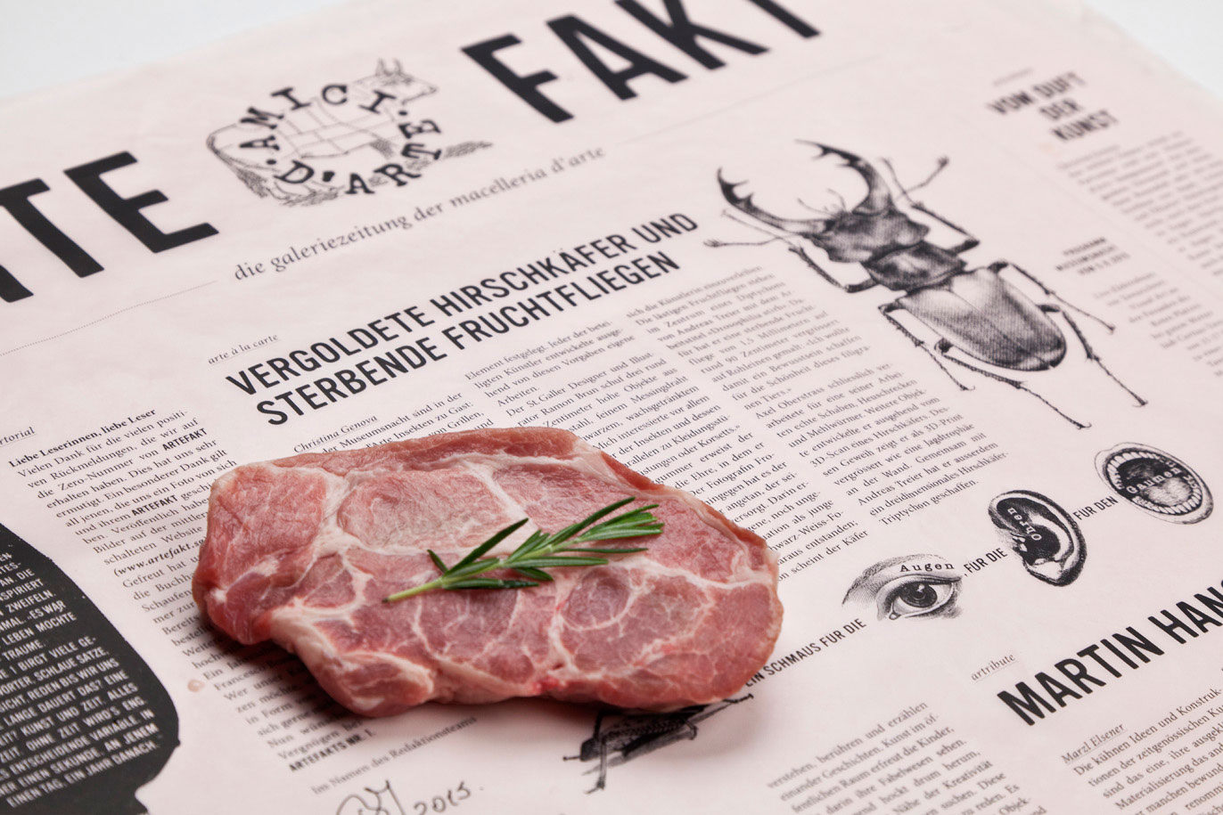 Rosy greasy paper reminding of butcher shops, a clear and highly recognizable design – these are the eye-catching features of „ARTEFAKT“, the seasonal paper about art and culture published by the Swiss gallery „Macelleria d’Arte“ (transl.: Butcher of Art). As the local newspaper skinned the coverage of art, the idea was born to create this newspaper as a quarterly publication based on the editorial concept of open press, which allows interrested people to contribute their ideas, words or artwork to the topic of the next issue. A limited edition of ten pieces printed on cowskin is sold to patrons and supporters.