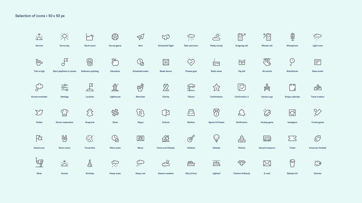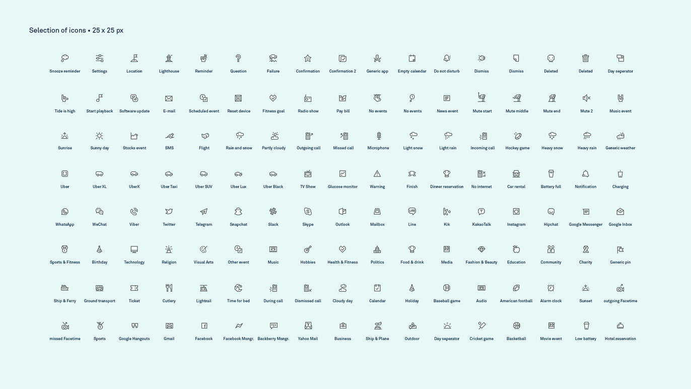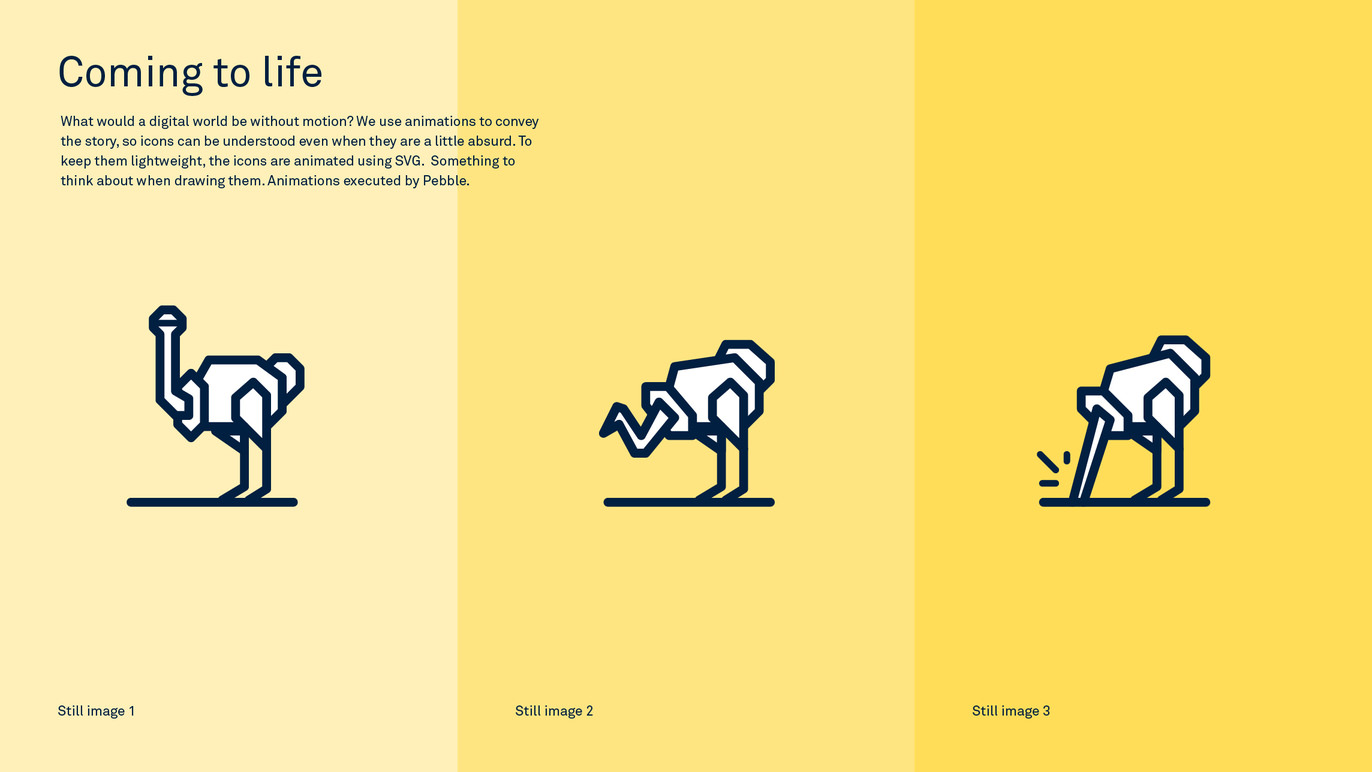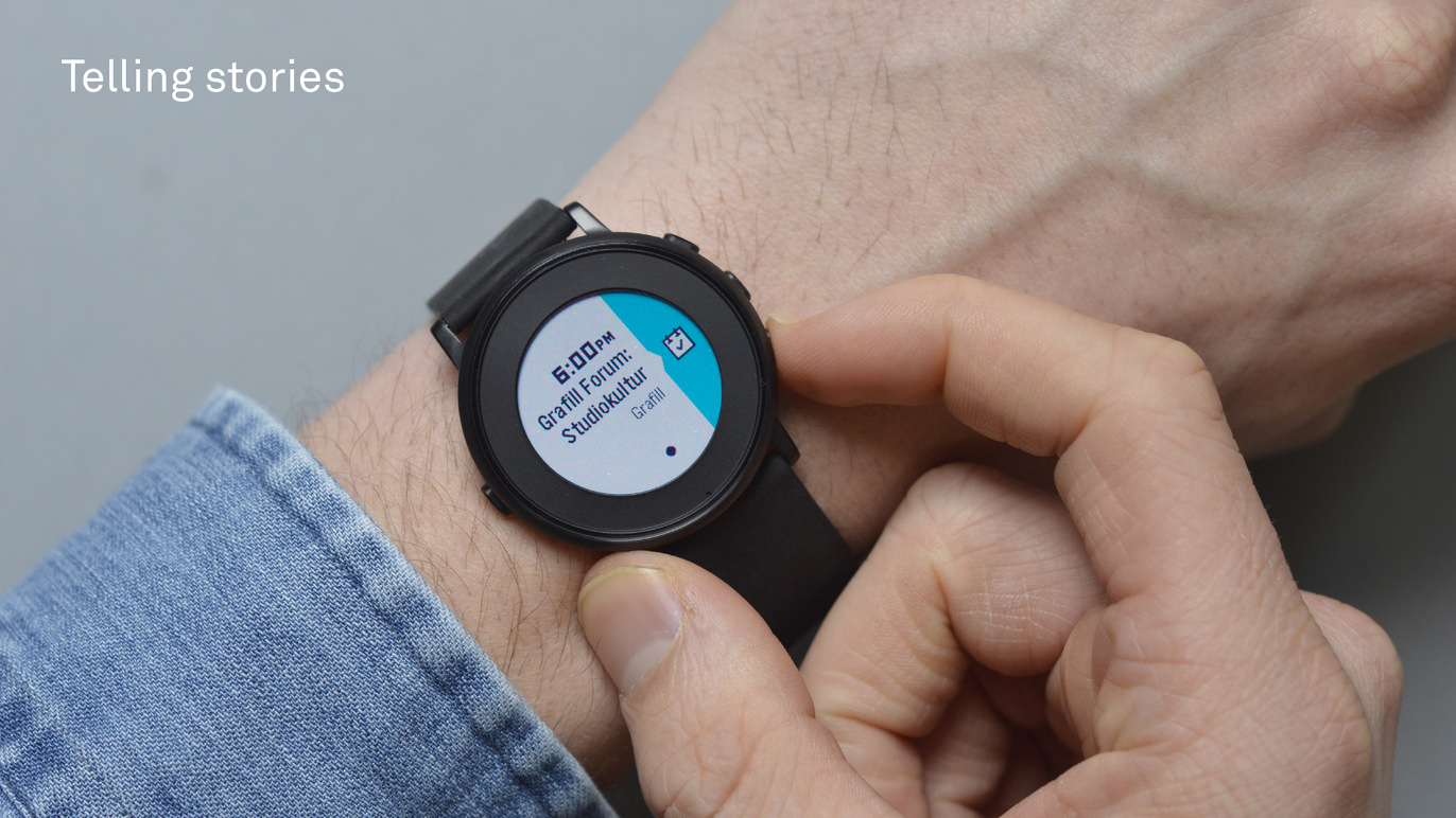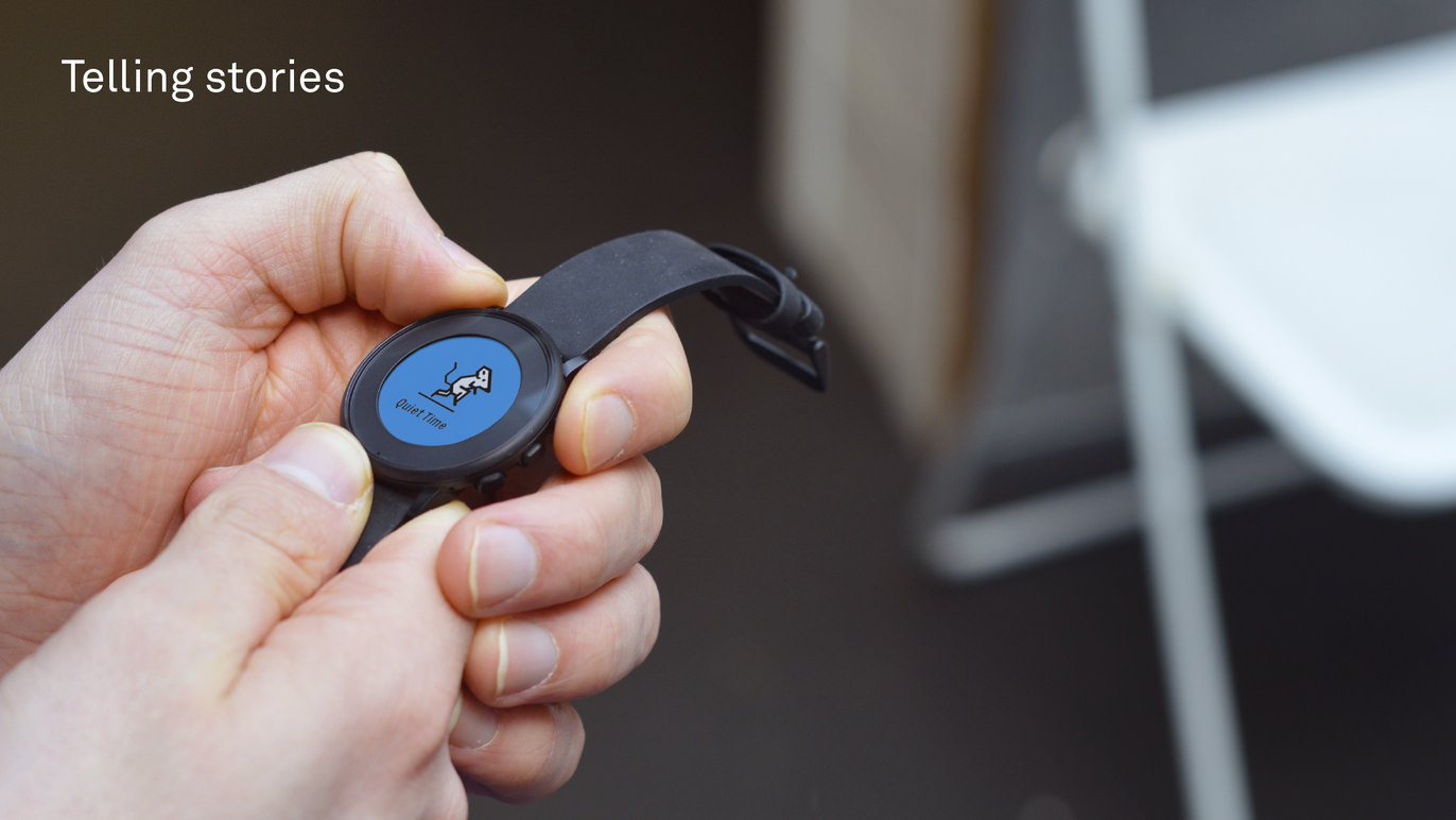What would a digital world be without motion? We use animations to convey the story, so icons can be understood even when they are a little absurd. To keep them lightweight, the icons are animated using SVG. Something to think about when drawing them. Animations executed by Pebble.