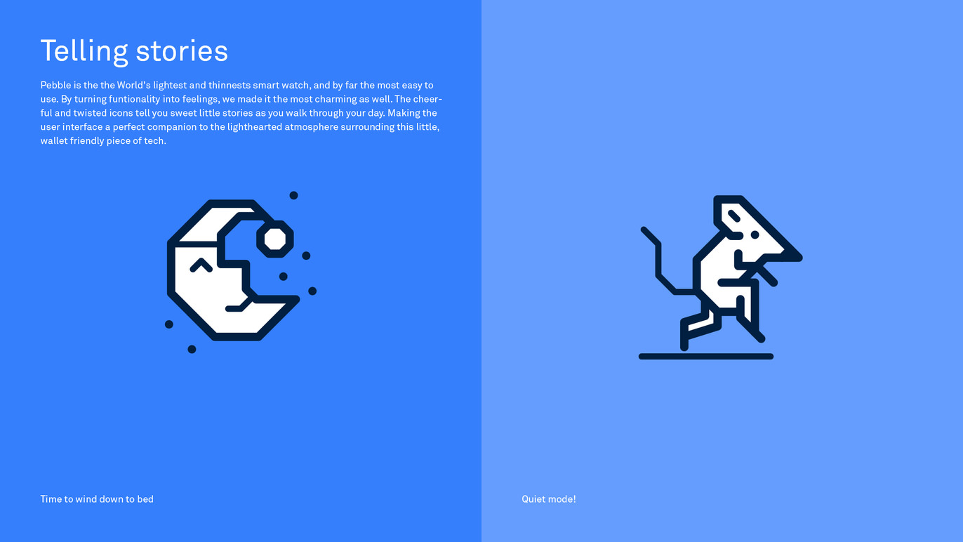 Pebble is the the World’s lightest and thinnests smart watch, and by far the most easy to use. By turning funtionality into feelings, we made it the most charming as well. The cheerful and twisted icons tell you sweet little stories as you walk through your day. Making the user interface a perfect companion to the lighthearted atmosphere surrounding this little, wallet friendly piece of tech.