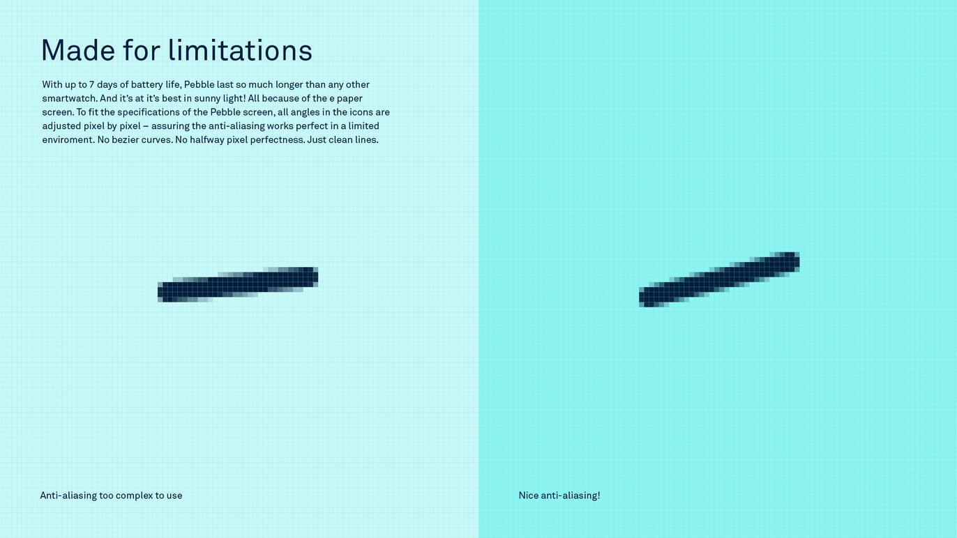 With up to 7 days of battery life, Pebble last so much longer than any other smartwatch. And it’s at it’s best in sunny light! All because of the e paper screen. To fit the specifications of the Pebble screen, all angles in the icons are adjusted pixel by pixel – assuring the anti-aliasing works perfect in a limited enviroment. No bezier curves. No halfway pixel perfectness. Just clean lines.