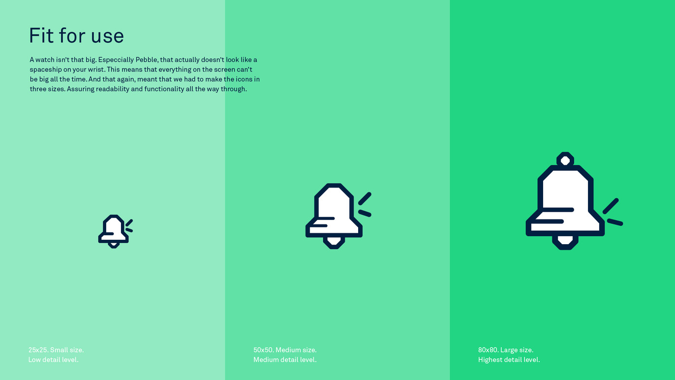 A watch isn’t that big. Especcially Pebble, that actually doesn’t look like a spaceship on your wrist. This means that everything on the screen can’t be big all the time. And that again, meant that we had to make the icons in three sizes. Assuring readability and functionality all the way through.