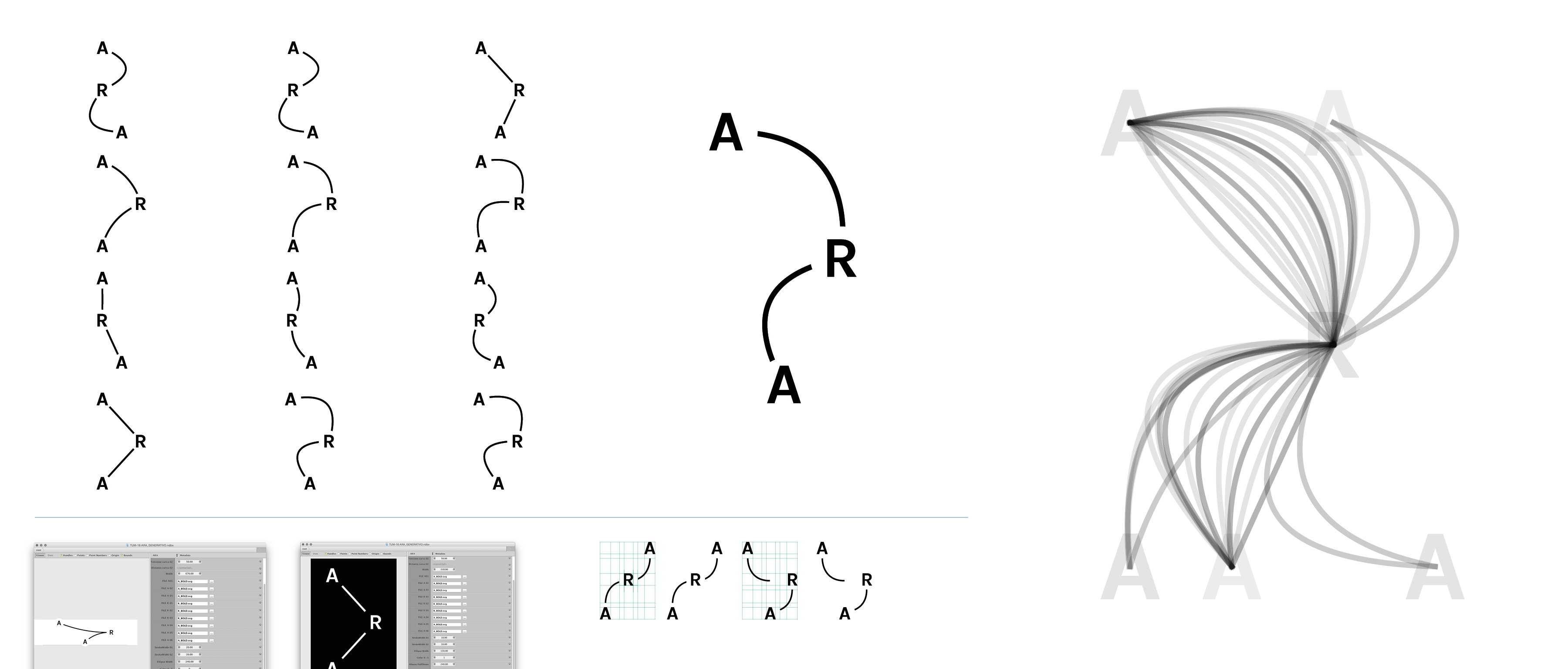 The ARA logo, therefore, is based on a matrix made up of three lines and three columns that are alternatively filled. Connections are only made through glyphs which occupy the spaces of the matrix which have been filled, specifically, the connections between the glyphs are made by Bèzier quadratic curves. Generating variations of the logo makes its visual identity more dynamic and exploits this tool for system applications in various visual outputs.