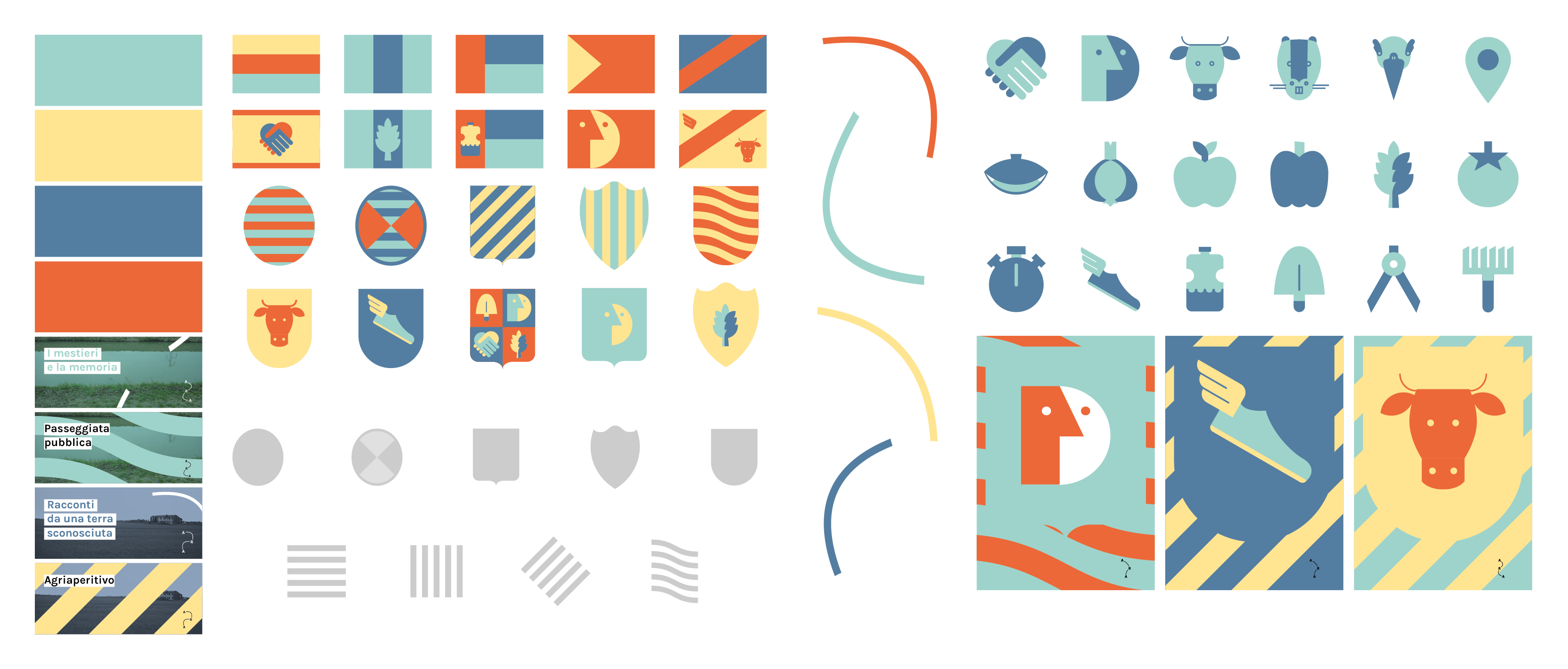 The communication system around the logo is constructed by stratifying different levels of communication: a colour palette that declines the desaturated colours typical of the reference area, a series of pictographic marks used to identify the various driving forces of the project (sport, culture, social innovation, economics, rural life, tourism), and a series of references to the administrative communication in the area.