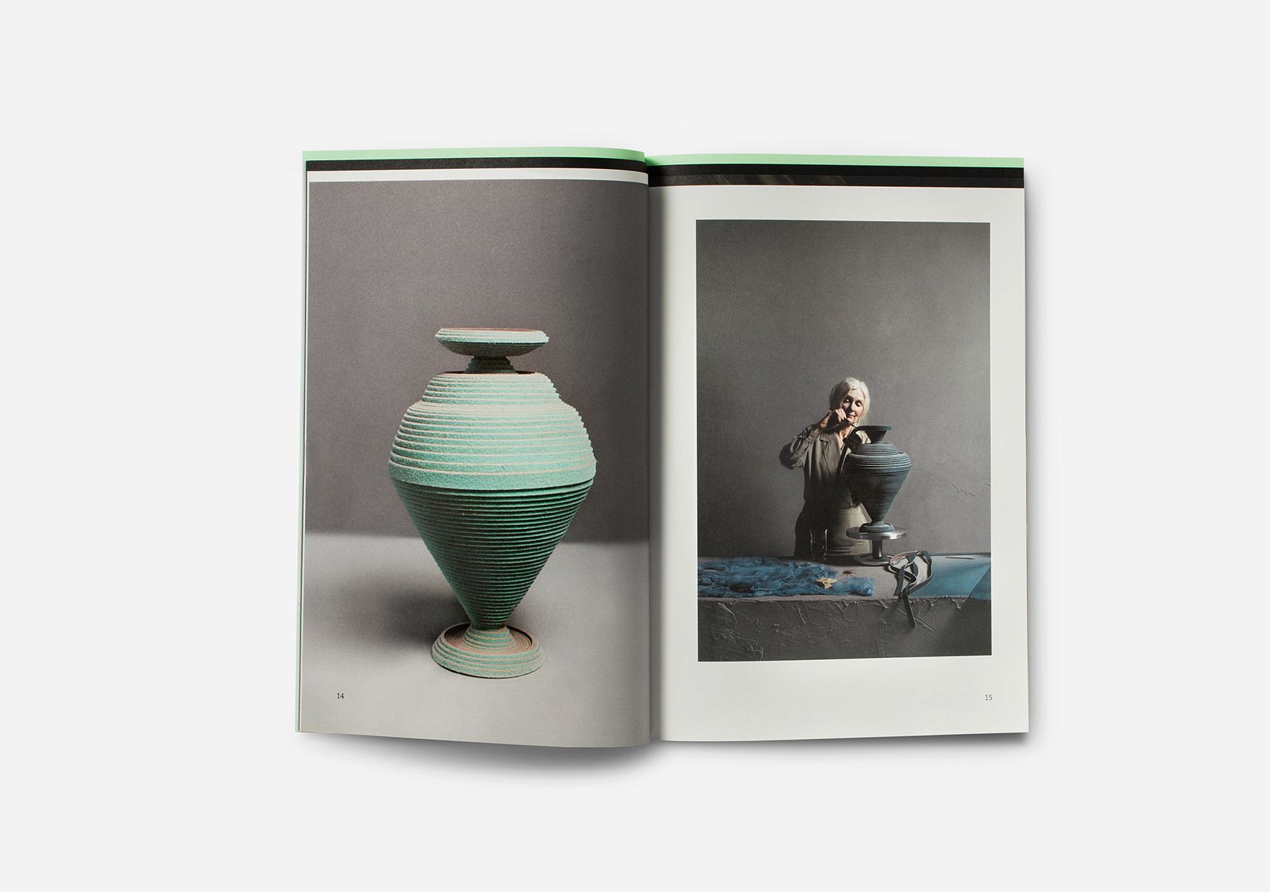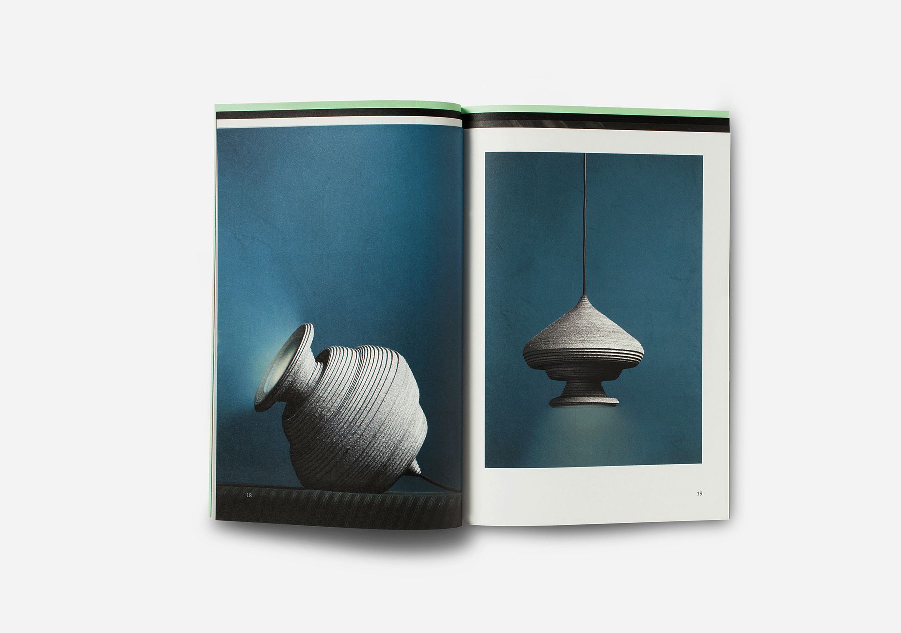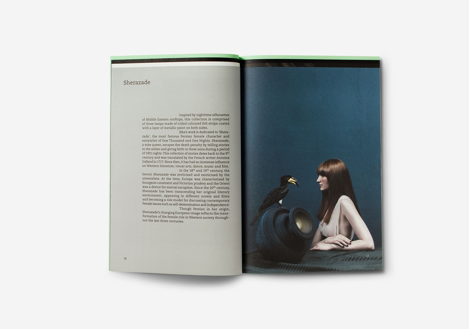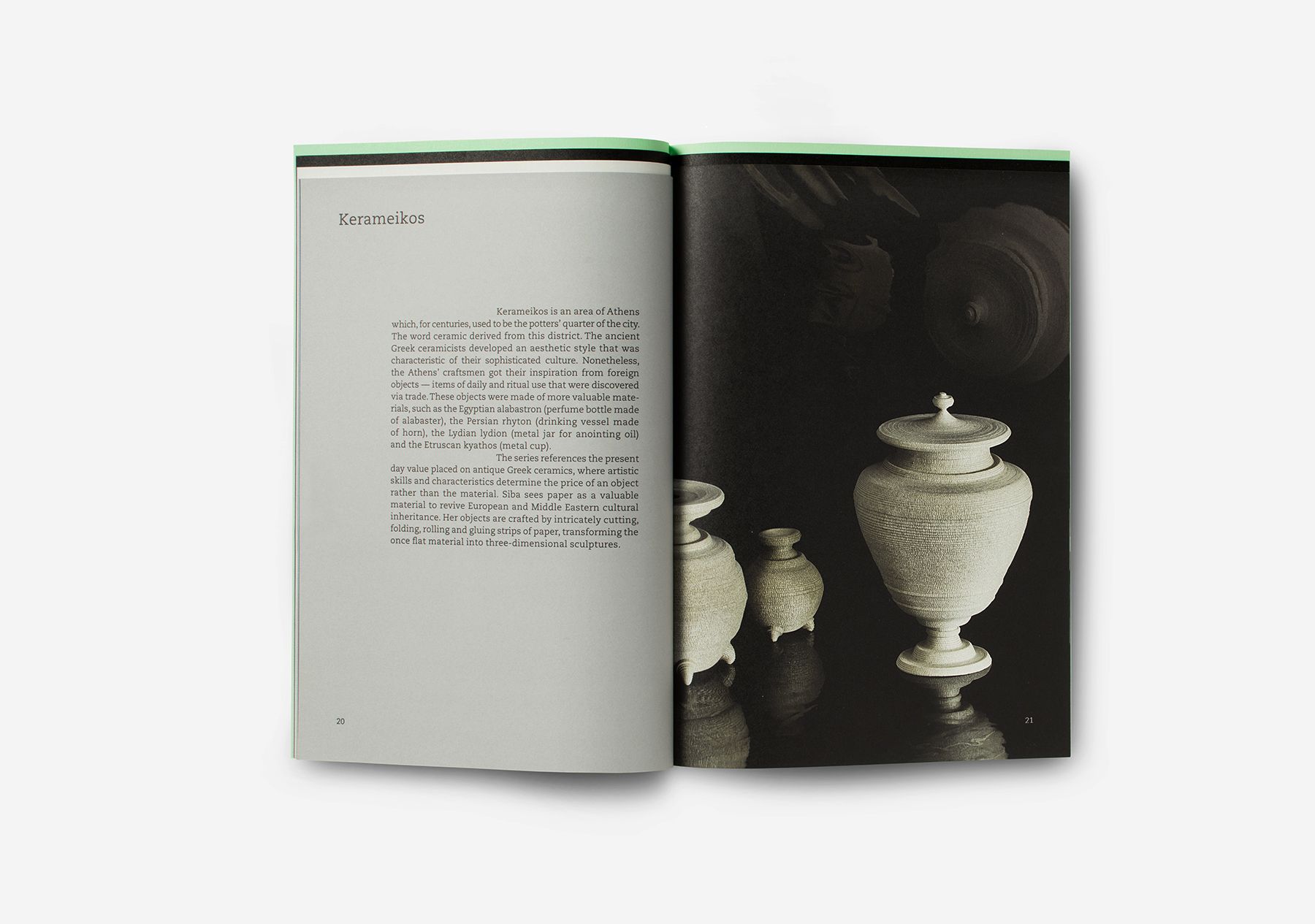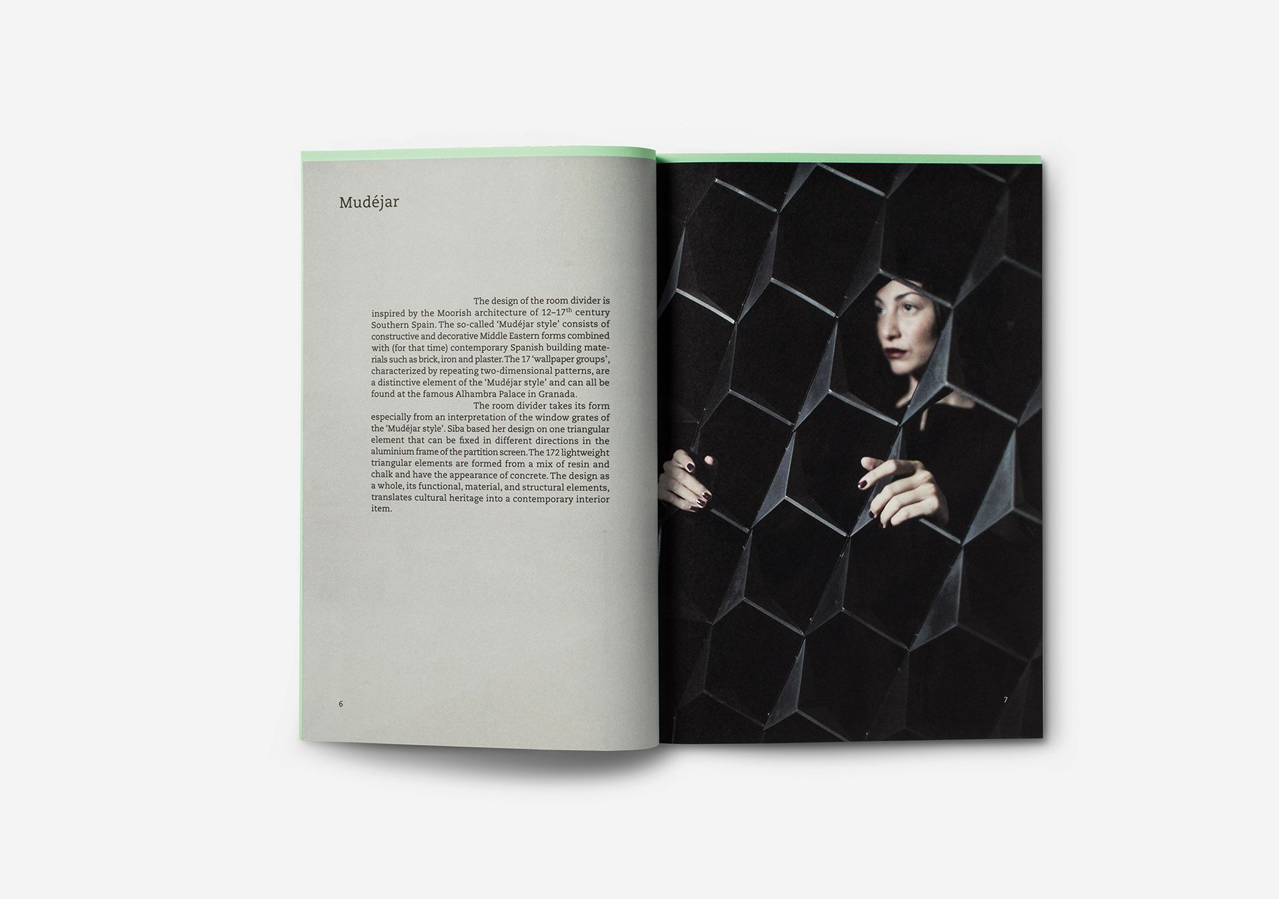 A brochure showing the paper sculptures of designer Siba Sahabi. The layered positioning of the paper in the back of the booklet is a reference to the type of craft that Siba uses. This element of creating layers returns in the inside of the booklet.