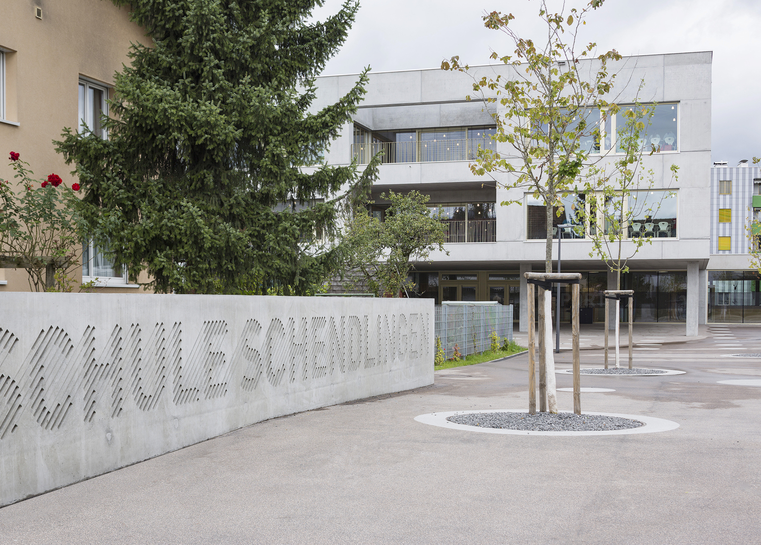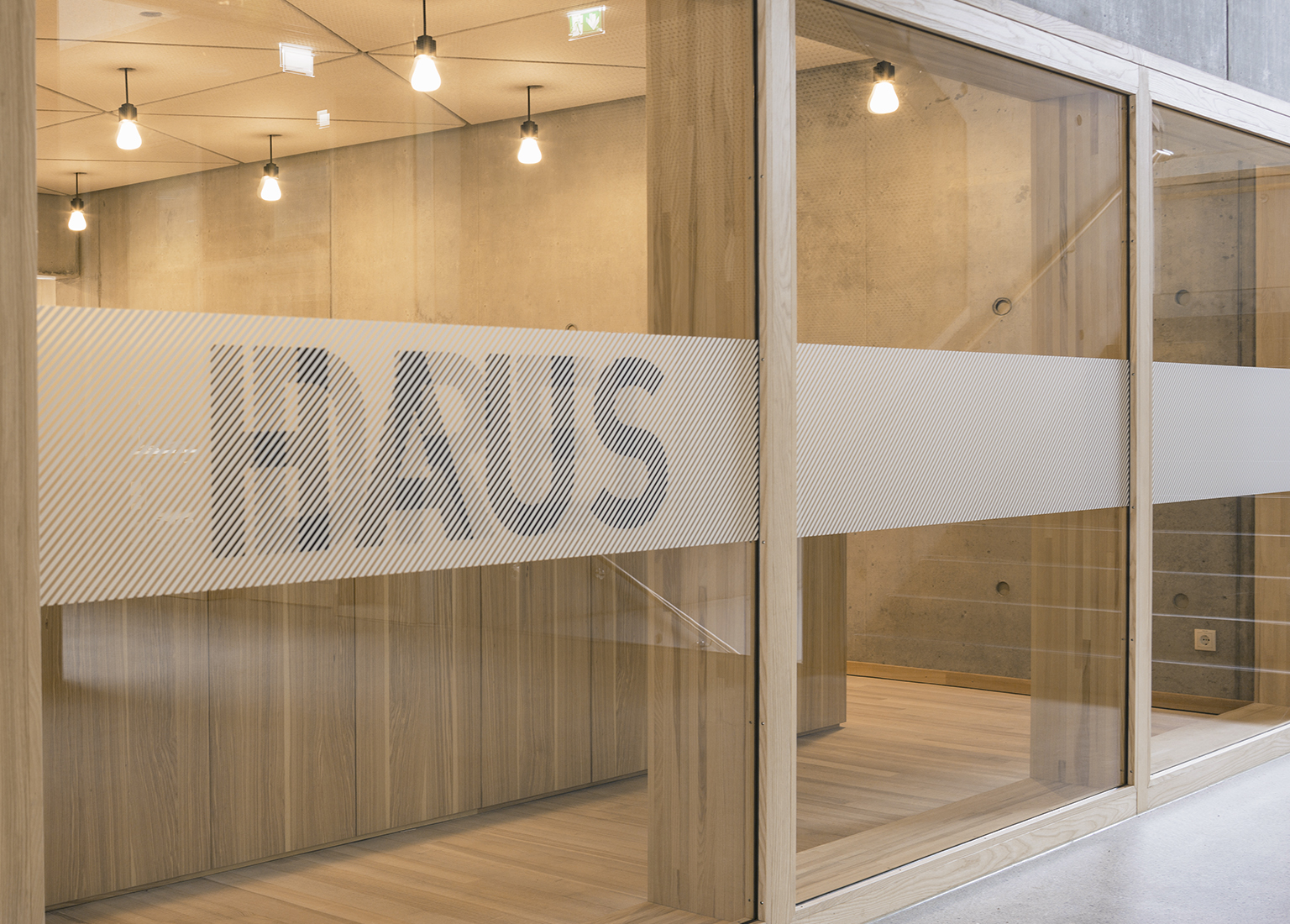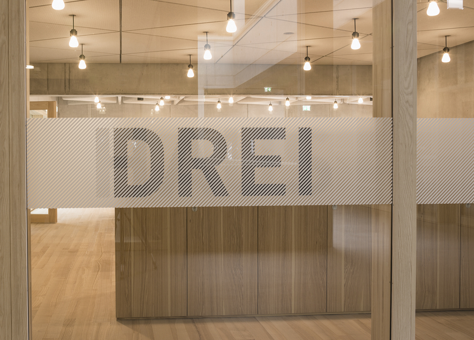 In large public buildings graphic symbols, lettering and signs are often used to help people find their way around. In the case of the orientation system for the newly built Schendlingen School in Bregenz the designers of Atelier Gassner, a studio whose reputation has long spread outside the region, have succeeded in a coup. The signage here is made up two words placed prominently on the glass partition walls to important areas and rooms. However, these words do not simply stand beside each other, they run over each other. In addition they are connected by the cross-hatching called for by the building regulations in full-height glass walls to prevent people from walking into them. Out of these normative constraints Atelier Gassner has succeeded in generating a communicative and artistic added value. As you walk by these typographies, depending on the particular location one word or the other appears clearly legible, as if by magic, but in-between the interferences of the overlaid letters and lines create their own delightful, constantly new game.