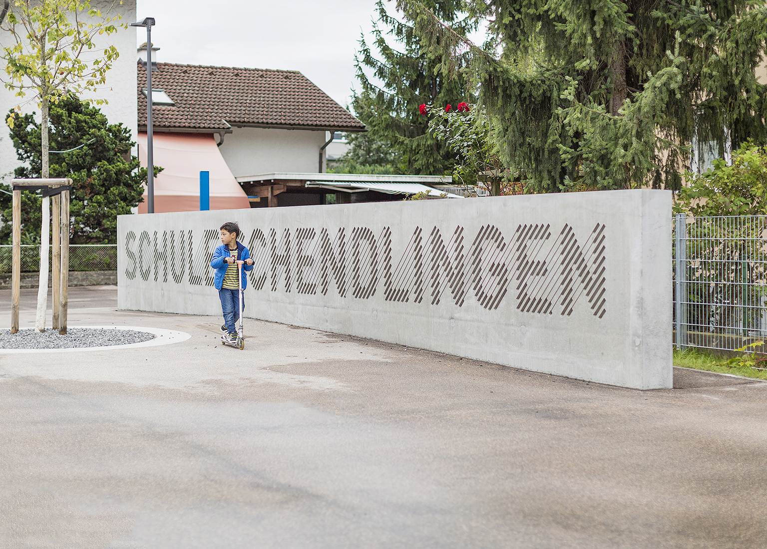 The signage outside the building varies this connection of cross-hatching and letters and interprets the graphical elements in the interior in a way that is appropriate to the materials used outdoors. The relief-like lettering is cast directly into the specially made exposed concrete parapet walls at the approaches to the building. Here the play of light and shadow creates a texture that changes during the course of the day.