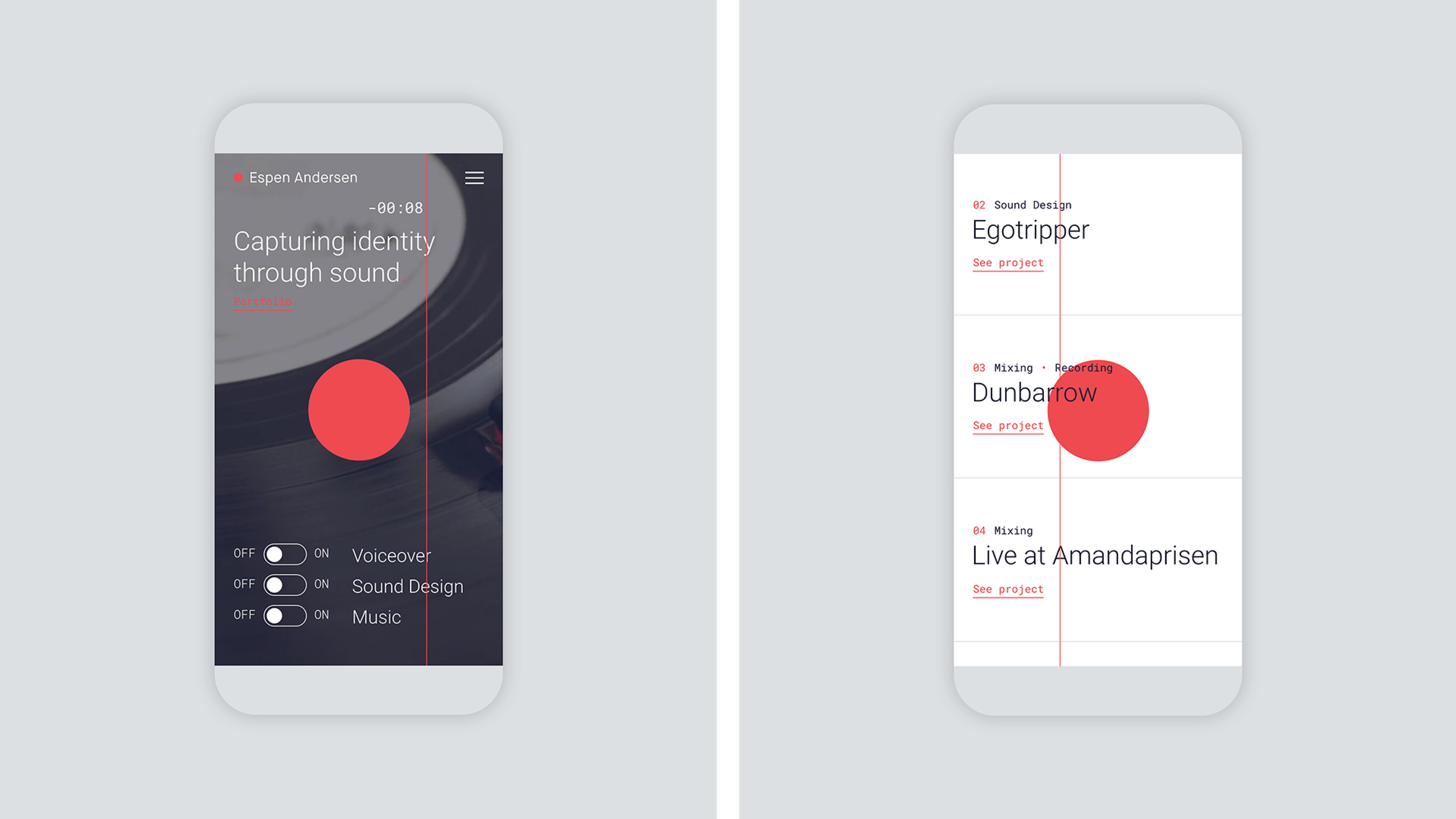 Espen Andersen is a music producer and sound designer. He works with musicians, advertising agencies and other creative fields. Deciding to establish a more professional freelance approach, our task was to help Espen establish a brand for himself and his services, help communicate his creative philosophy, showcase his work in an engaging way and attract new business. Working with a variety of creative clients, it was important that the visual identity spoke to and reflected the creativity of his audience.