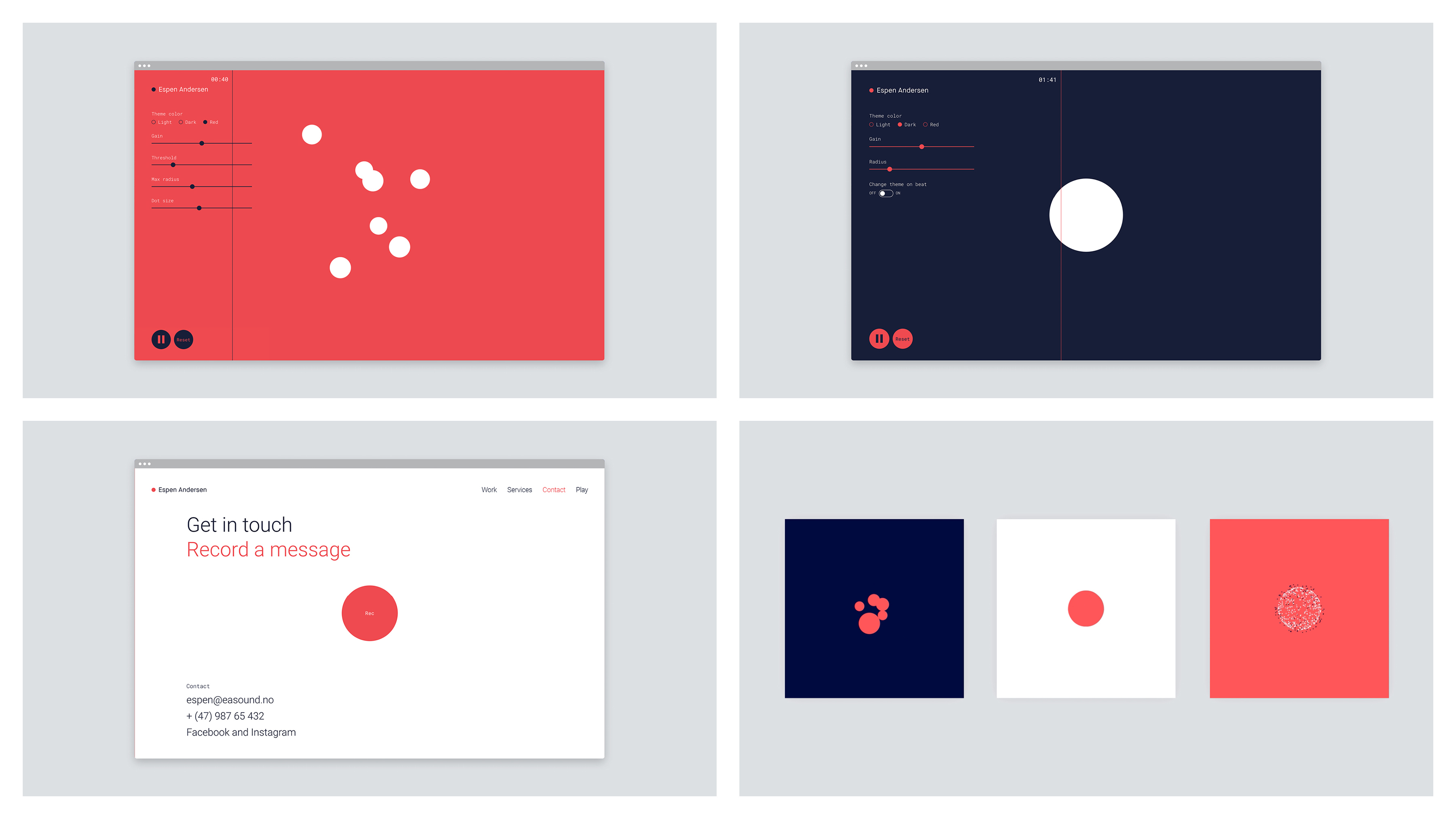 Working with technology, his communication needed a strong digital presence. When launching the new brand/website we used SoMe as a way of engaging new clients. Communication used the brand identity in various ways to trigger different audiences. A variety of films/imagery used the recording symbol in communication. The interactive film shows the impact of sound. A blinking “ready to record” red dot targeted at ad agencies. The visualizer allowed Espen to produced branded content for SoMe.
