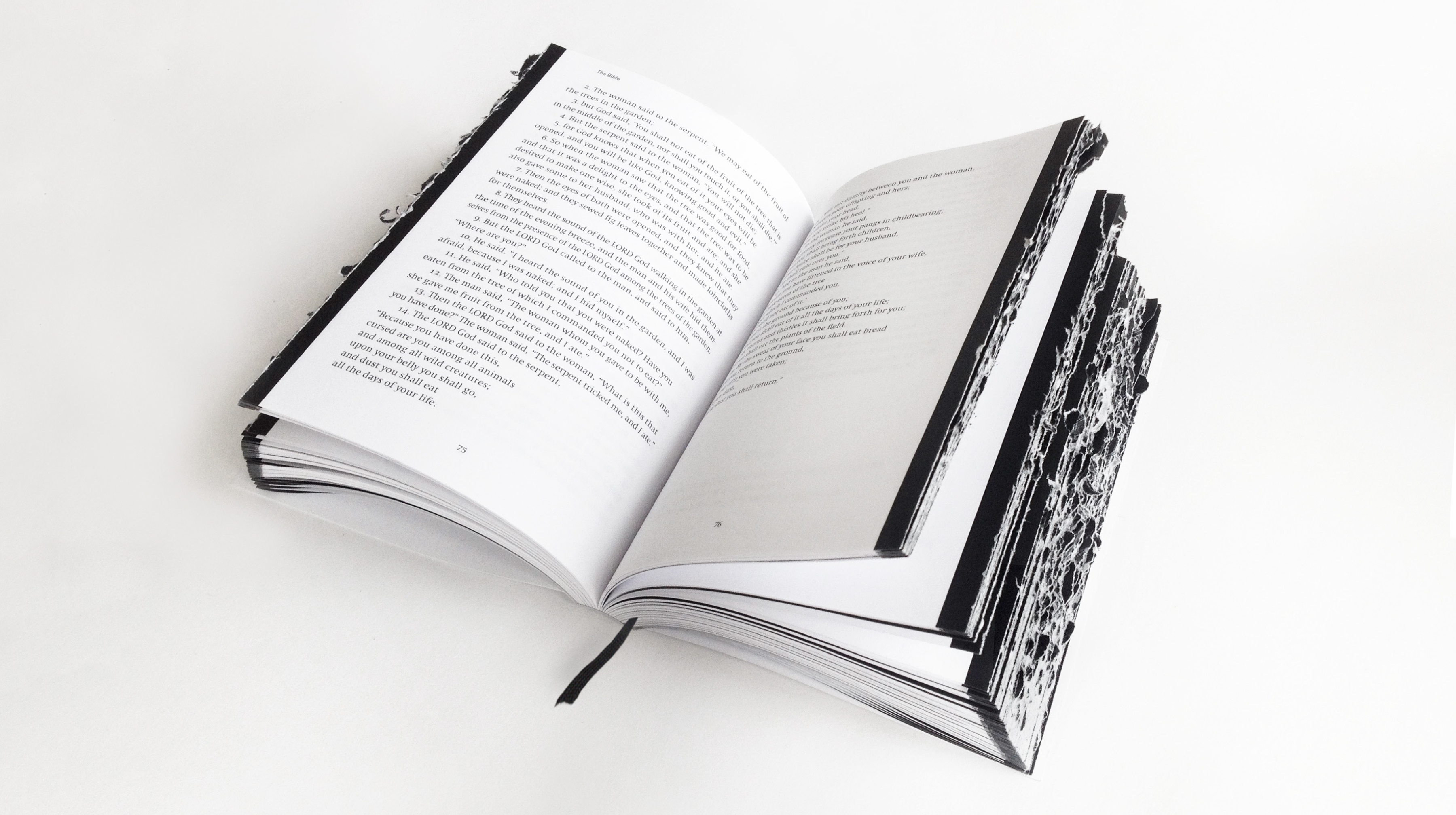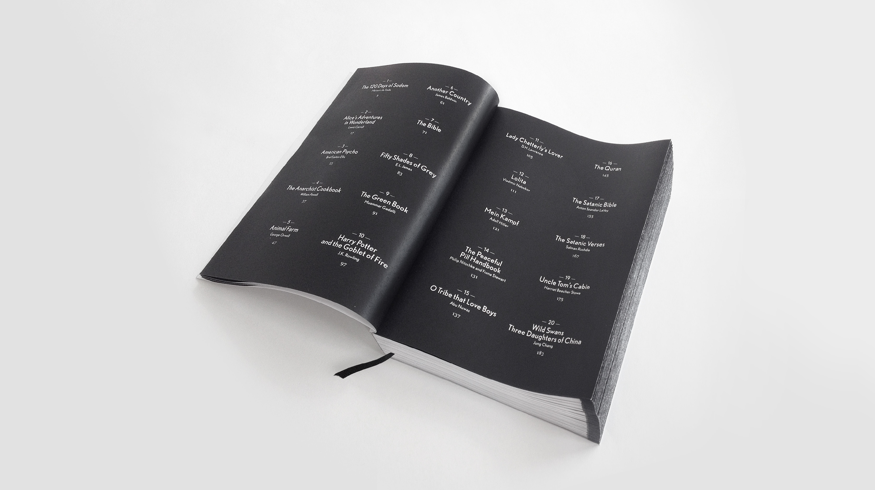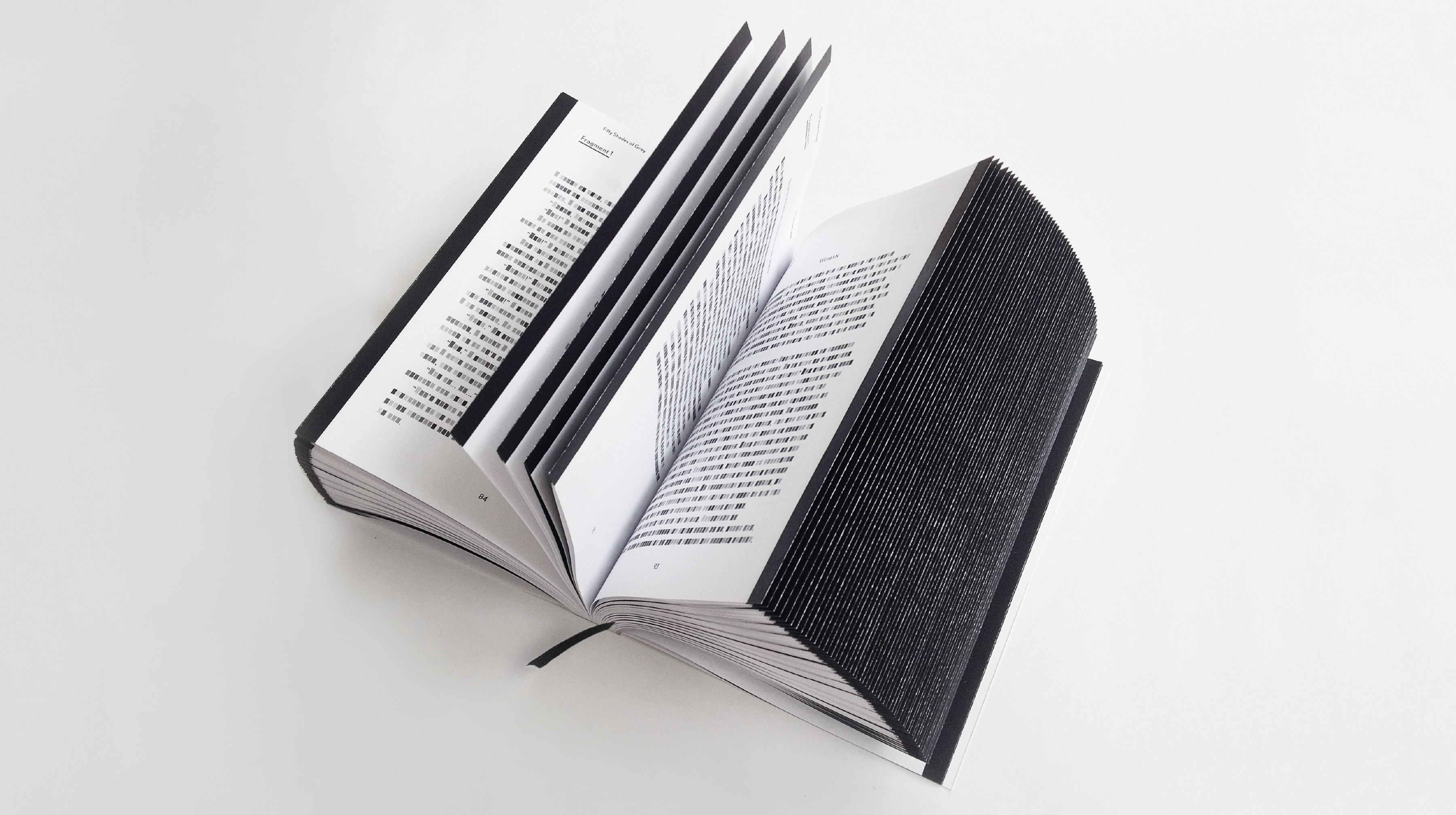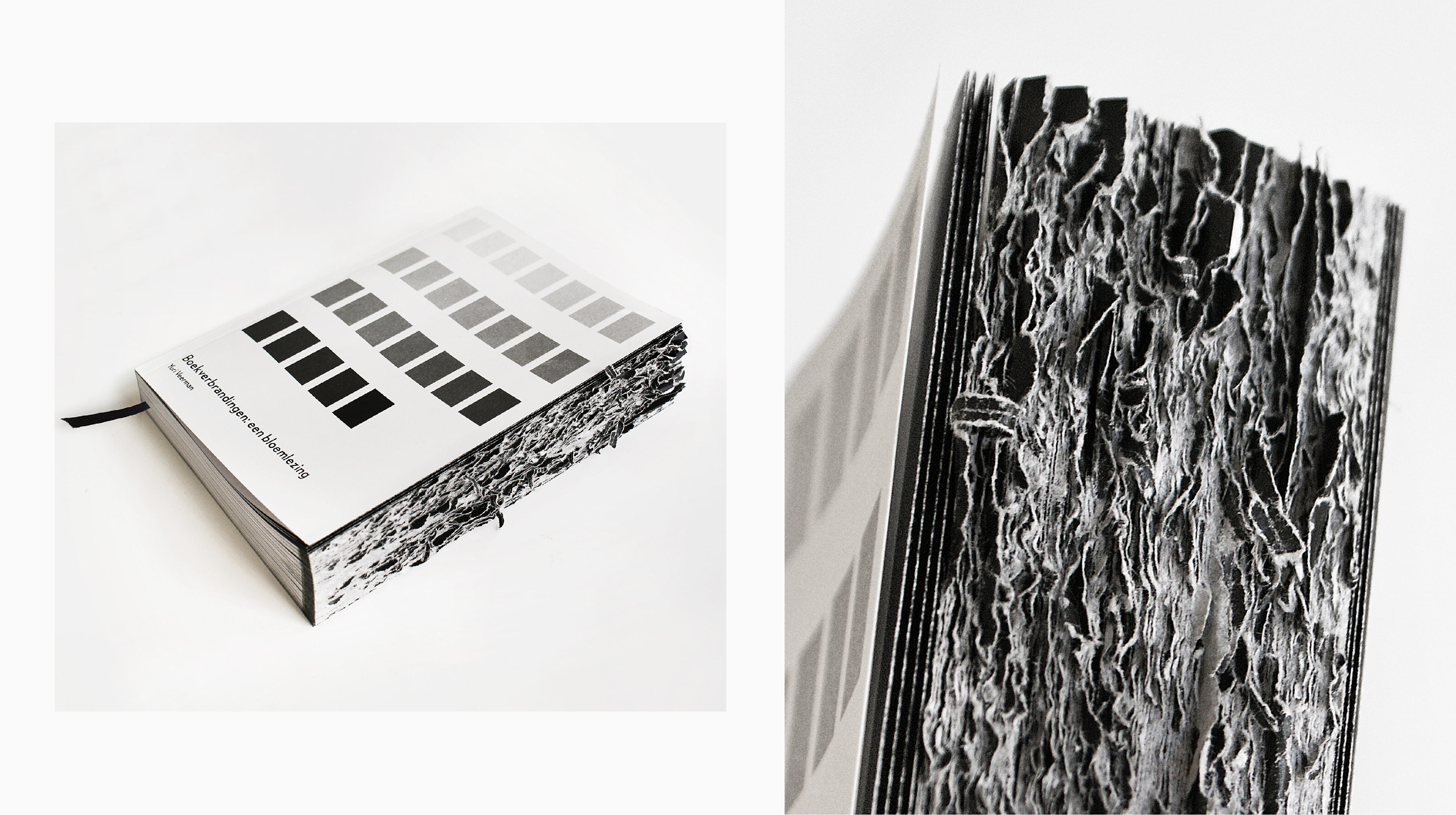 The publication, printed entirely in black and white, consists of 404 pages containing fragments from 20 books that have at one time or another either been forbidden or burnt somewhere. Books such as: The Anarchist Cookbook, Alice in Wonderland, Mein Kampf, American Psycho, and Harry Potter. The book pages have Japanese folding: each fragment is printed in coded form on the outside of the folded pages. For this purpose I created a typeface, built up out of squares. Starting with a very light grey ‘A’ the letters gradually increase in intensity. Culminating in a black ‘Z’, they form 26 shades of ash grey. After tearing open the Japanese folds a legible version of the text appears.