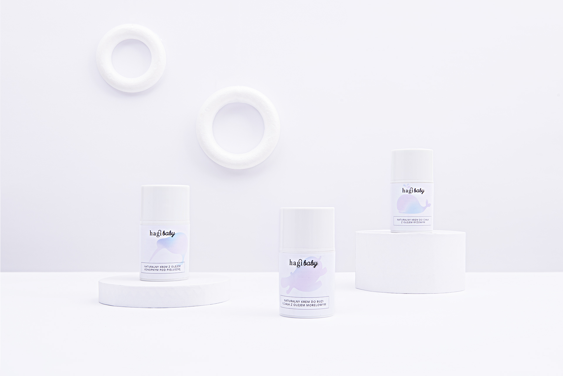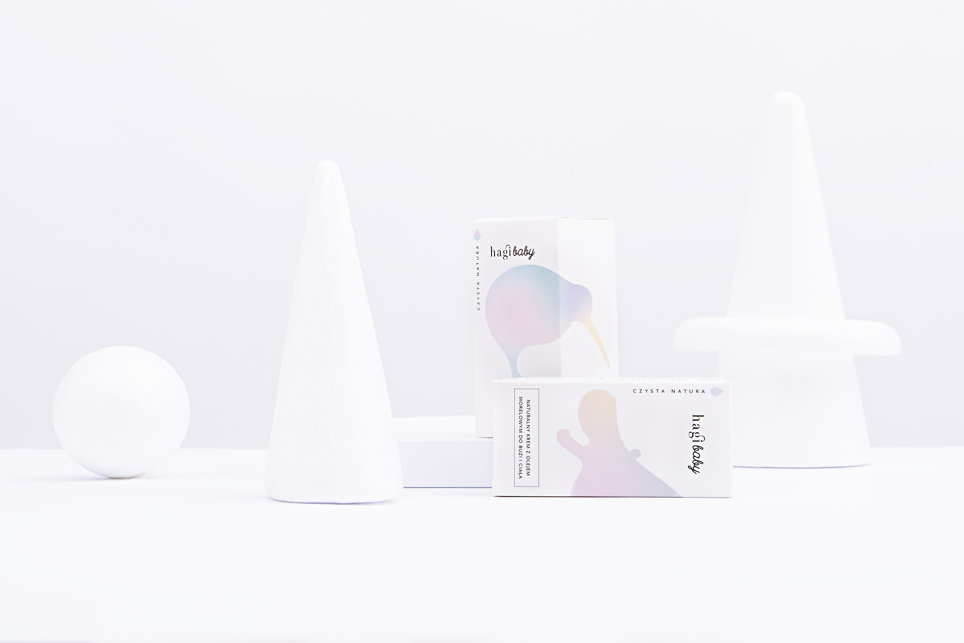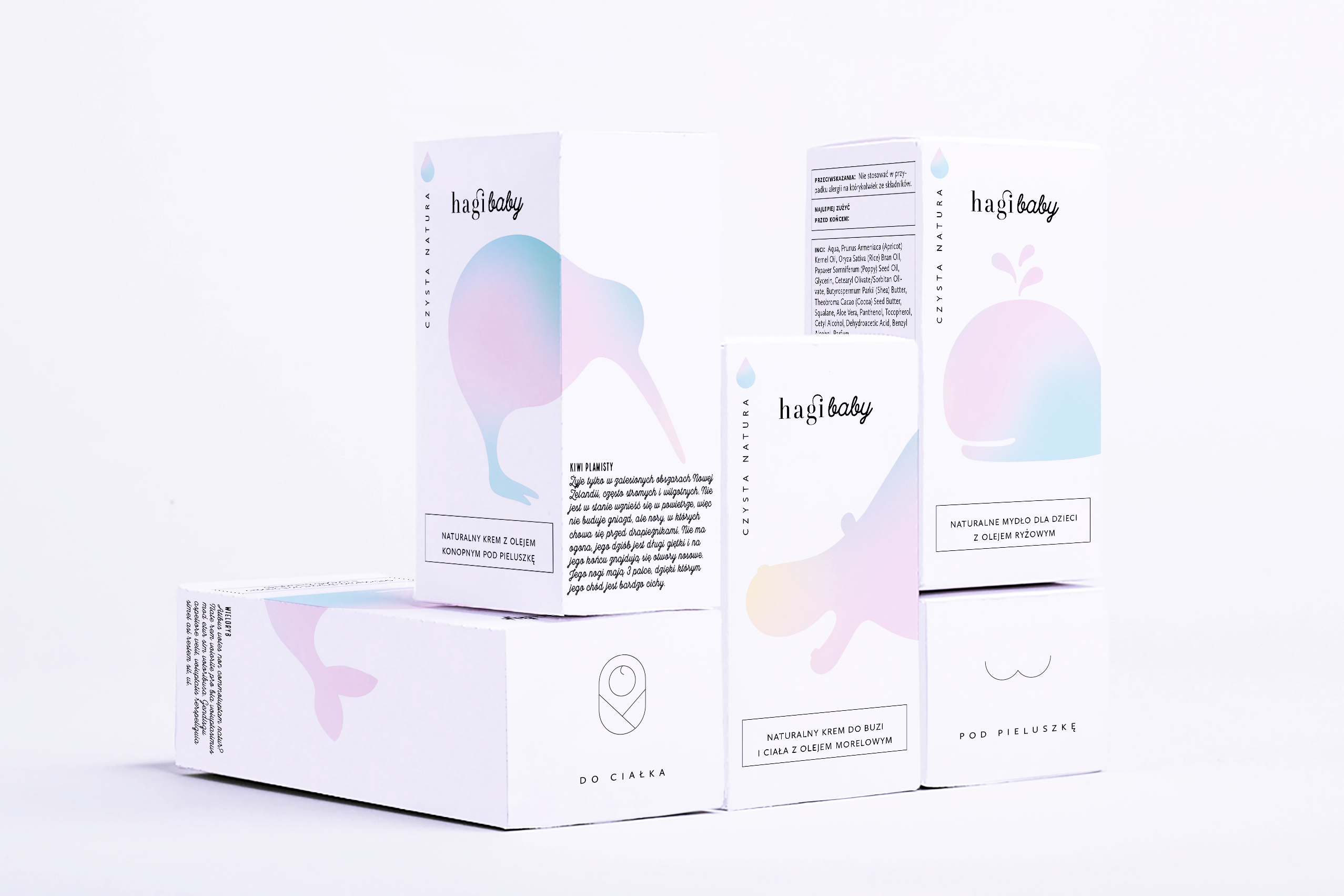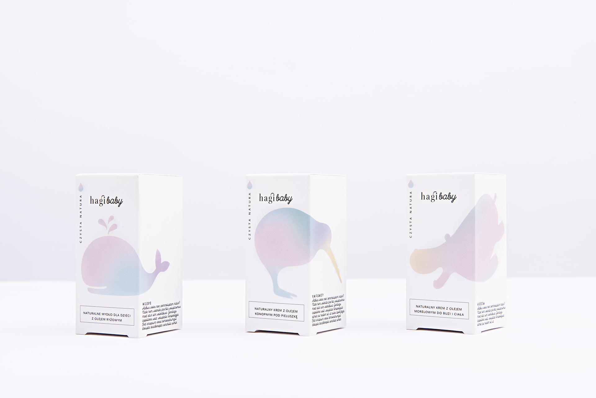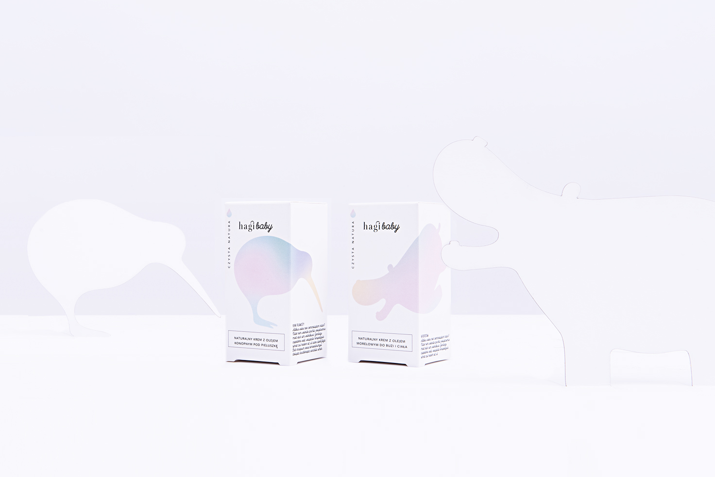 Packaging for Hagi Baby—natural hand made cosmetics for babies. The project includes packaging design for a series of creams. Hagi is a brand driven by respect and love of nature. The products are manufactured on a small scale, with no additives and a clean process. The design combines drawings of animals with simple, minimalist typography. Overall, the visual language tells the story of natural and safe products for children in a modern, clean language.