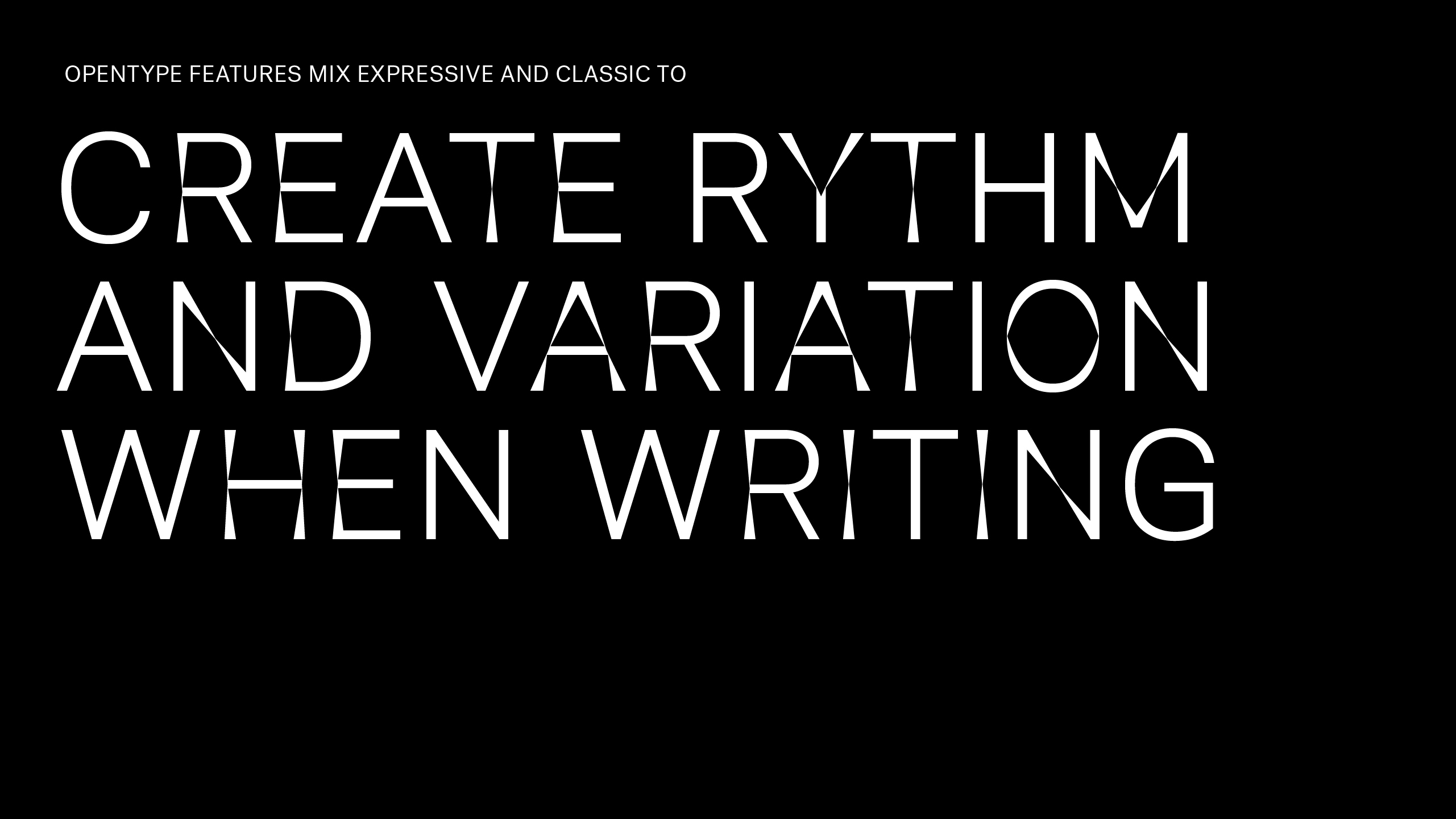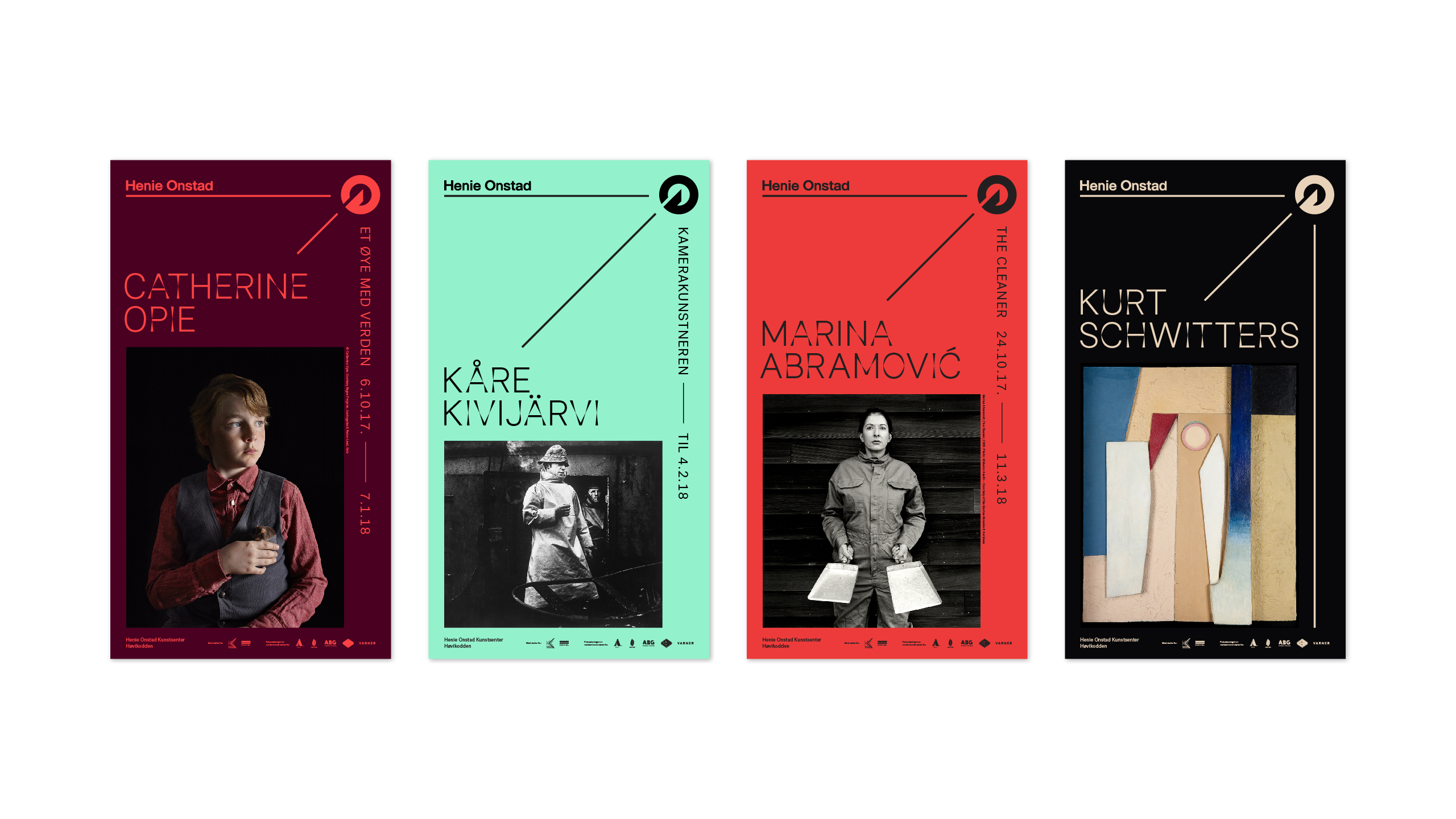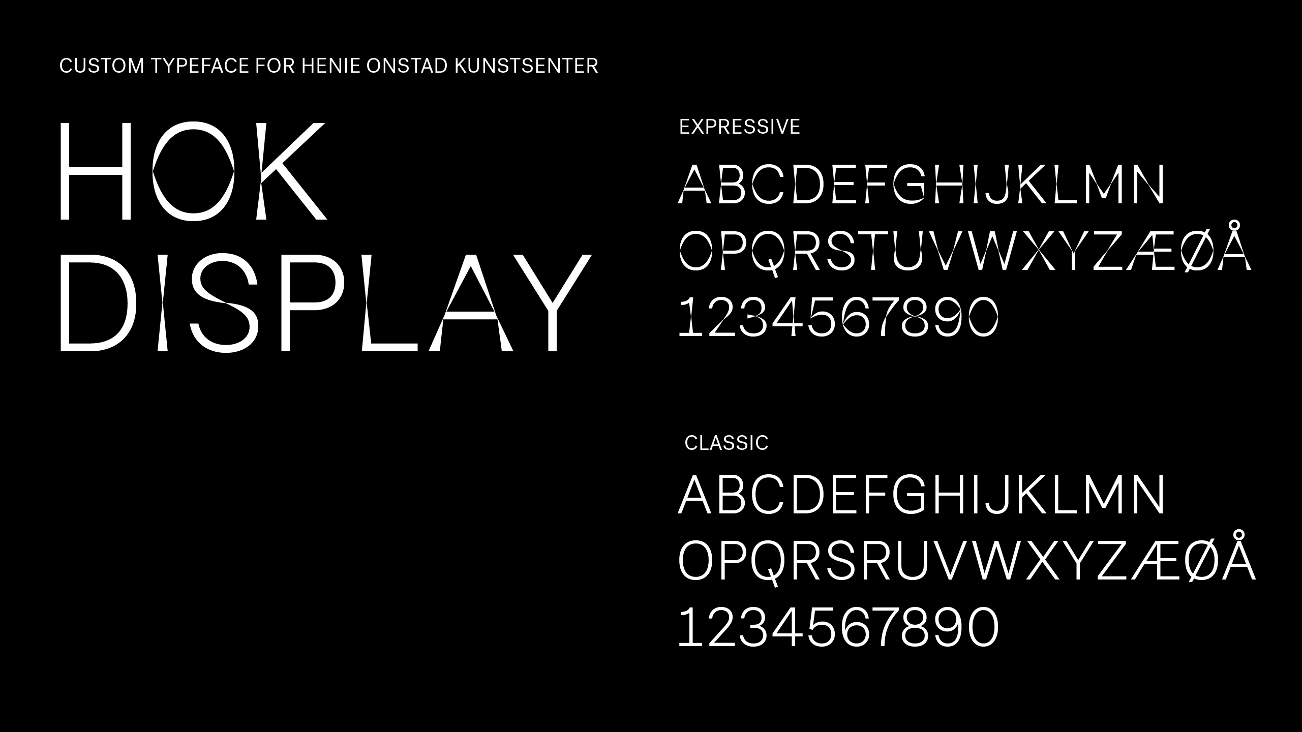 The variation between the classic and the expressive mirrors Henie Onstad’s artistic profile, which consists of art from both well established artist and young contemporaries. Furthermore, it invokes the breaking of light—a suitable effect as it was important for Sonia Henie that the exhibition rooms were rich in lighting. HOK Display is a main identifier in Henie Onstad Art Center’s identity. Since 1968, the logo has been based on a characteristic staircase from the building. So this font is also based on the architecture. The center was designed with no 90° angles, so by removing all such angles from the letters, we found an expressive distinctiveness which became the foundation for HOK Display. The font was also drawn in a classic grotesque version. Through Opentype features we used this version together with the expressive version in each word. This gives the font a unique expression, contrast and rhythm.