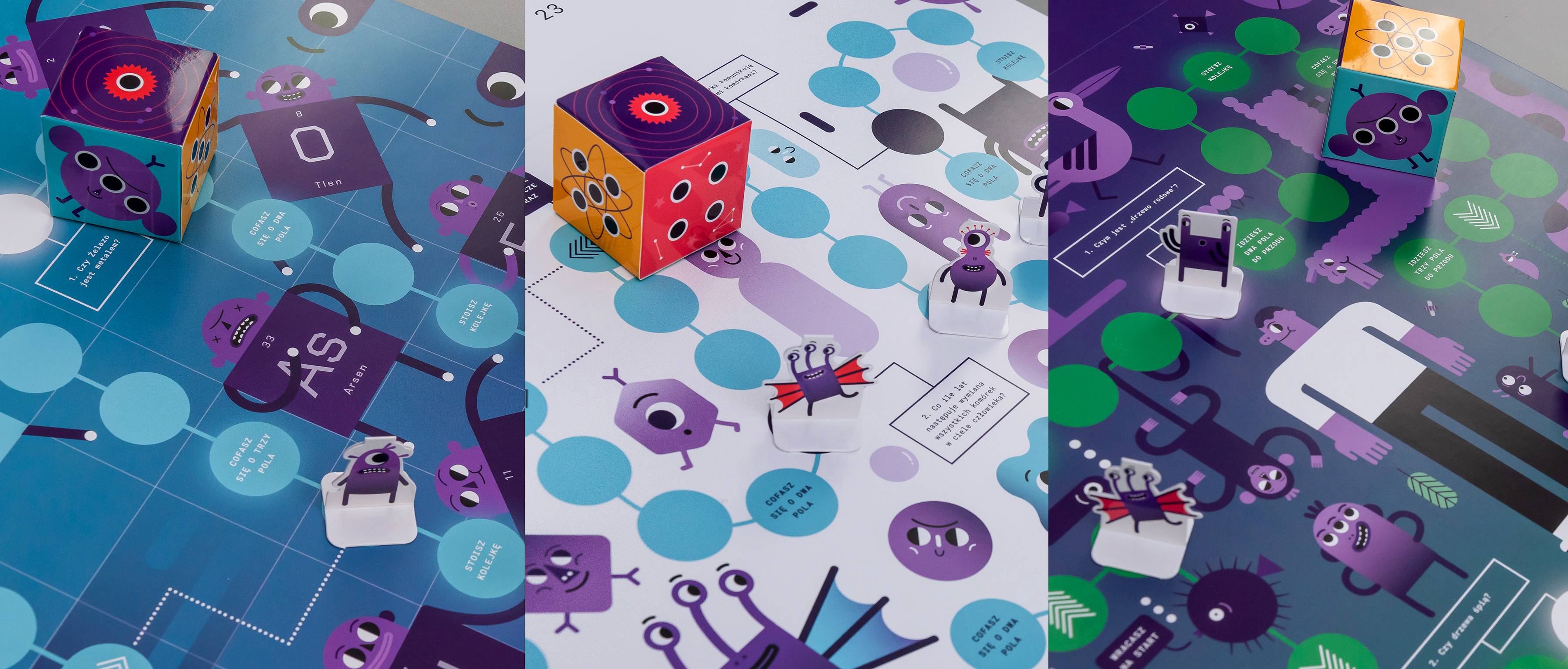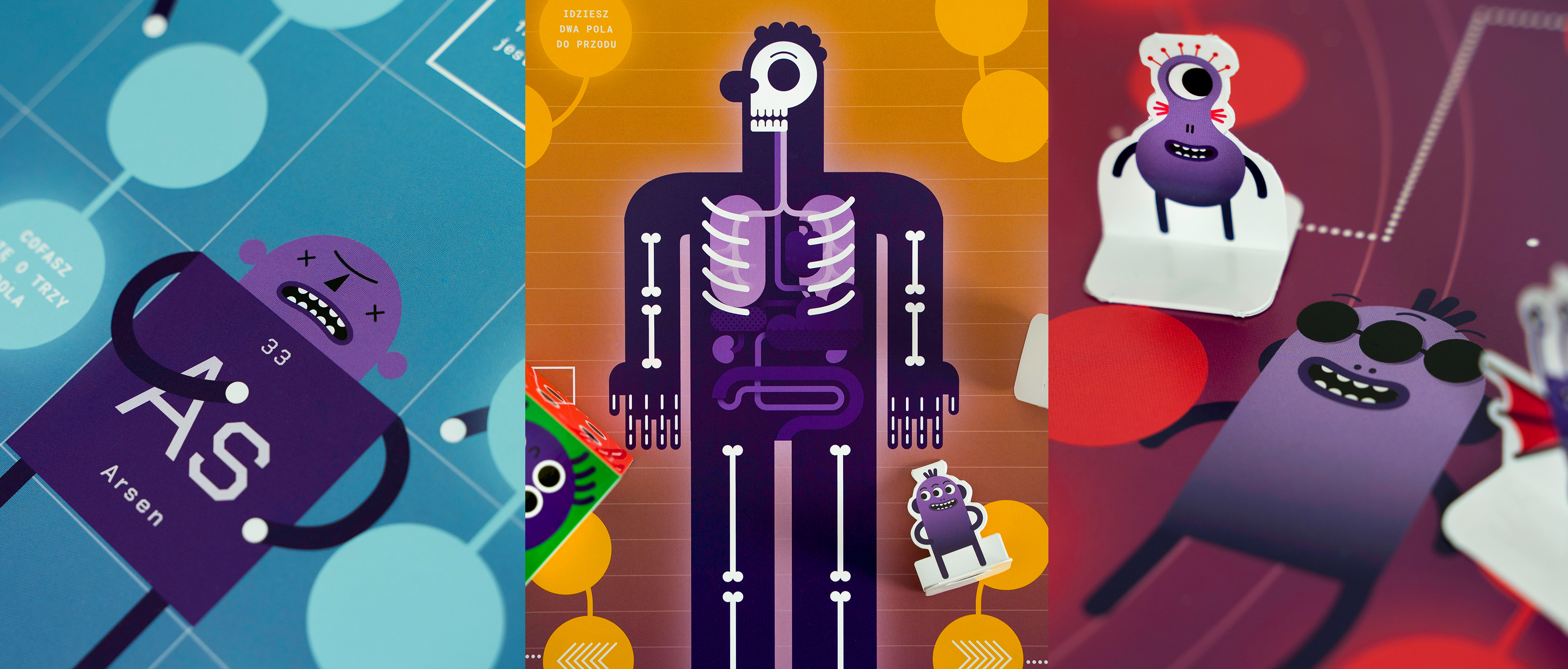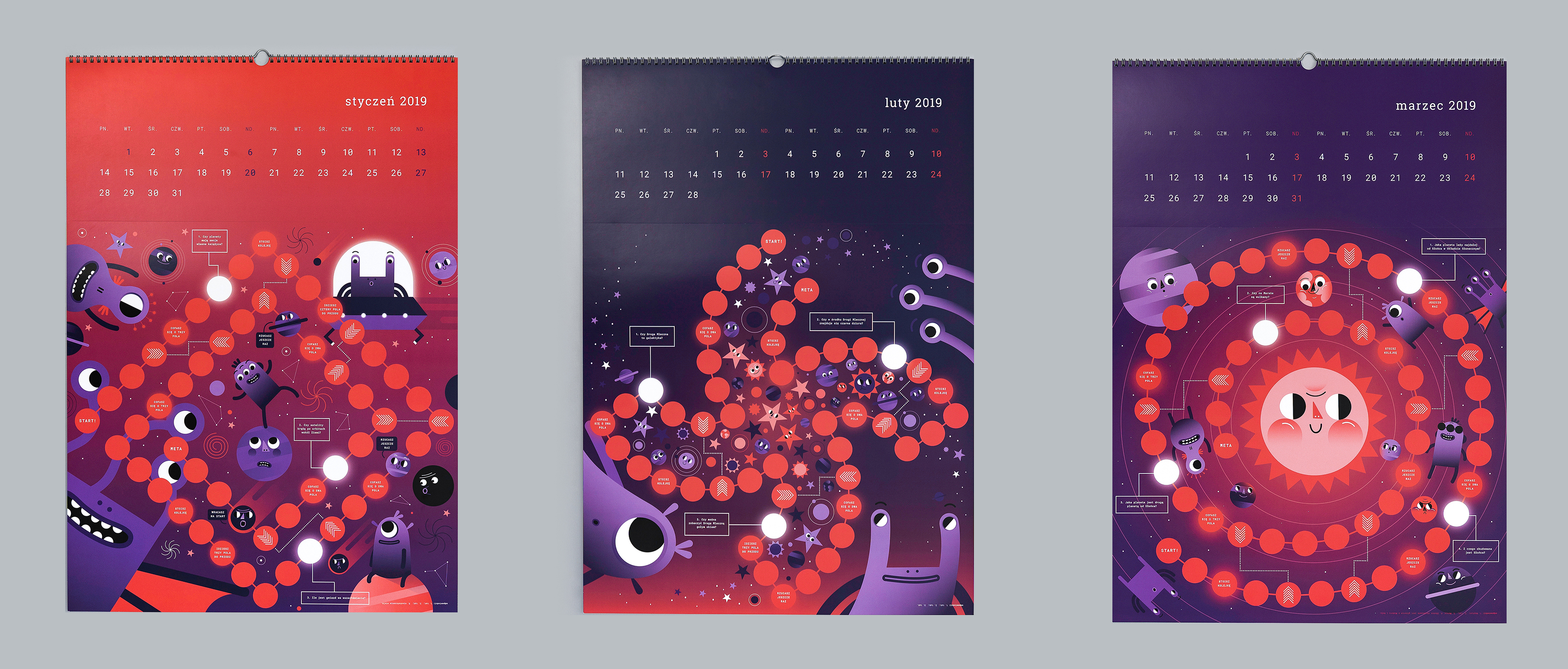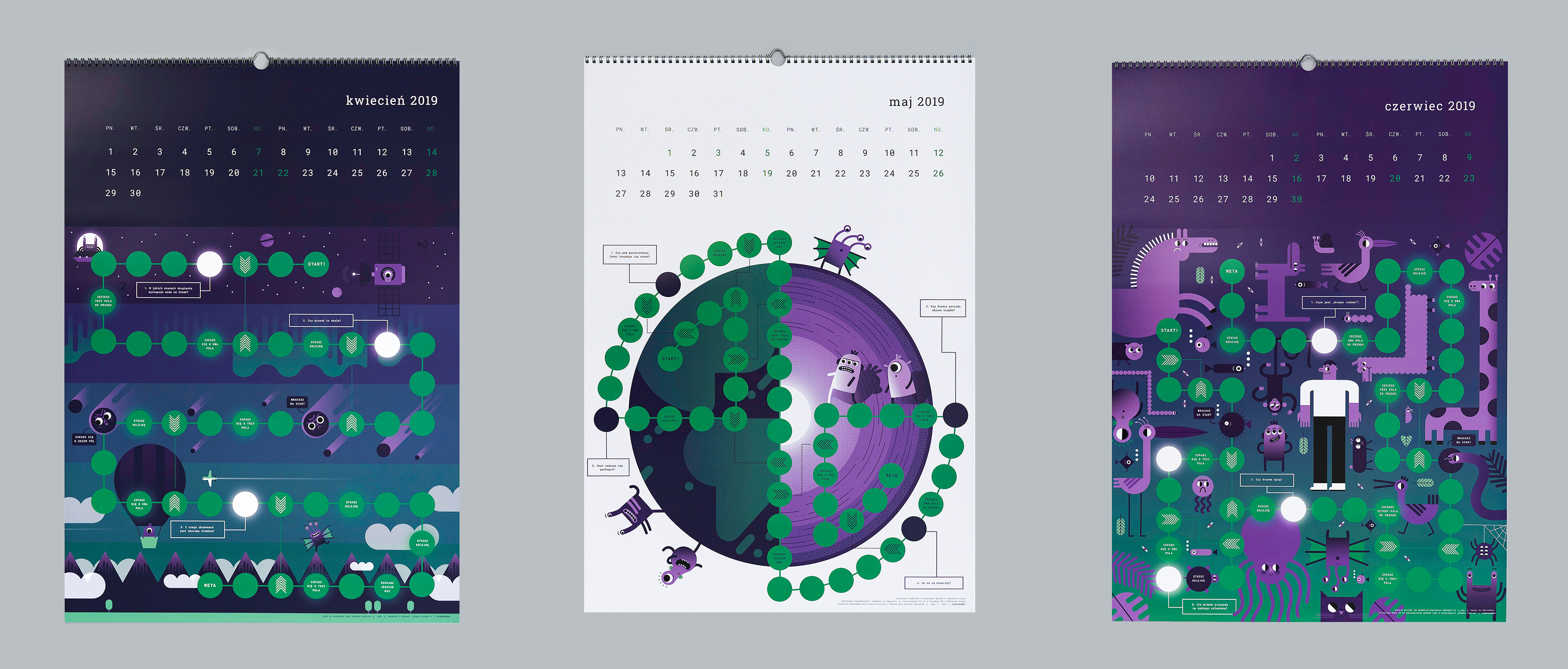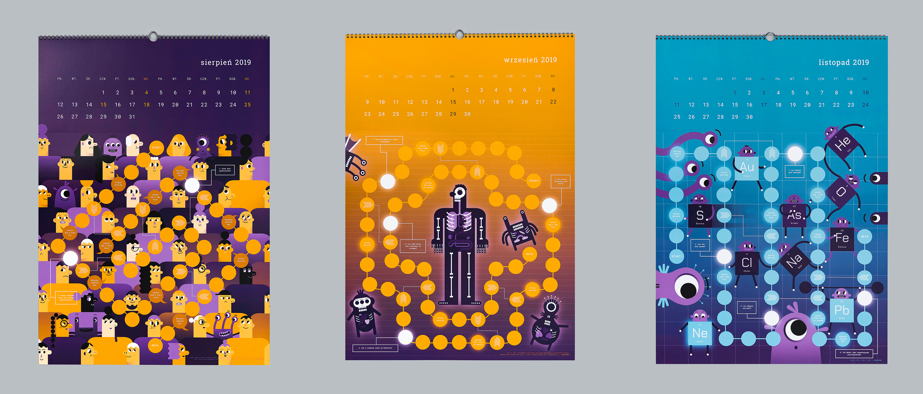 The theme of this year's calendar is a journey from the macro world to the micro world. The publication has a board game form with 12 boards and attached pawns and a cube. The quarters of the year in the calendar were divided thematically into SPACE, EARTH, MAN and MATTER. Each of the calendar's cards is devoted to a different topic presented by illustration and touched upon with questions in the game. The game pawns represent the main characters of the calendar- the aliens, who came to Earth and try to get to know it.