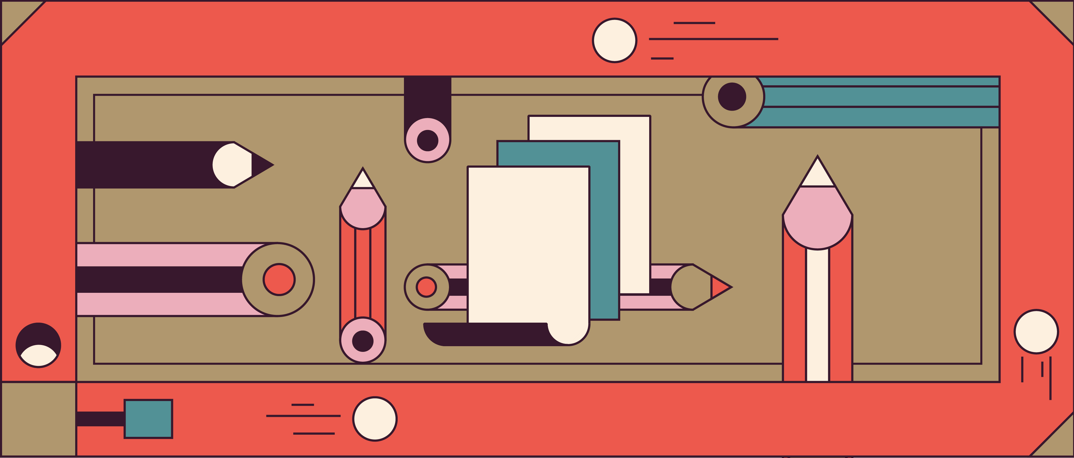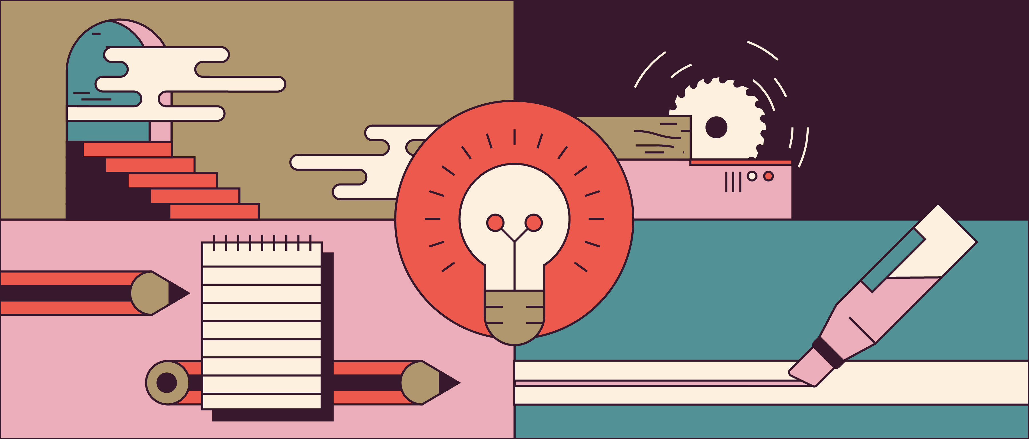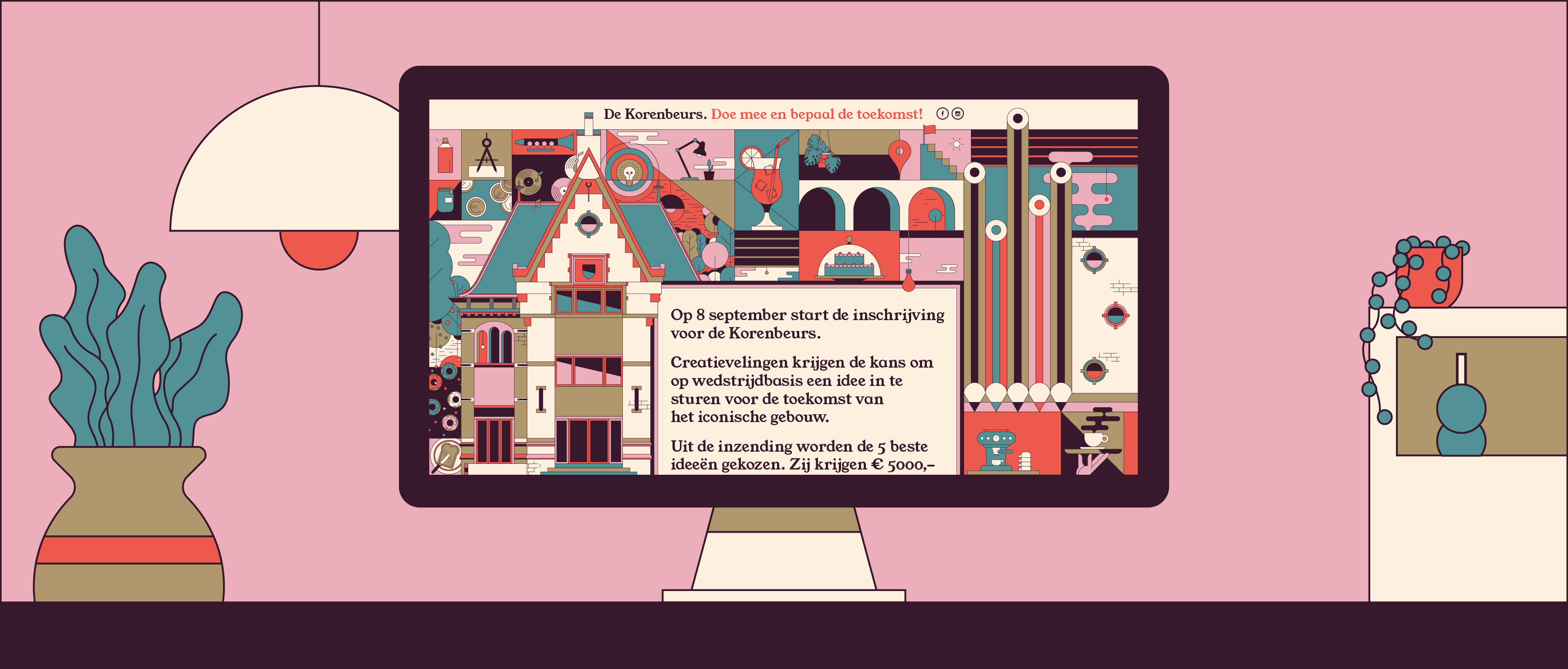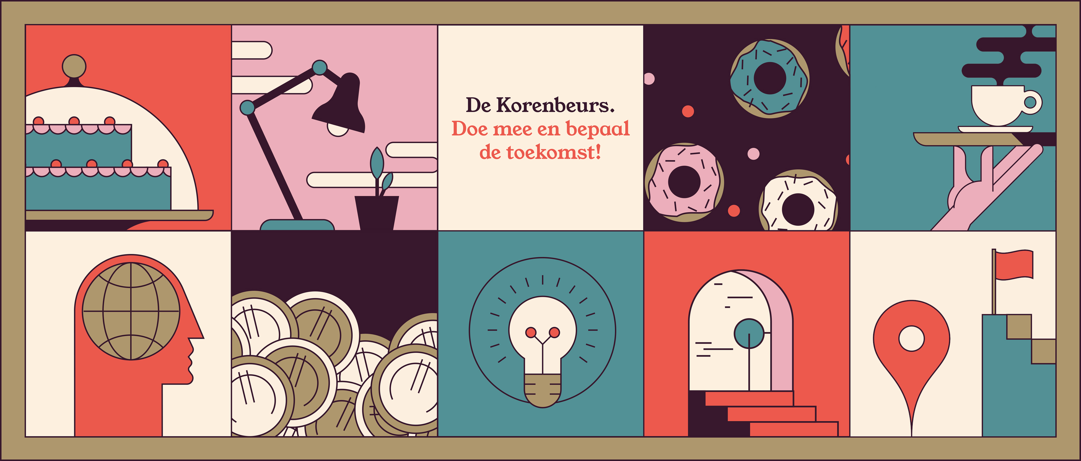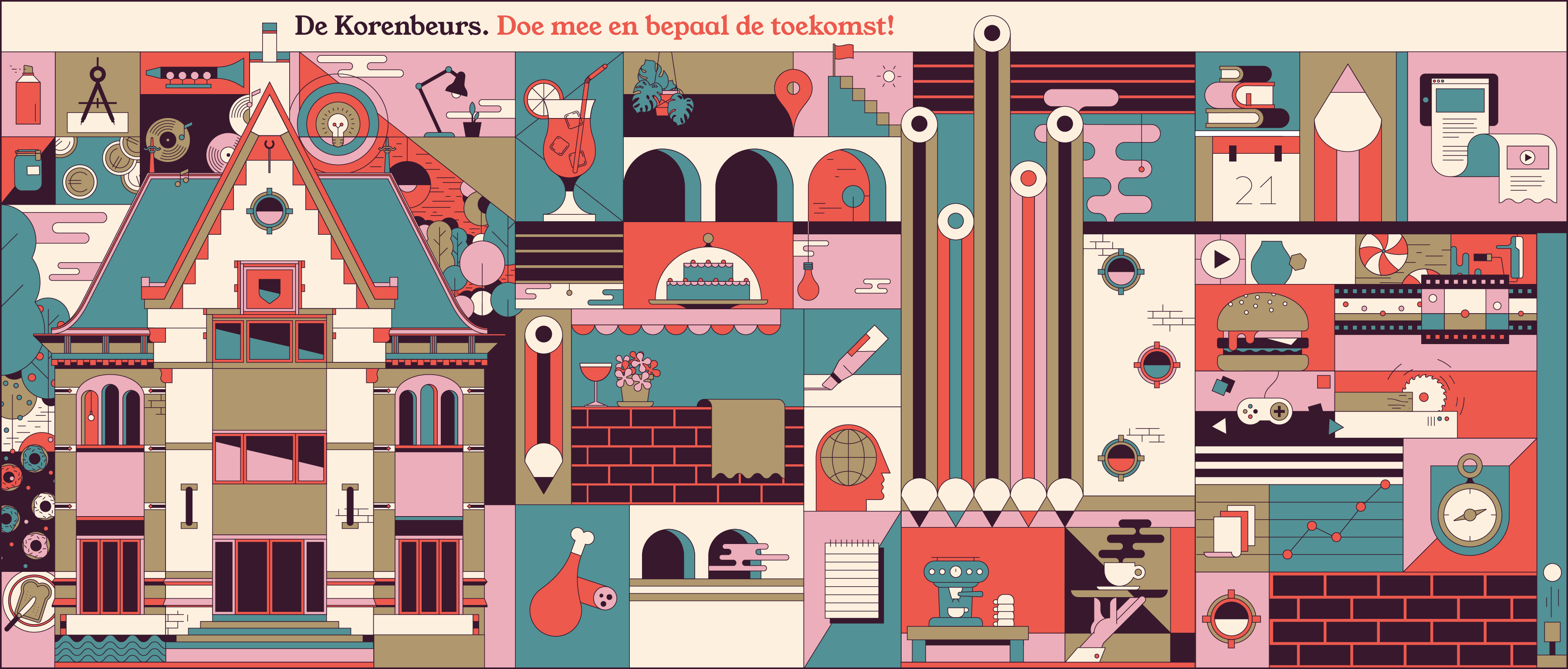 The goal was to get them to think of an idea to give “De Korenbeurs” – a vacant historical building in the center of Arnhem – a new life. How do you inspire someone to think of ideas for a city? You illustrate a city… made of ideas. Even though every illustrations shows a different style of creative problem solving the iconic art style, bold colors and straight lines kept everything cohesive and recognizable as part of the bigger campaign.