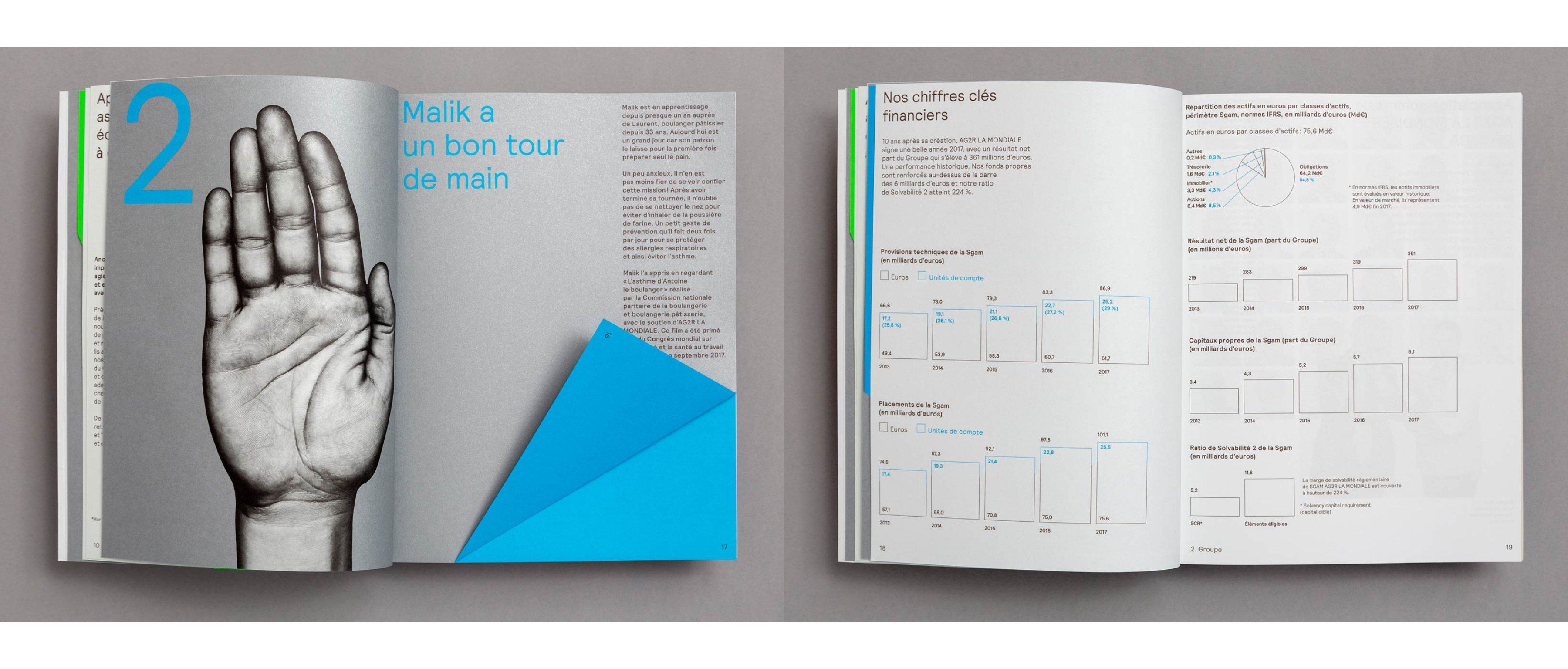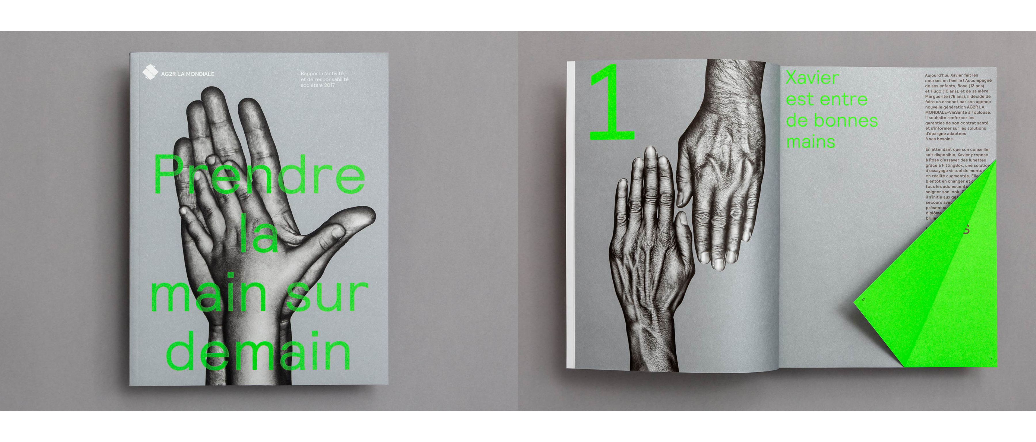 This is the first annual report designed based on the new visual identity and the unique company proposition: "Prendre la main sur demain". The tagline translates to "Being empowered for tomorrow", but in addition to this core message, the French expression evokes beautiful and subtle several meanings around the hands, like giving a hand or grabbing the hand. The tagline is the starting point of the new visual identity and this annual report.