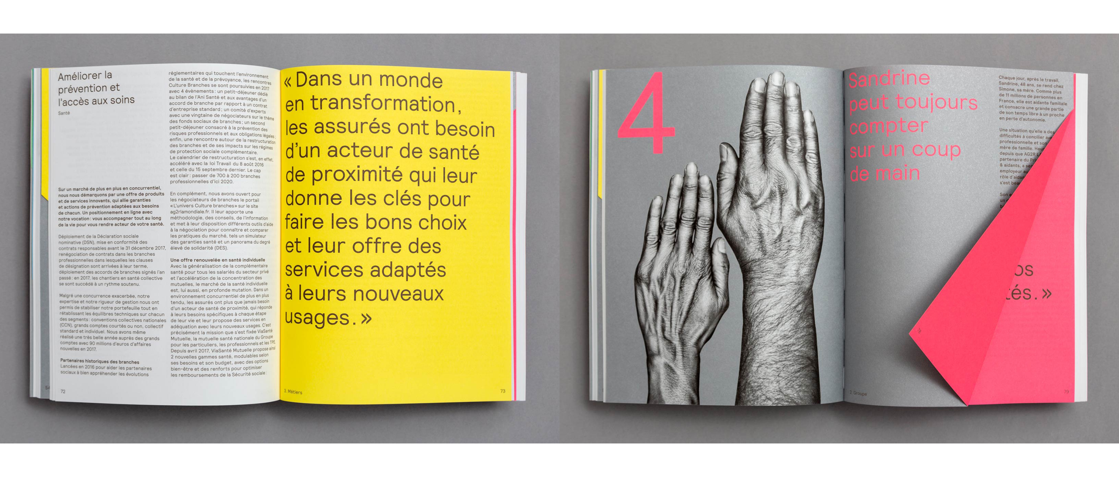 The graphic design and style are reflecting this unique approach by looking social (very simple spreads with monochrome brown text and black & white photographs) but at the same time extremely premium (fluorescent Pantone colours, real paper folds to mark the chapter openings, premium photos of hands printed in black & white and silver). The "fold" is the core element of the new visual identity; it gives volume, depth, sensitivity and intrigue. It is a potent symbol for an insurance company caring for life where one has to turn pages with joy and dignity, from birth to elders. The annual report is a straightforward publication made for the people, easy to understand and comfortable to read.
