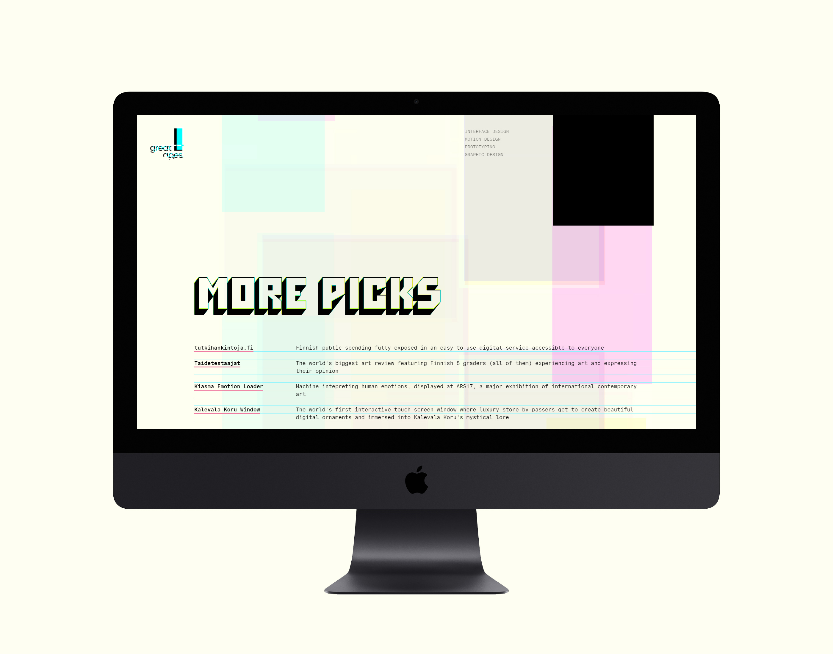 Nearing our 10 year anniversary we were in desperate need of rebranding and a new web presence. Although our brand was already very recognized in the B2B market of digital design in Finland it was getting slightly outdated. The new website was designed to target clients in need of design and development of innovative and experimental projects and people (potential recruitment candidates) who could deliver them. Our logo – the monolith from 2001: A Space Odyssey – was used as a design element.