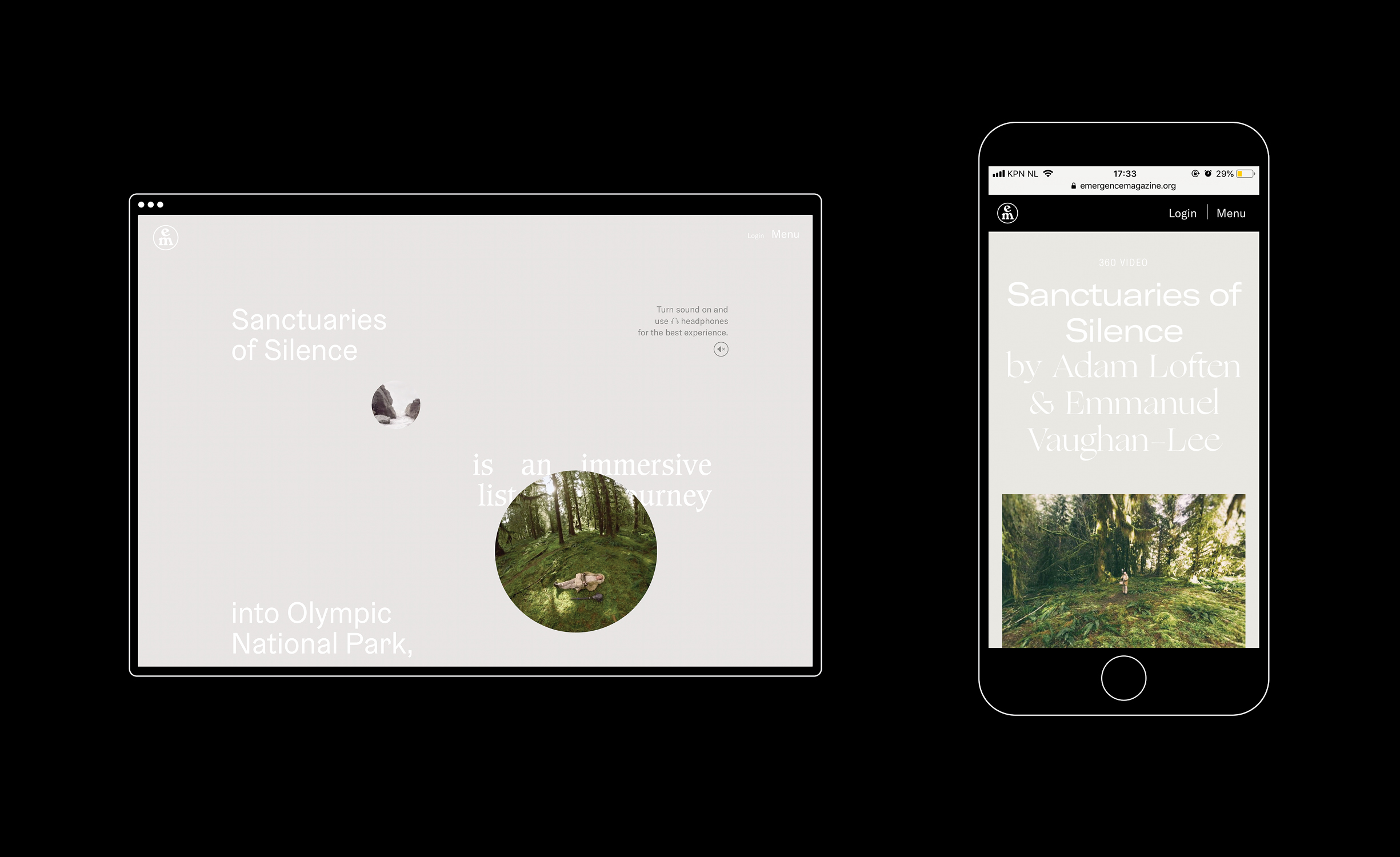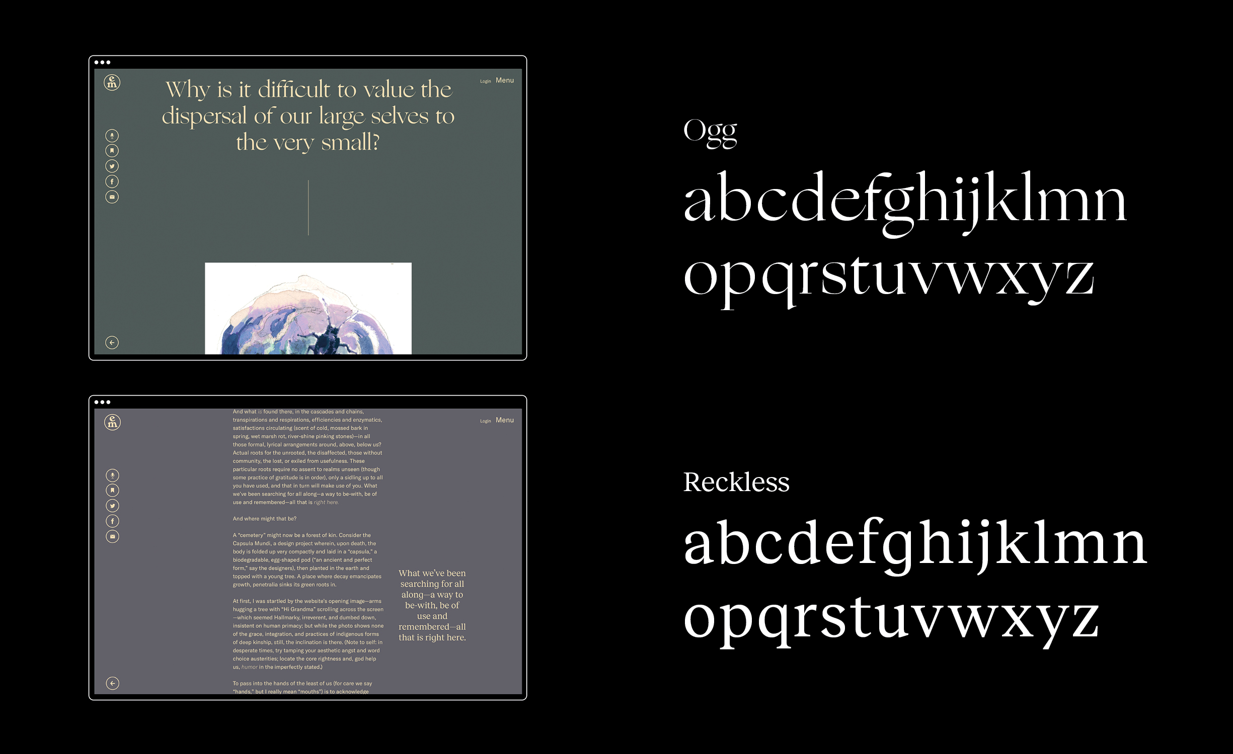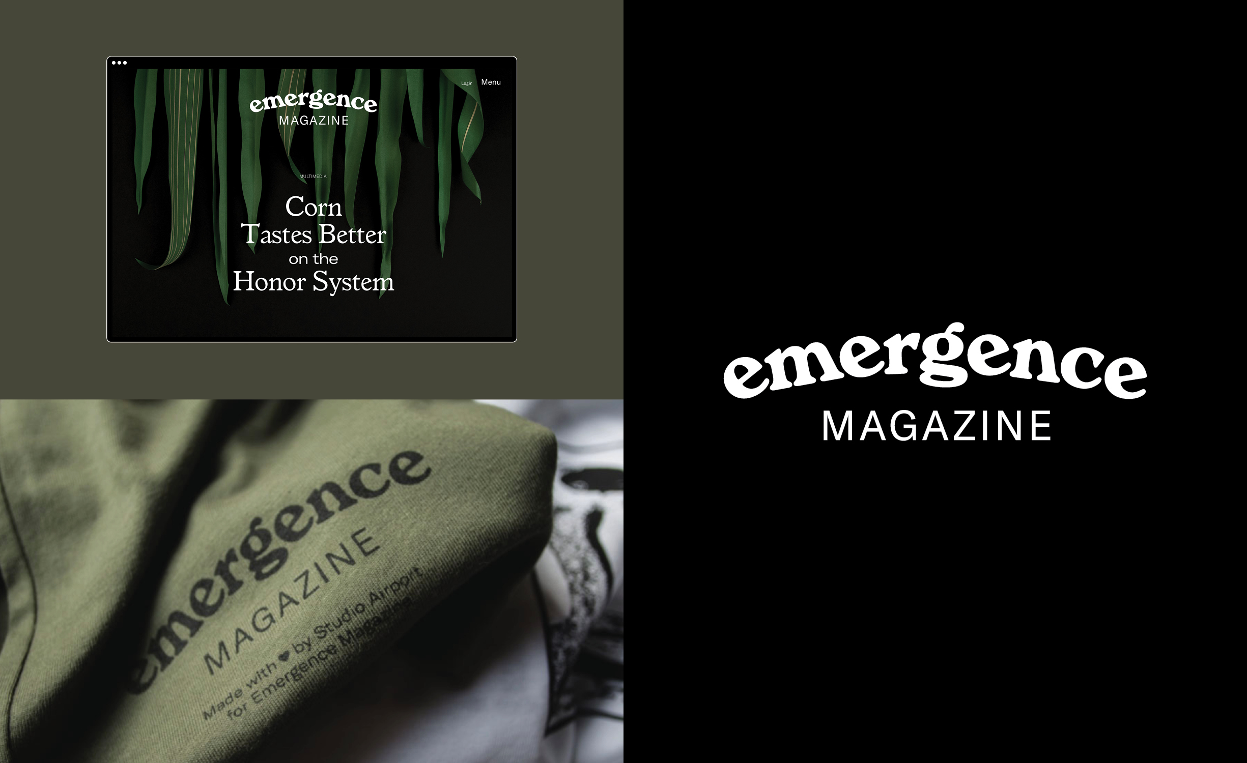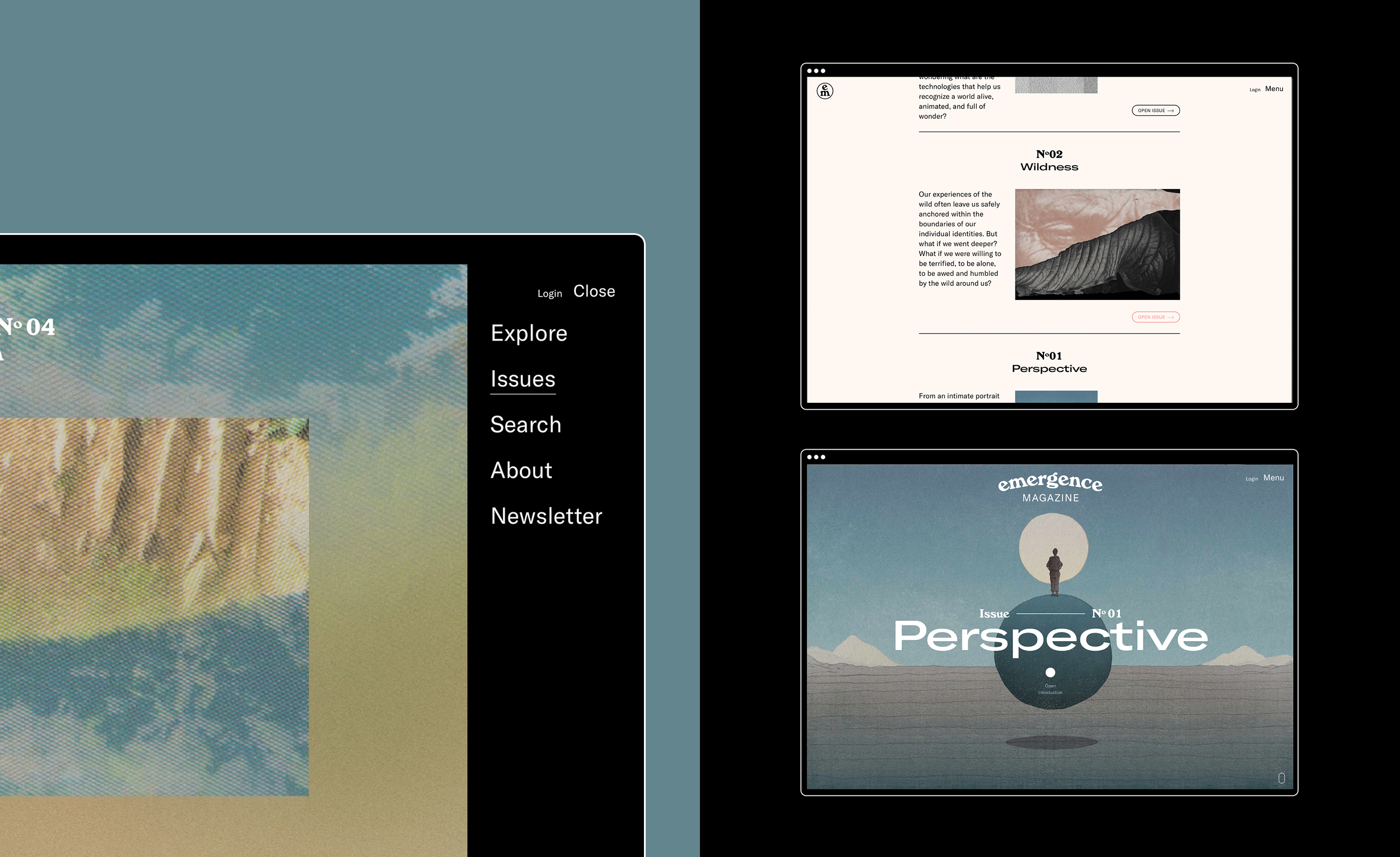 The design challenge for the visual identity of Emergence Magazine was to make sure it didn’t limit itself to a static style whilst remaining recognizable for its audience. The most important elements of this digital identity are its typefaces. For the minimalistic logotype the ‘Windsor’ is used and for the editorial design the ‘GT-America’, ‘Ogg’ and ‘Reckless’ form a playful combination. With this we combine the old and the new to provide levity and warmth to the designs without needing to drive the entire aesthetic.