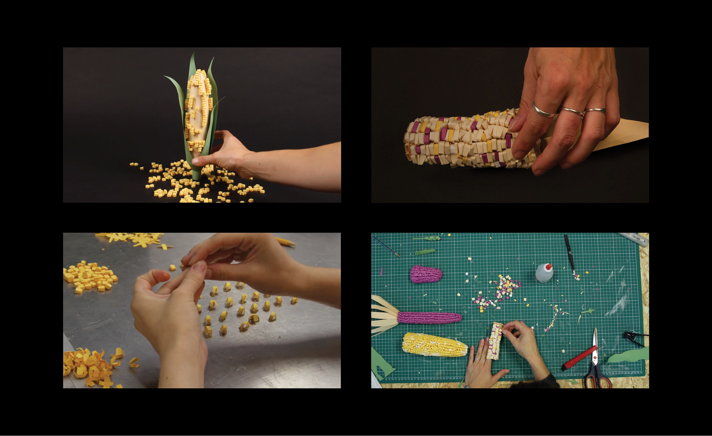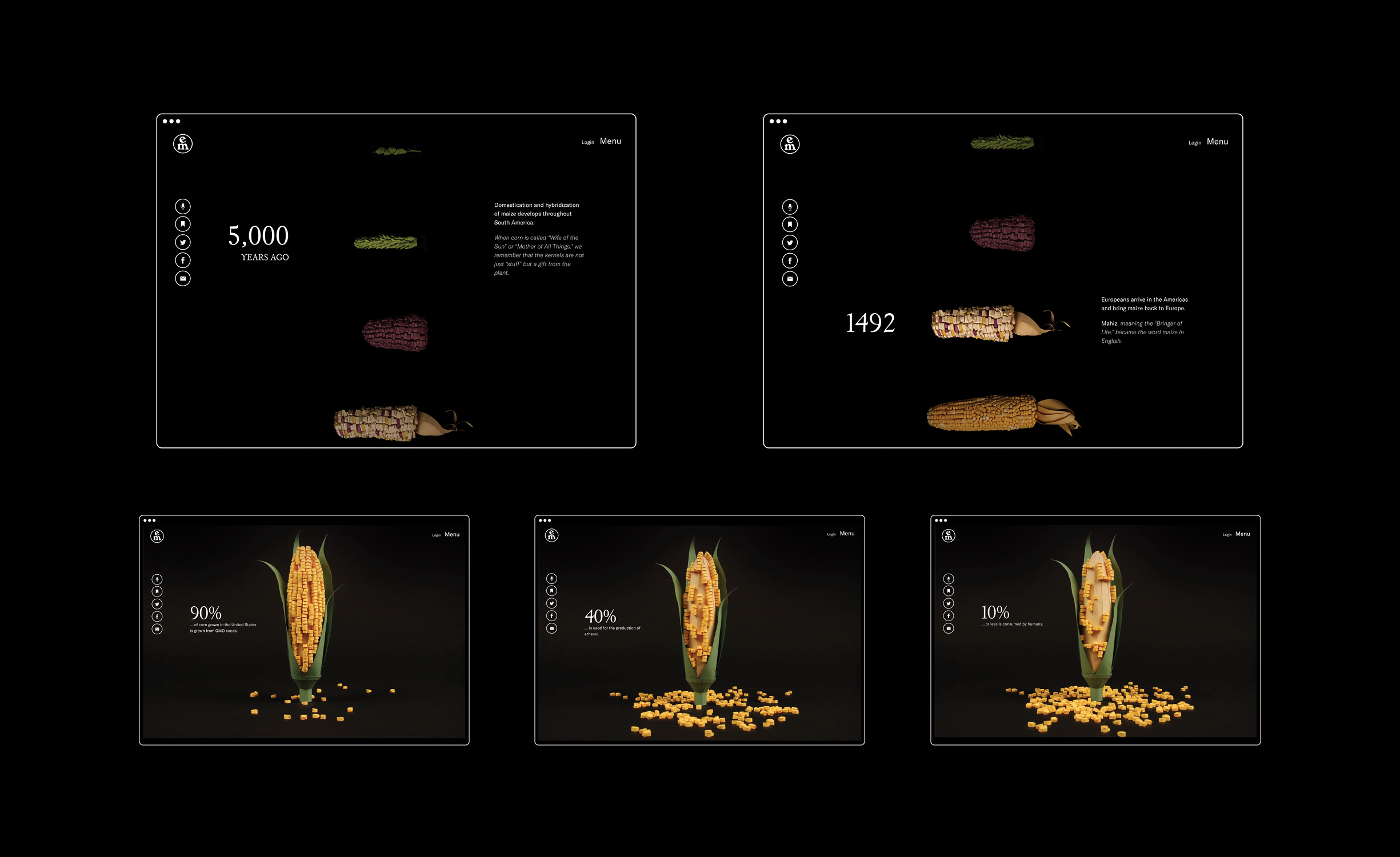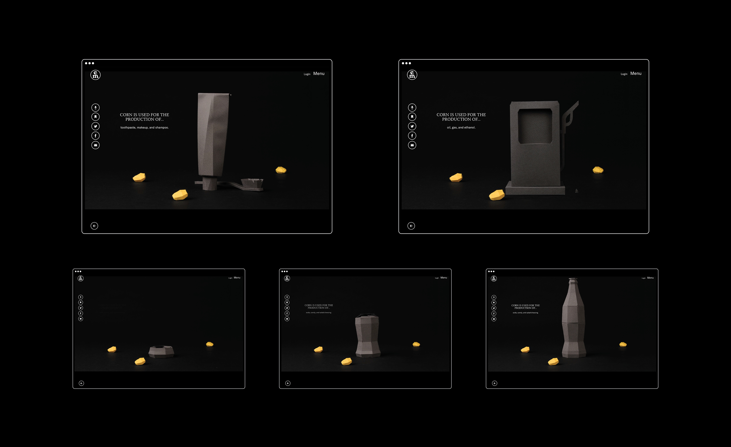To embrace the beauty of the maize seeds we choose to make a digital scans of them on 3000dpi. The result are highly detailed images in which you can almost feel the texture. For the formal infographics we choose to use use paper as the main material to emphasize the tension between the natural and the artificial. Is the corn produced in the modern way still natural? The choice for polygon models also amplifies this matter. For the rest of the design we choose to keep it as minimal as possible so the numbers/facts stand out clearly and communicate straight to the reader.