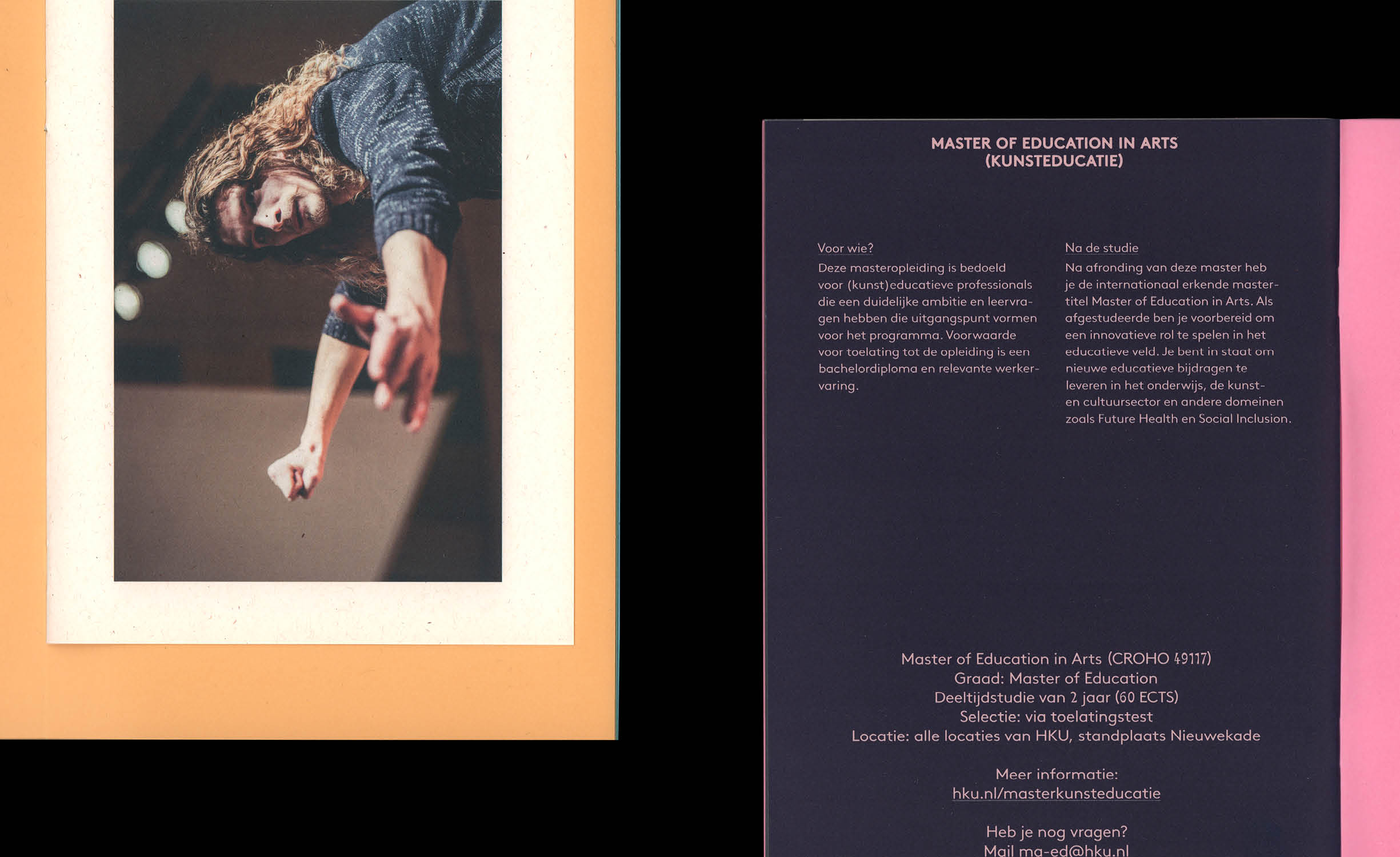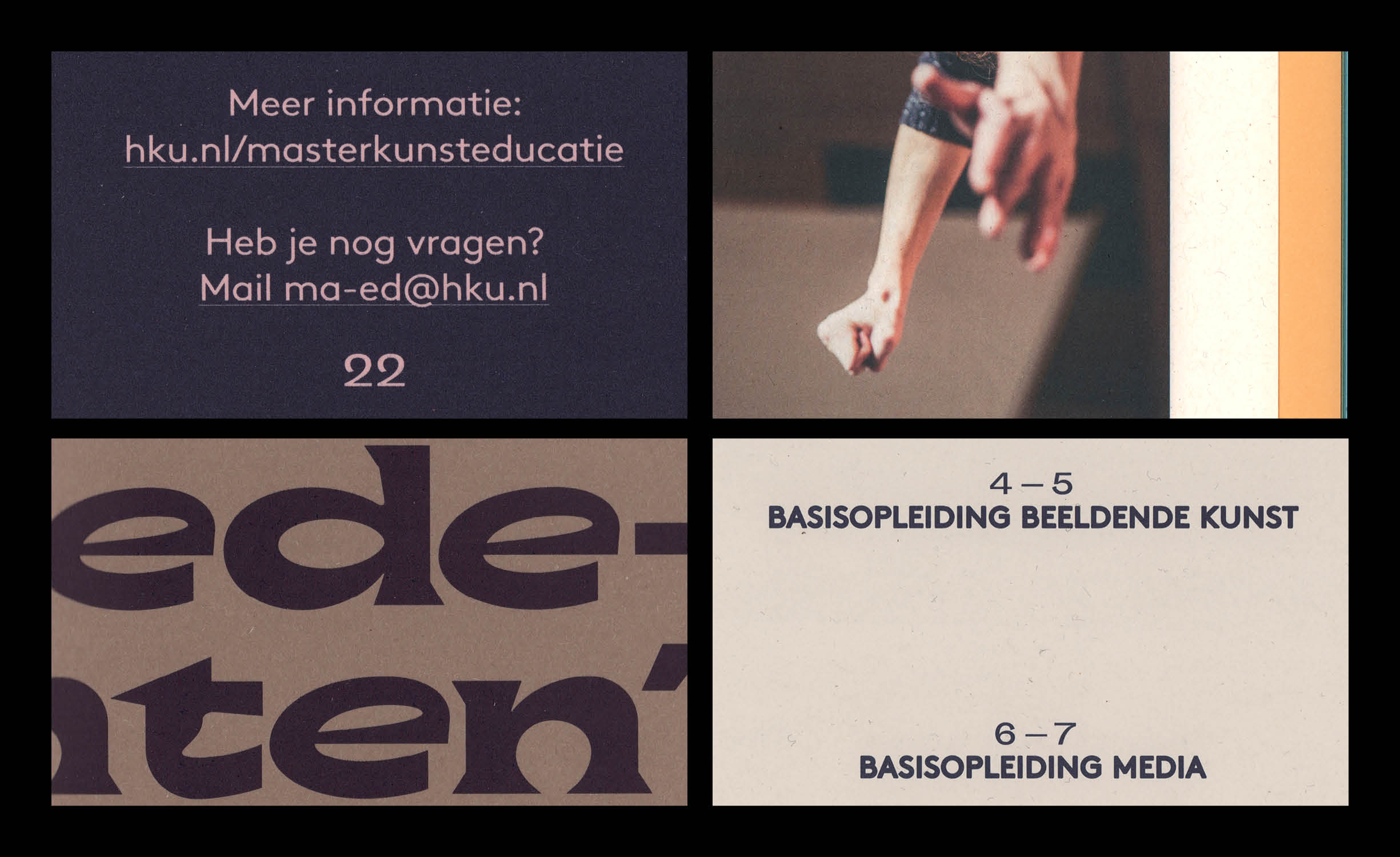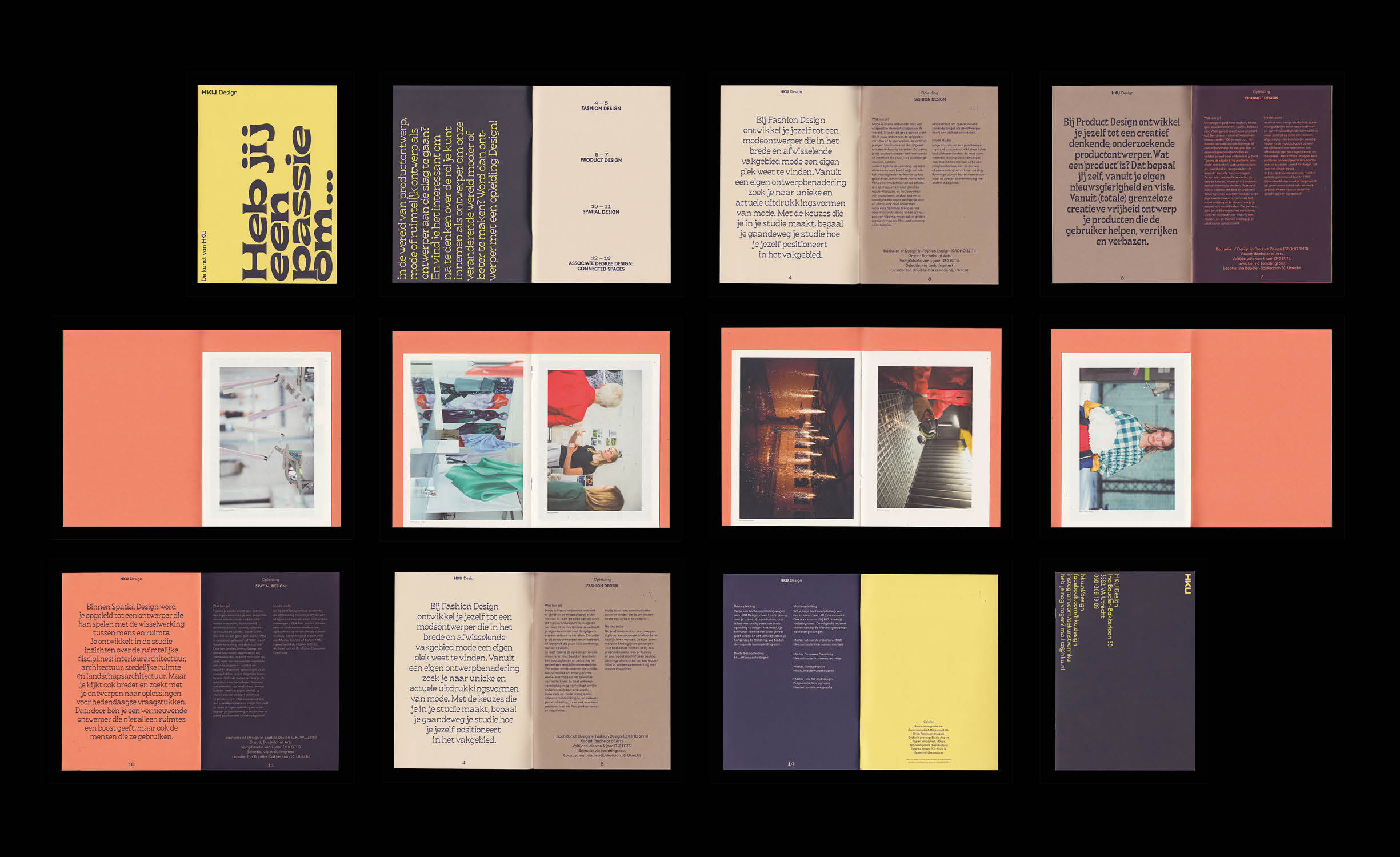 We created a series of information booklets for prospective students applying to HKU. As one of the largest art institutes in Europe, it was essential to create a brochure system that included all the diverse courses, as well as being easily understandable. Each booklet has a quote on the cover which speaks directly to the student, this quote continues and takes you immediately to the index page, from here information about that particular course is presented. The BB book font family was chosen as the character styles are wiggly and playful, it is implemented in the more informal, persuasive content such as the cover quote.