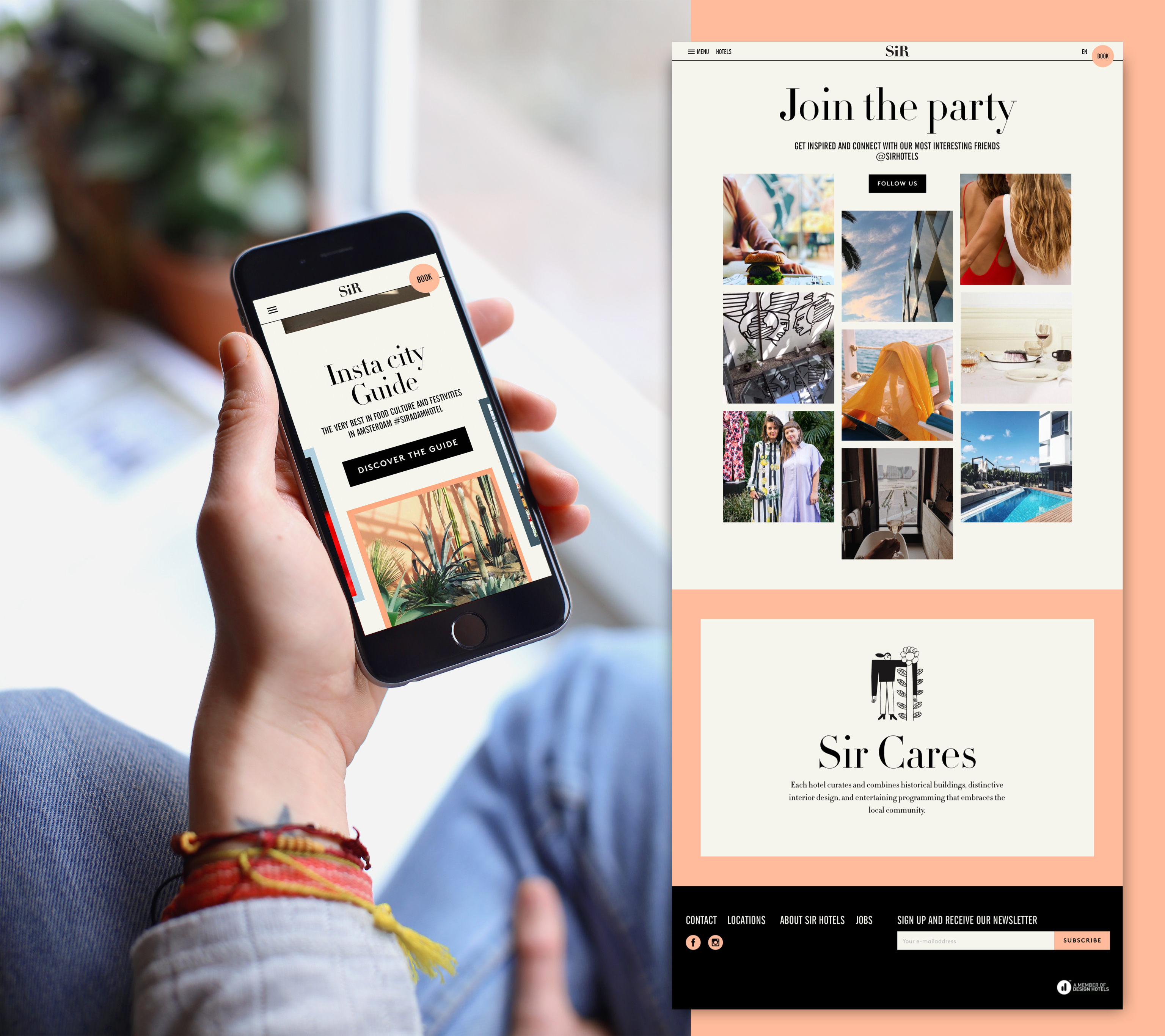 Sir has different marketing and branding angles to bring the most important elements of the hotel into the public’s awareness. Guests receive relevant information and content via the right touchpoints. The site connects these channels. For example, the Sir City Guide and the Sir Blog are used to make guests curious about the city in question. We want to enlighten our guests by showing them our favourite spots; from restaurants and clubs to museums and shops. This way we bring the world of Instagram closer to our guests.