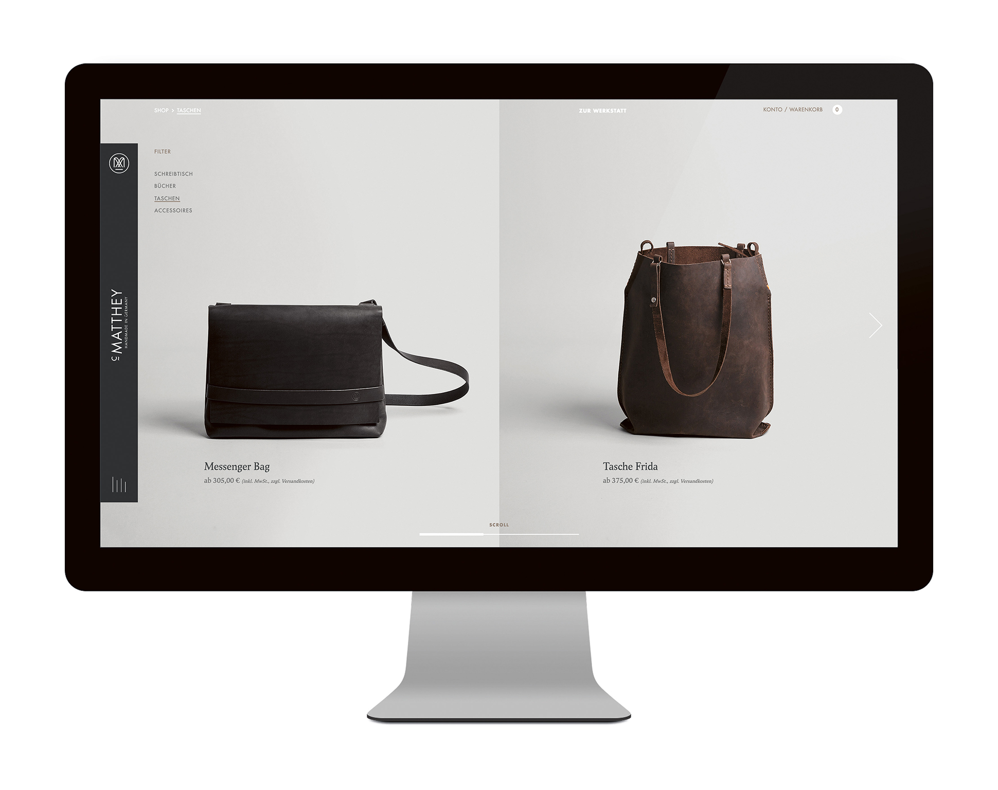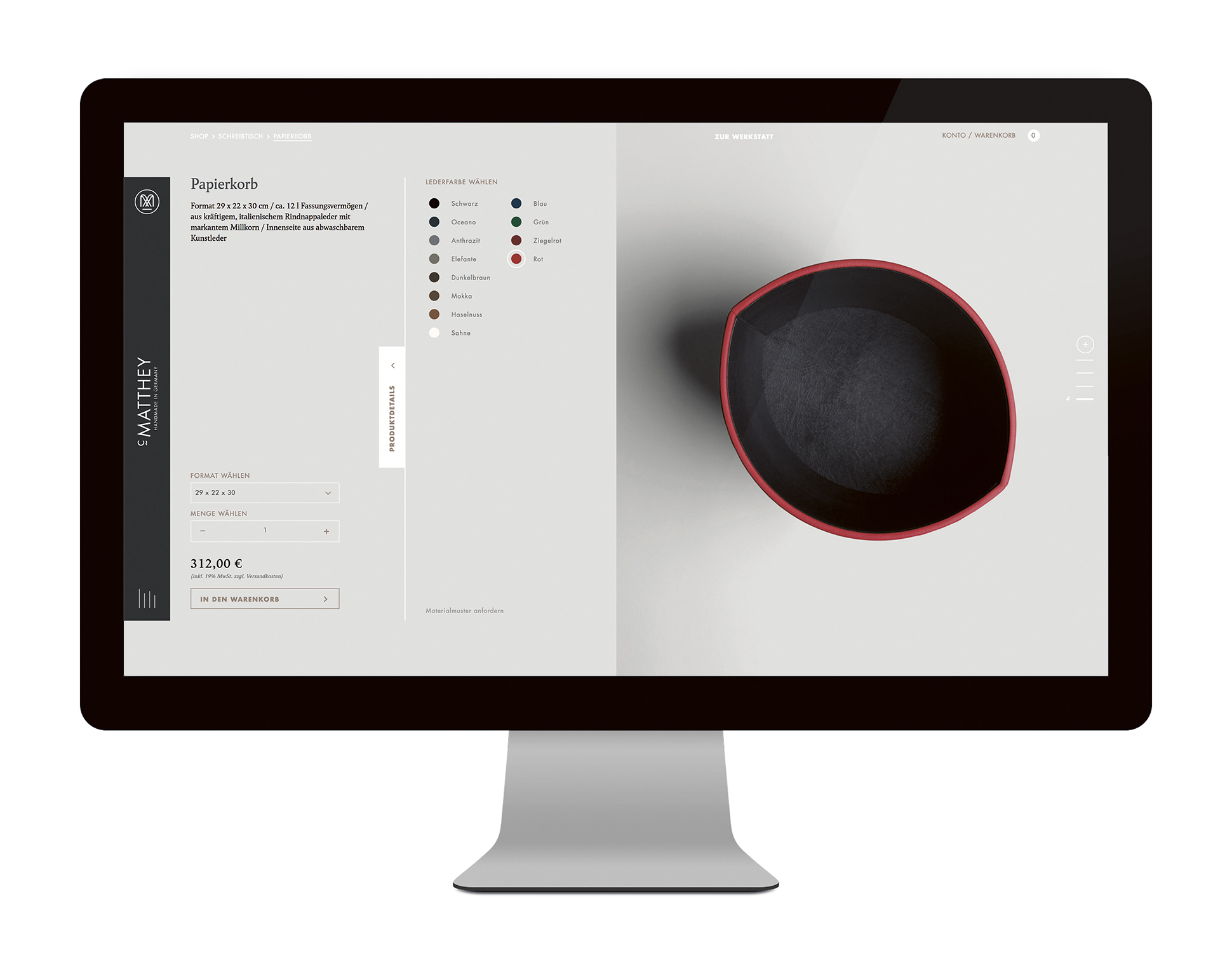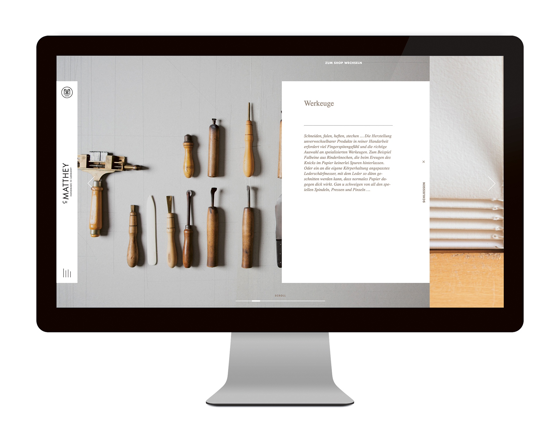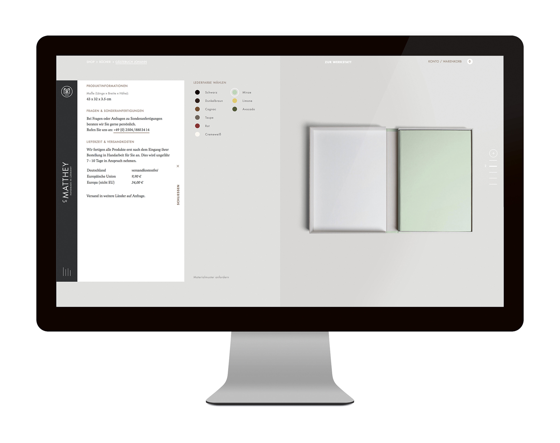 The concept for the entire digital brand management takes up the idea of deceleration and individual value and combines this in the user guidance with the classic, familiar movement of turning pages from the world of books. The initially unusual usability nevertheless guides the visitor quickly and intuitively through the page and at the same time positions the brand clearly away from the mainstream. For the shop, the products are individually photographed in a specially developed visual language and depicted in all colours; a configurator is available for the embossing. The customer already receives a picture of the product to be produced that is as accurate as possible online.