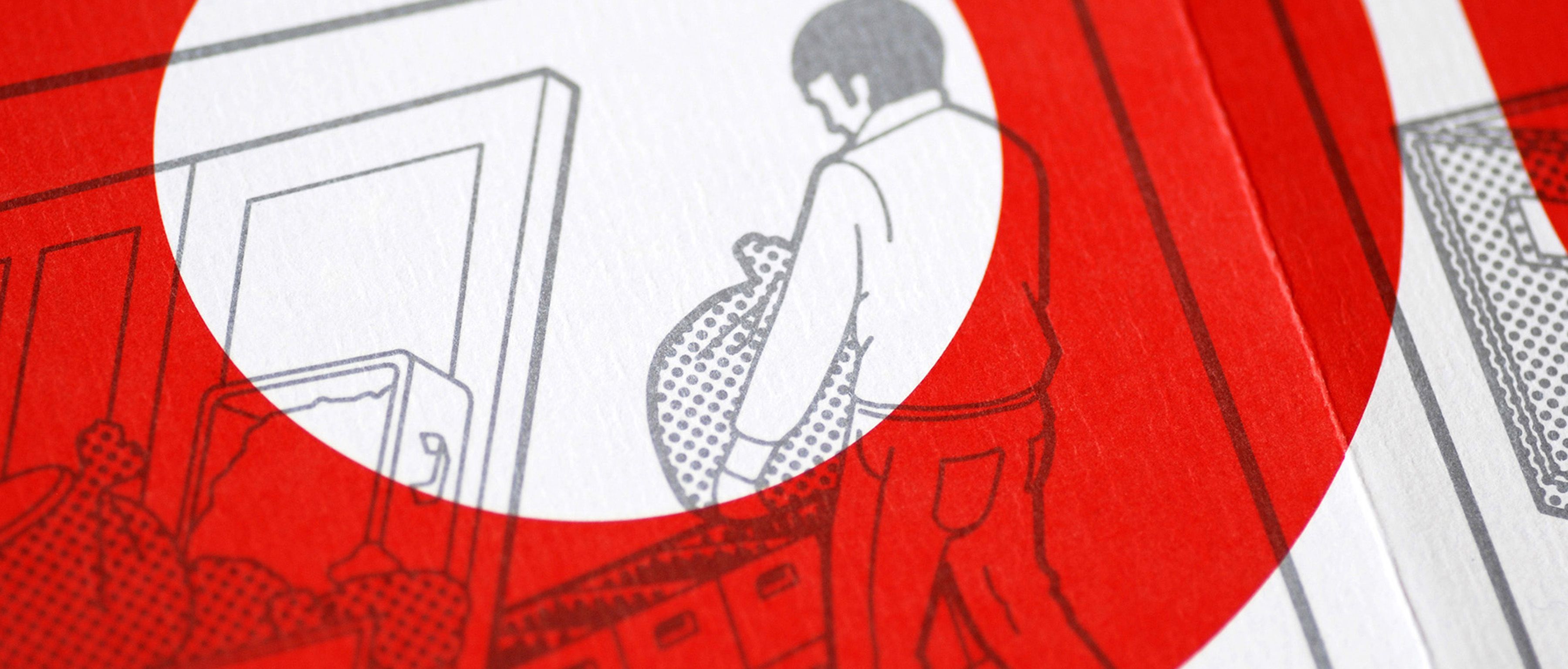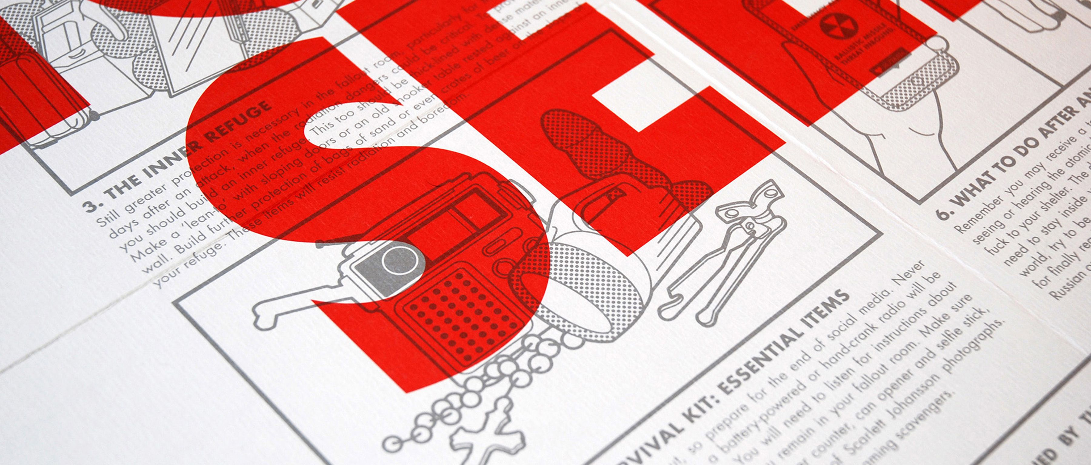 HIDE YOUR SELF is a parody of public information campaigns published during the Cold War, which encouraged citizens to build fallout shelters and stock emergency supplies. The black humour behind the illustrations and the witty copywriting combine to make a poster that is both gloomy and hilarious in equal measure. Every home should have one.