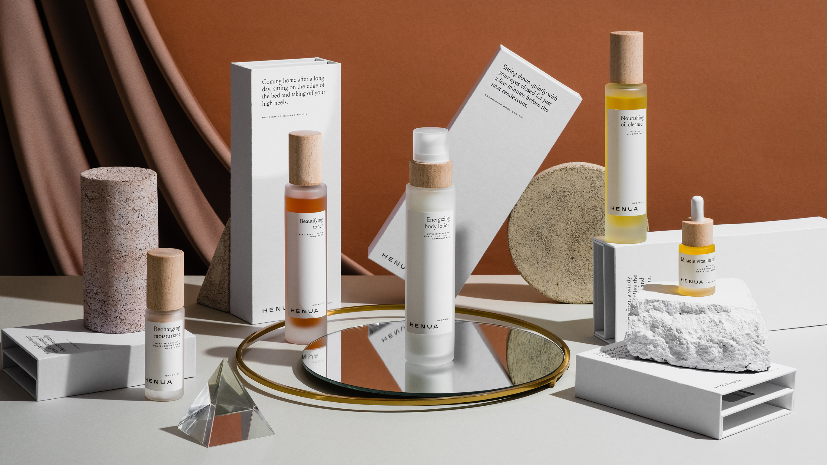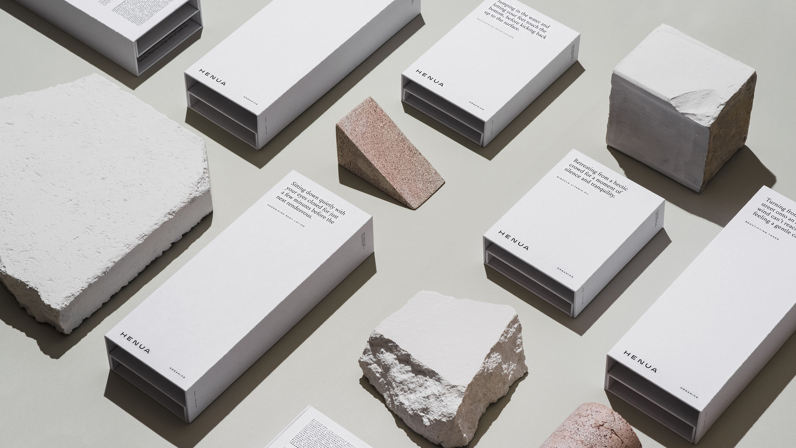 ‘Henua’ is a Finnish word, meaning the exclusive feeling of being in total harmony with yourself and the surrounding world – the most luxurious of all feelings. We created a packaging concept to support this idea of fleeting sensations of inner comfort. Each product has its own ‘Henua moment’ which is loosely linked to the product’s function.