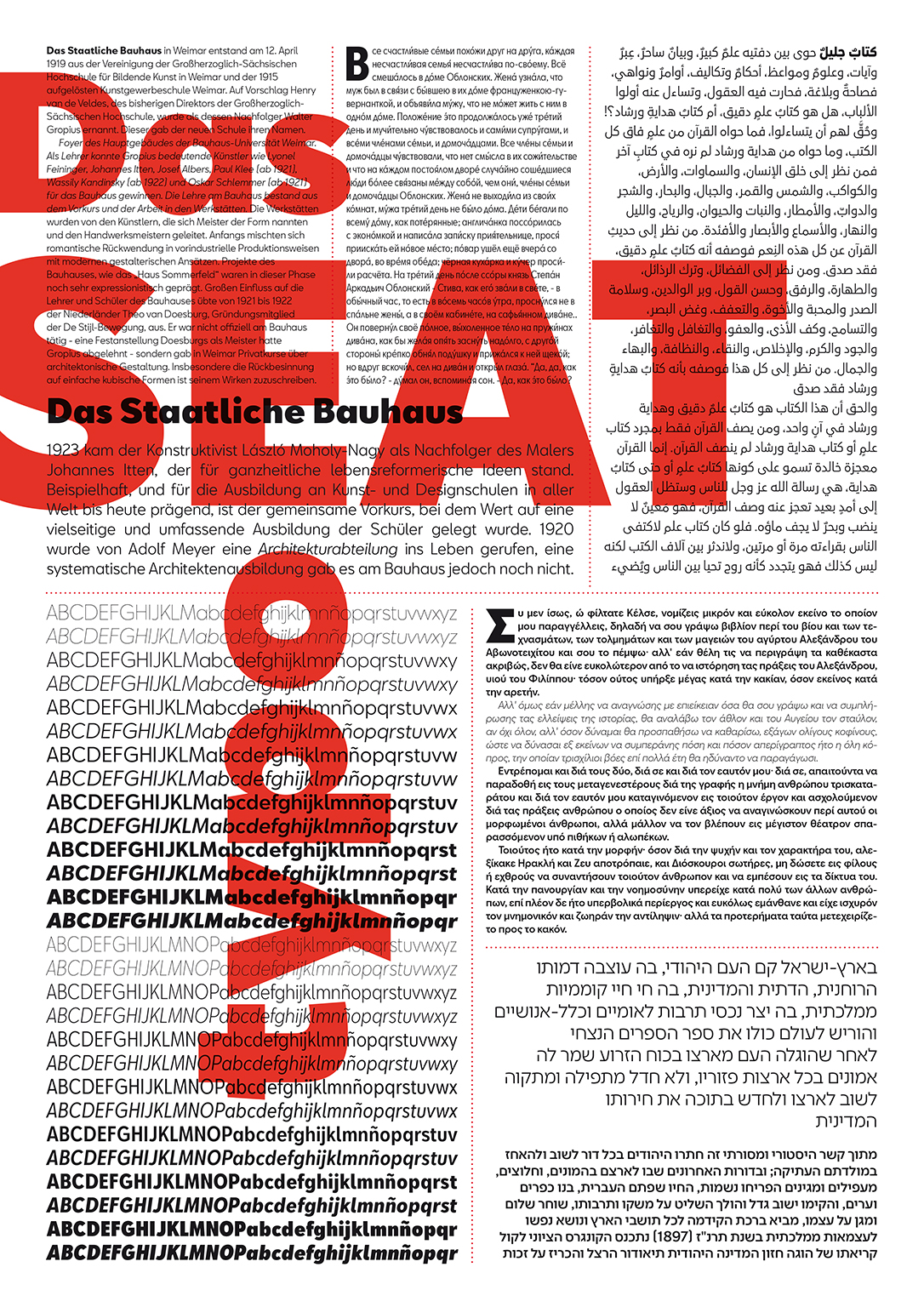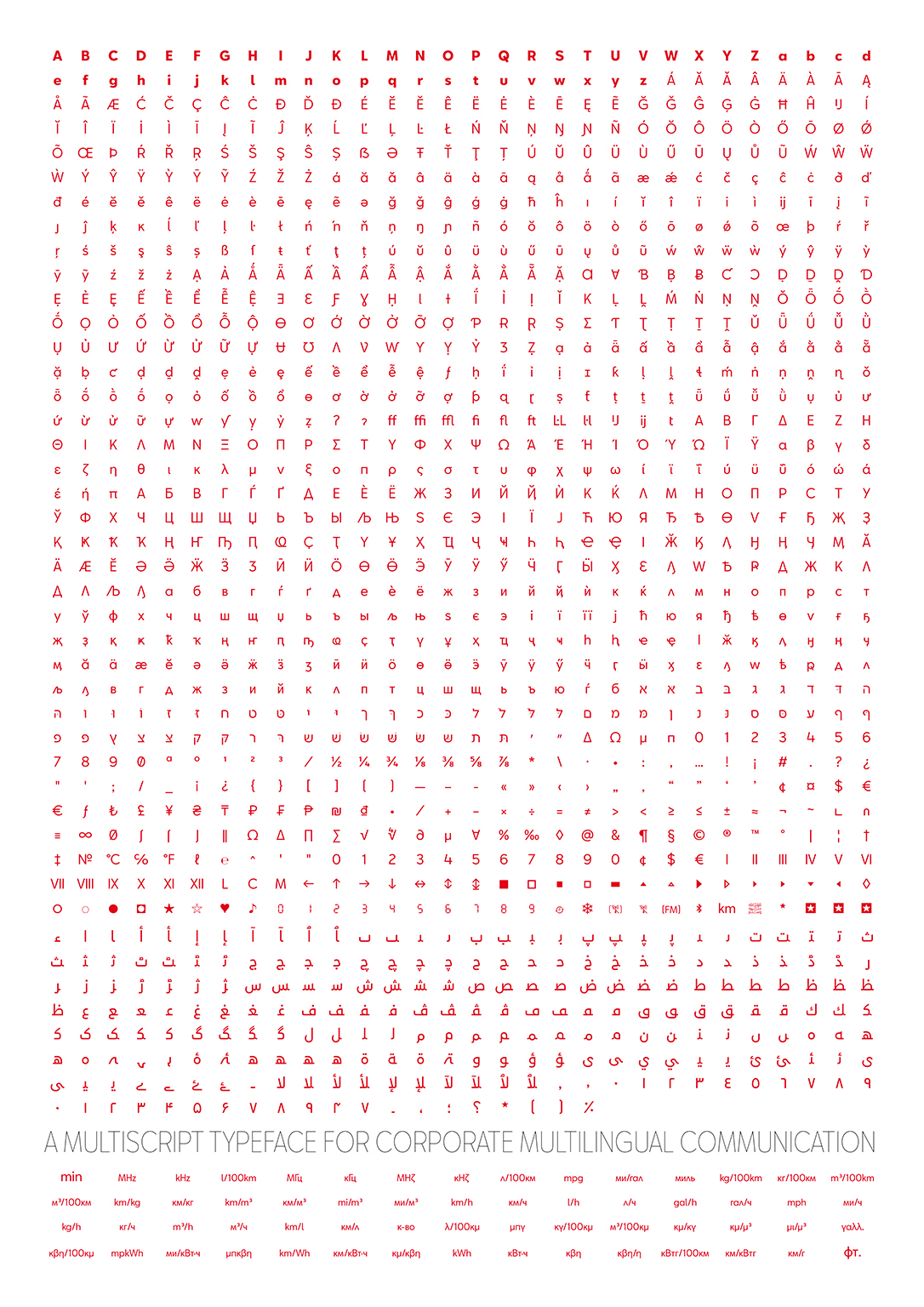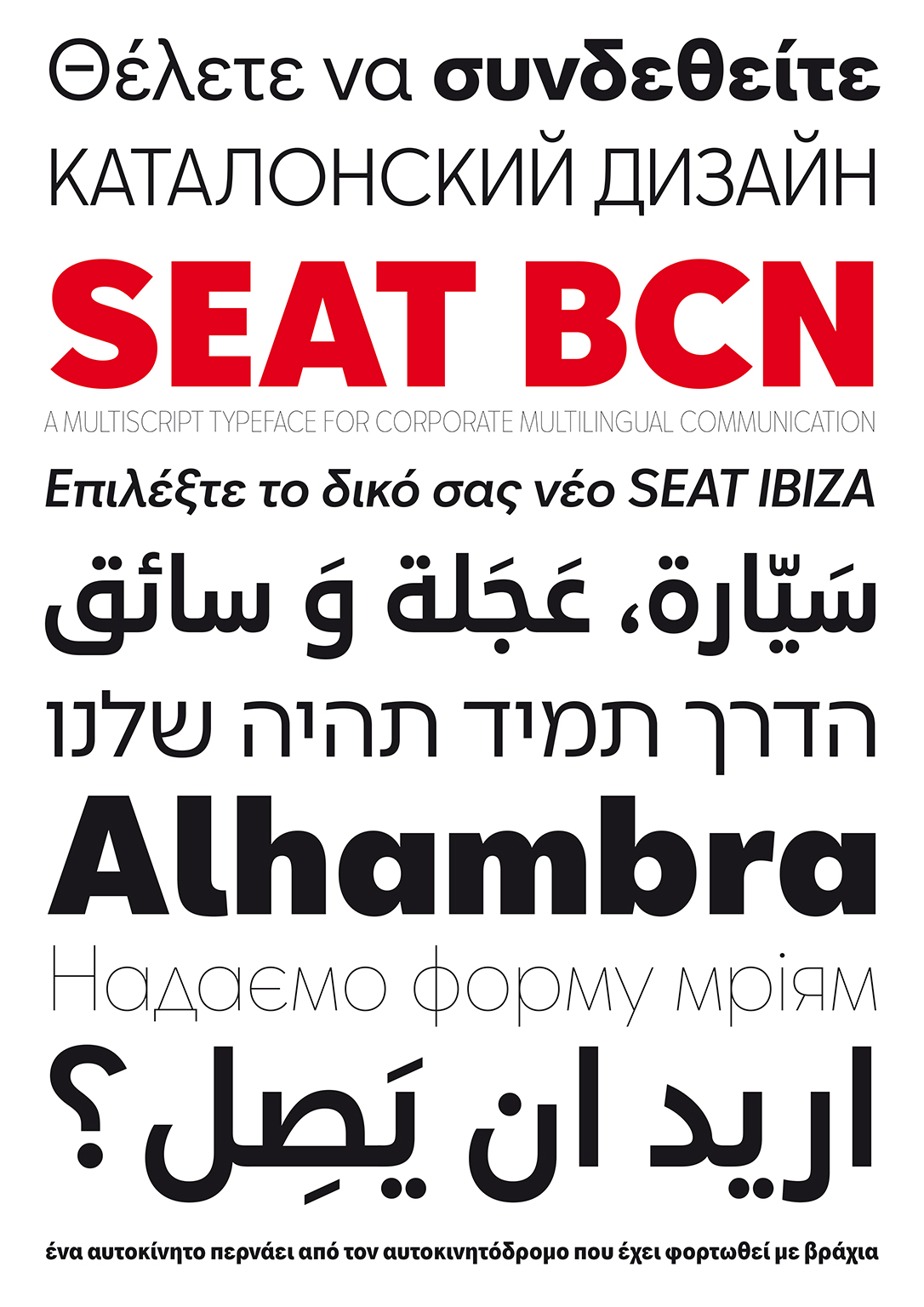 SEAT BCN is a corporate type design family designed for SEAT (car brand company) for multilingual text composition. The family includes 28 styles and 5 scripts: Latin, Cyrillic, Greek, Hebrew and Arabic.