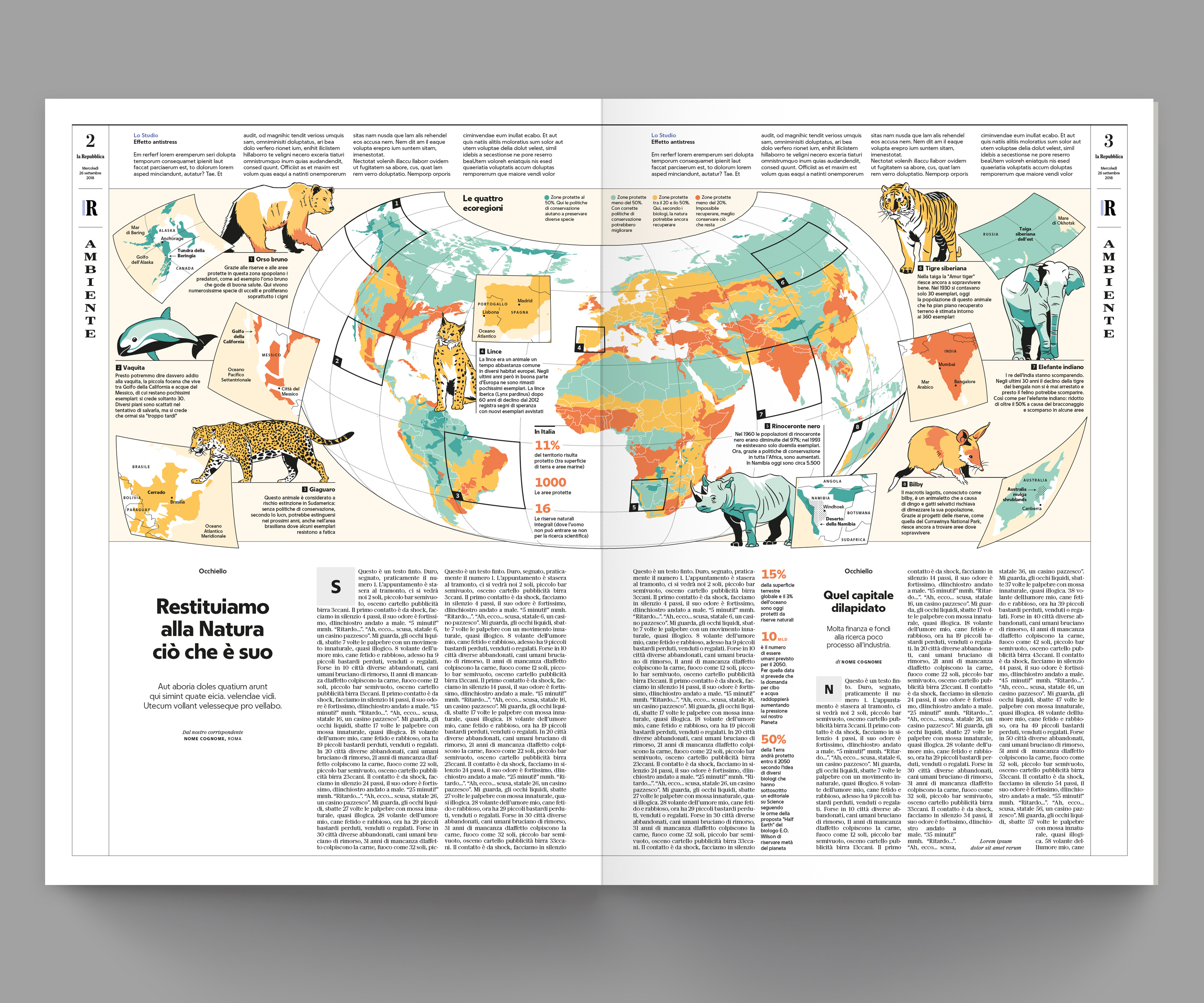 The same style and colour schemes are used to give uniformity to the cover and the opening spread, where the cover story unravels. Illustrated spots and infographics help visualising the information in a style that matches the accessible tone of the texts.